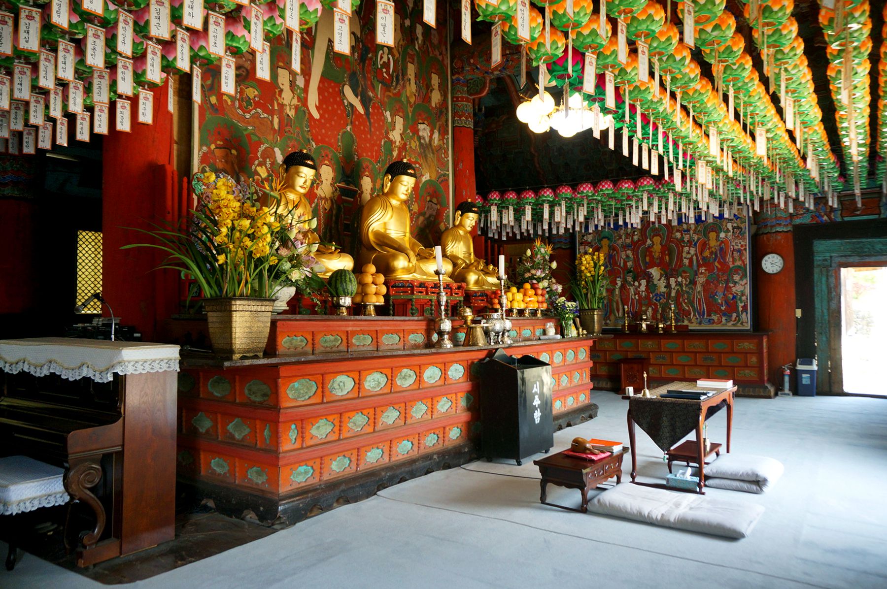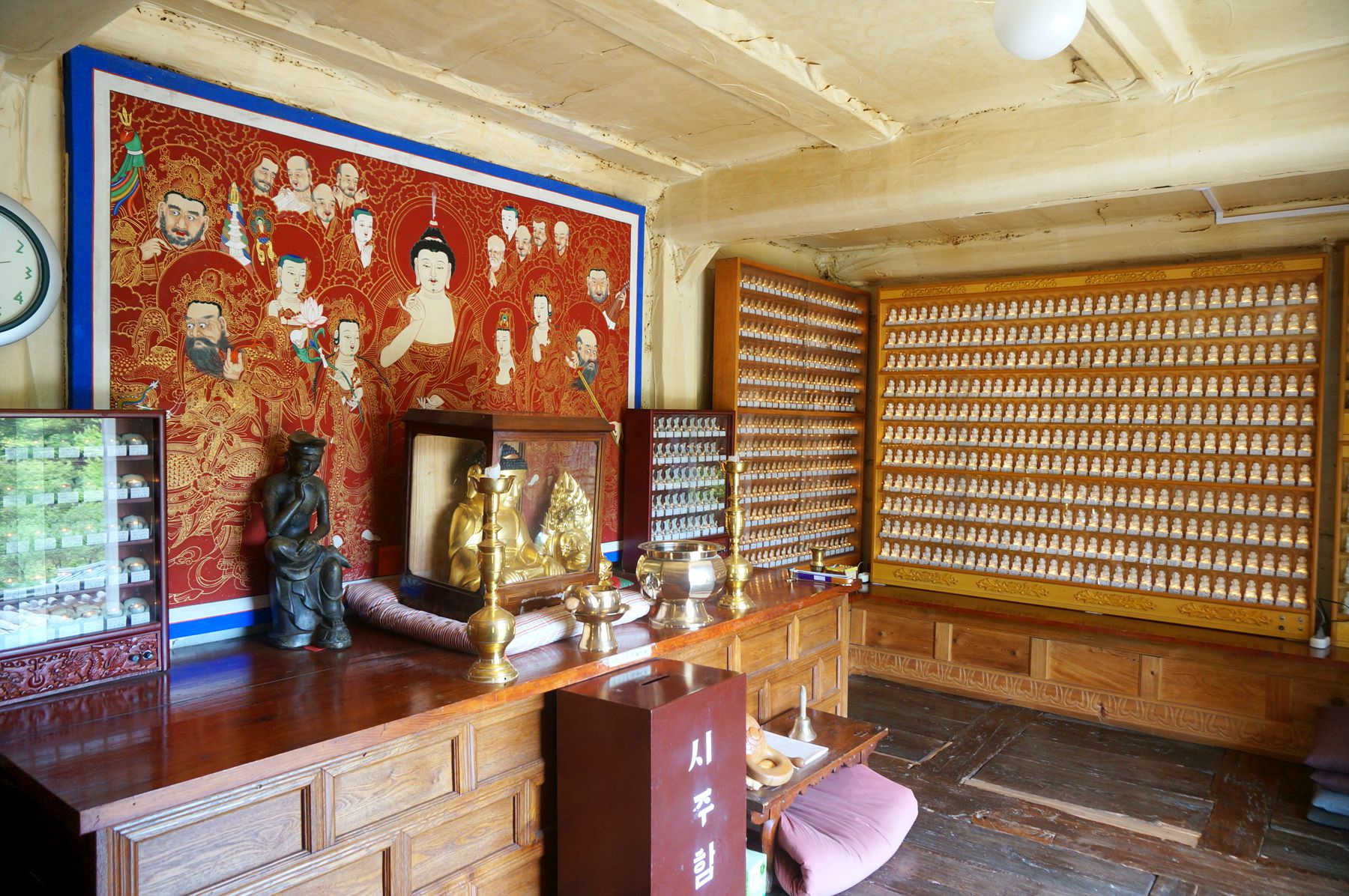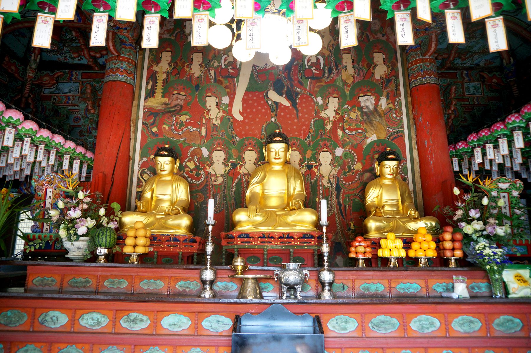 대웅전에는 1644년 조성된 천장, 지장, 지지, 보살상을 묘사한 삼장탱화와 삼존불이 봉안되어 있습니다.
