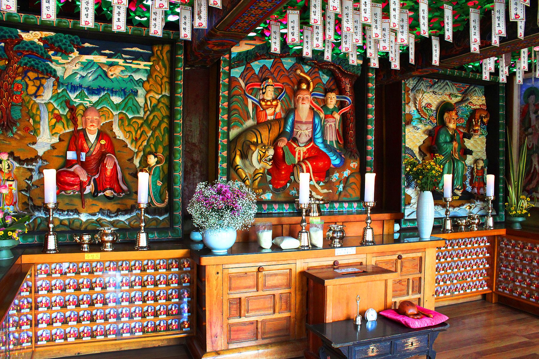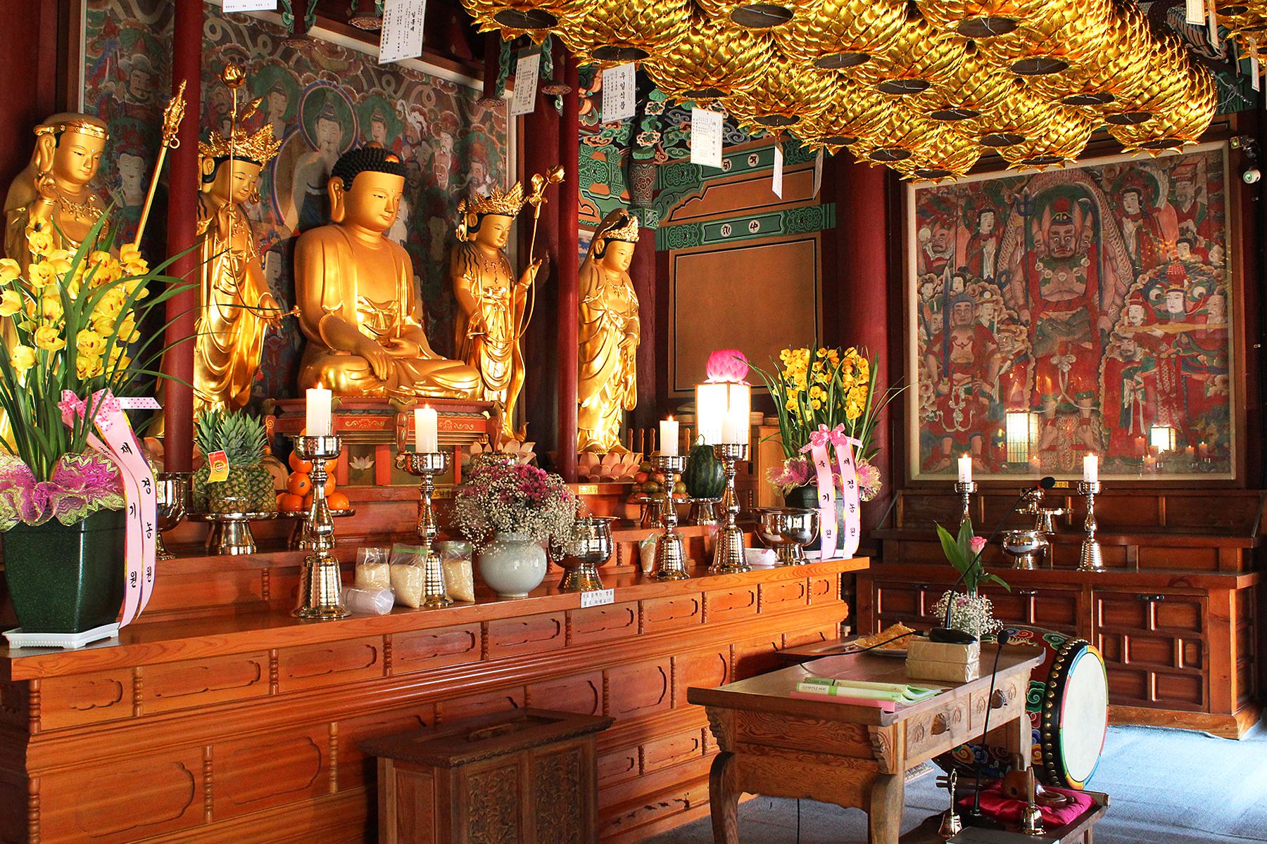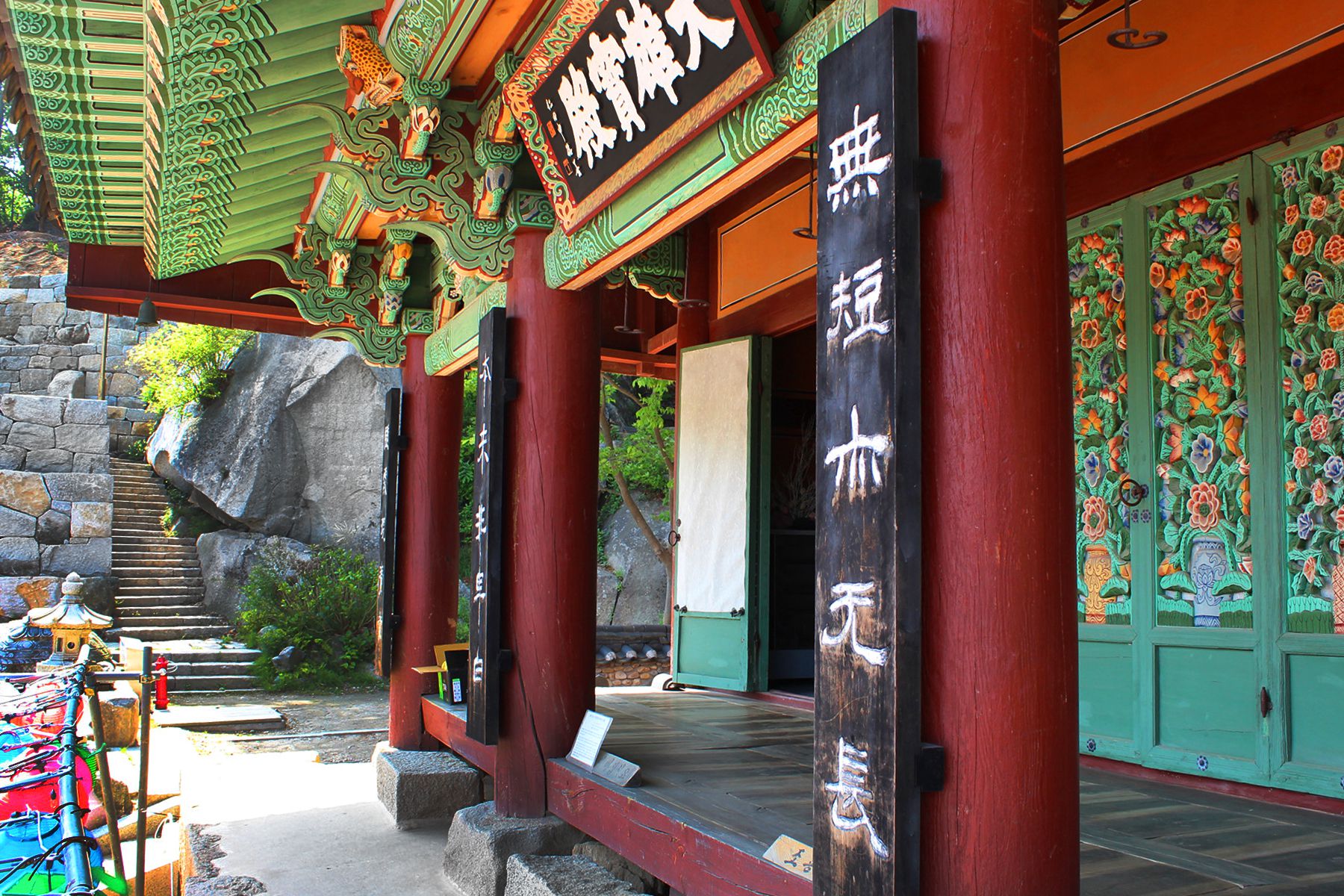 대웅보전 정면 가운데 사분합문은 화병 속에 담긴 모란과 연꽃으로 화려하게 장식되어 보기 드문 장식을 하고 있습니다.