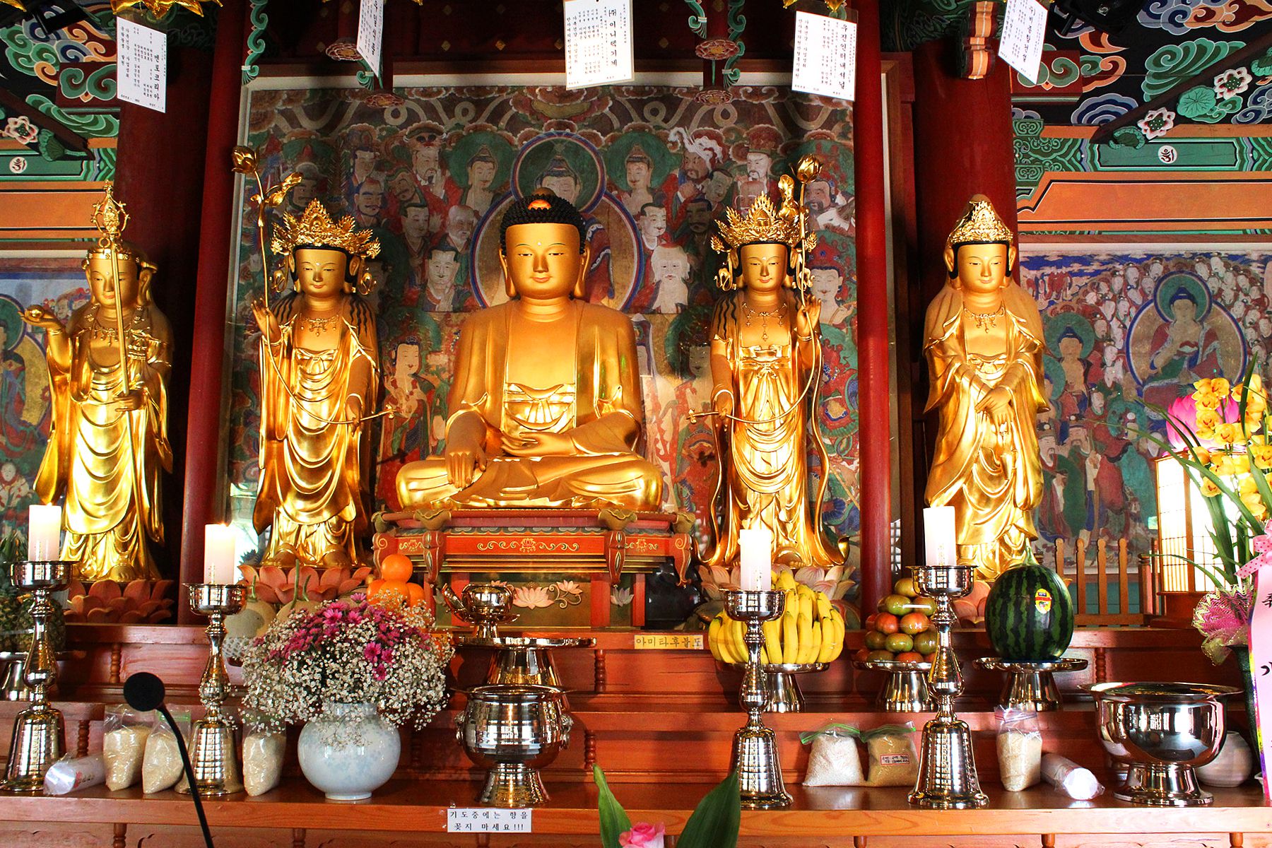대웅보전에는 지장보살, 보현보살, 석가모니불, 문수보살, 관음보살과 아미나후불탱화가 모셔져 있습니다.