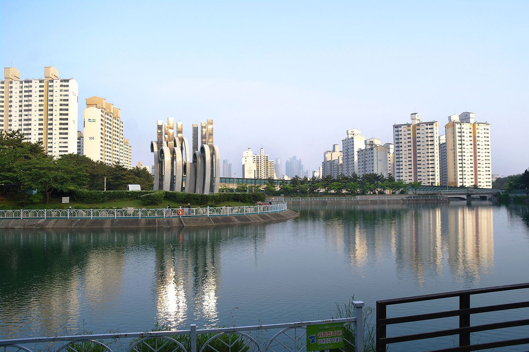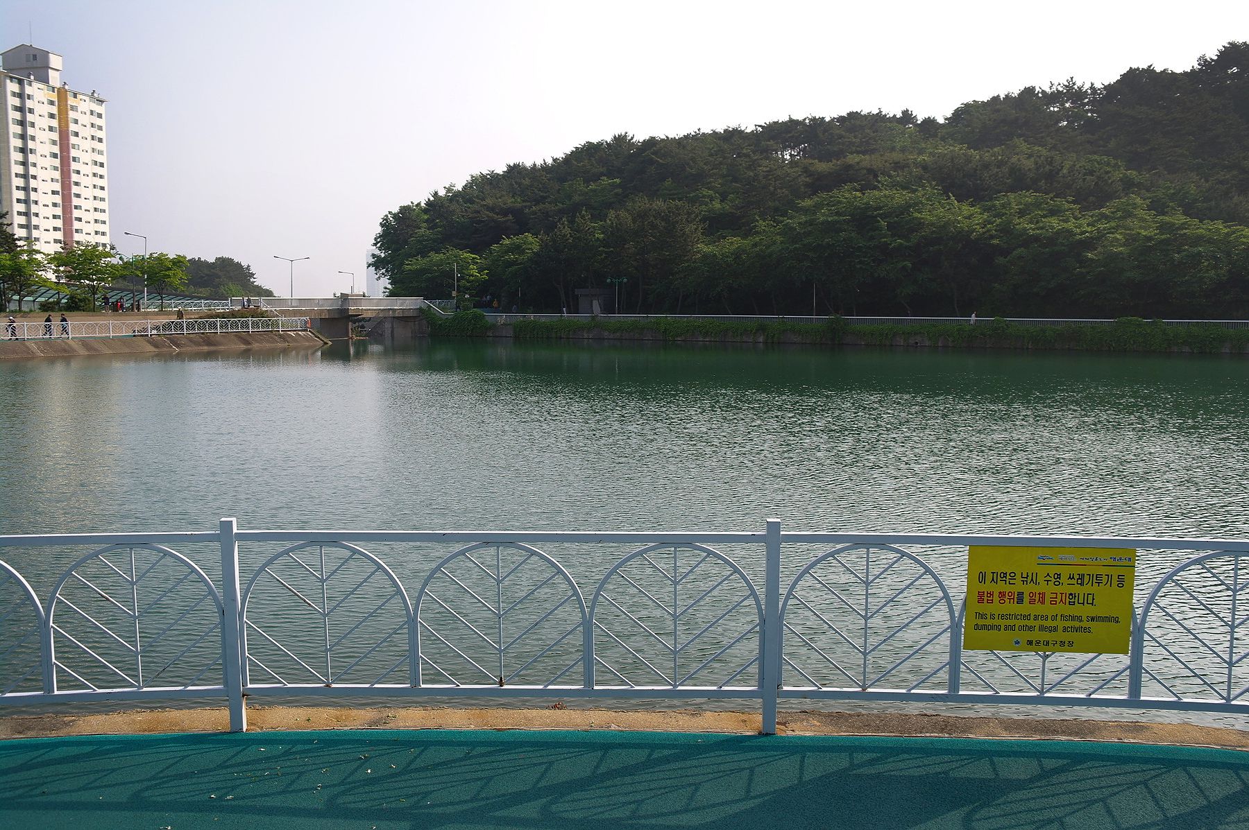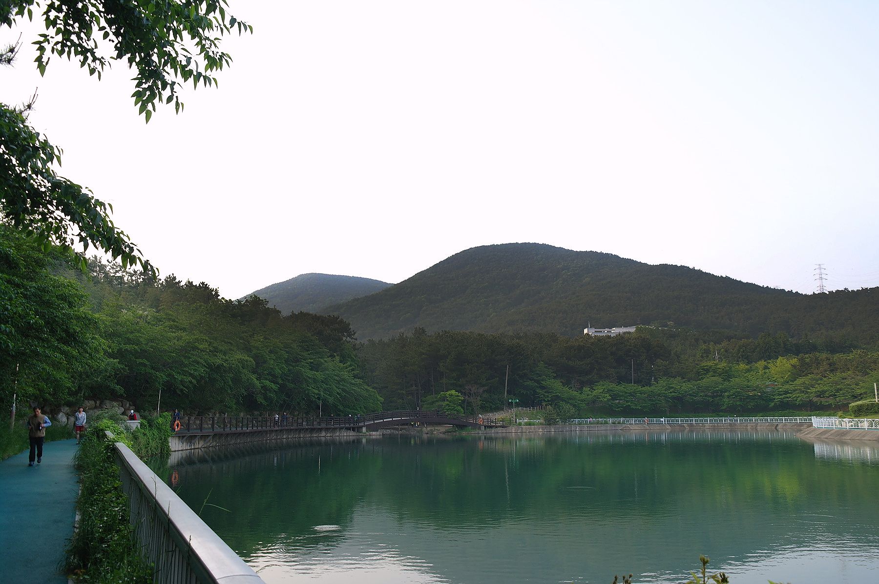 호수의 반은 아파트가 빼곡한 도심지의 풍경이, 그리고 나머지 반은 수려한 장산의 수림대의 풍경이 펼쳐진 이색적인 경관으로