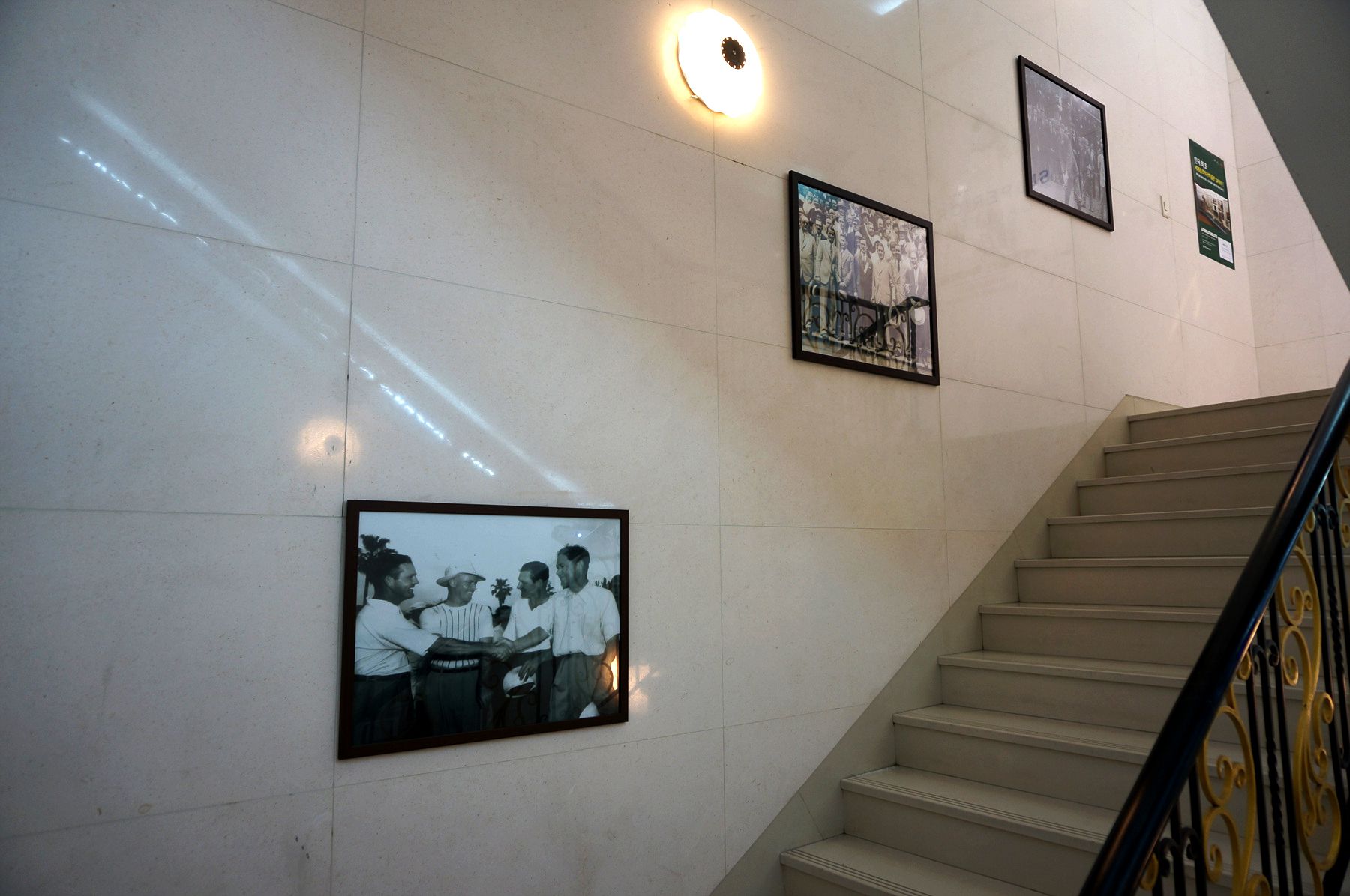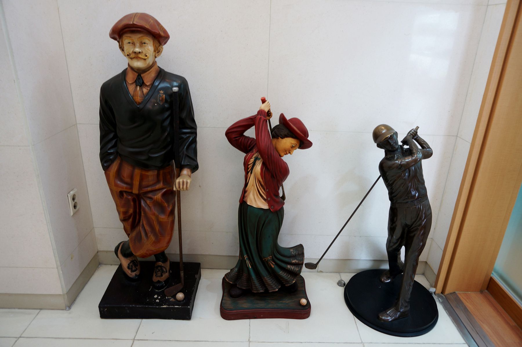 계단을 내려가면서 만나는 골프 역사 사진과 입구에 서 있는 골프 관련 모형들로