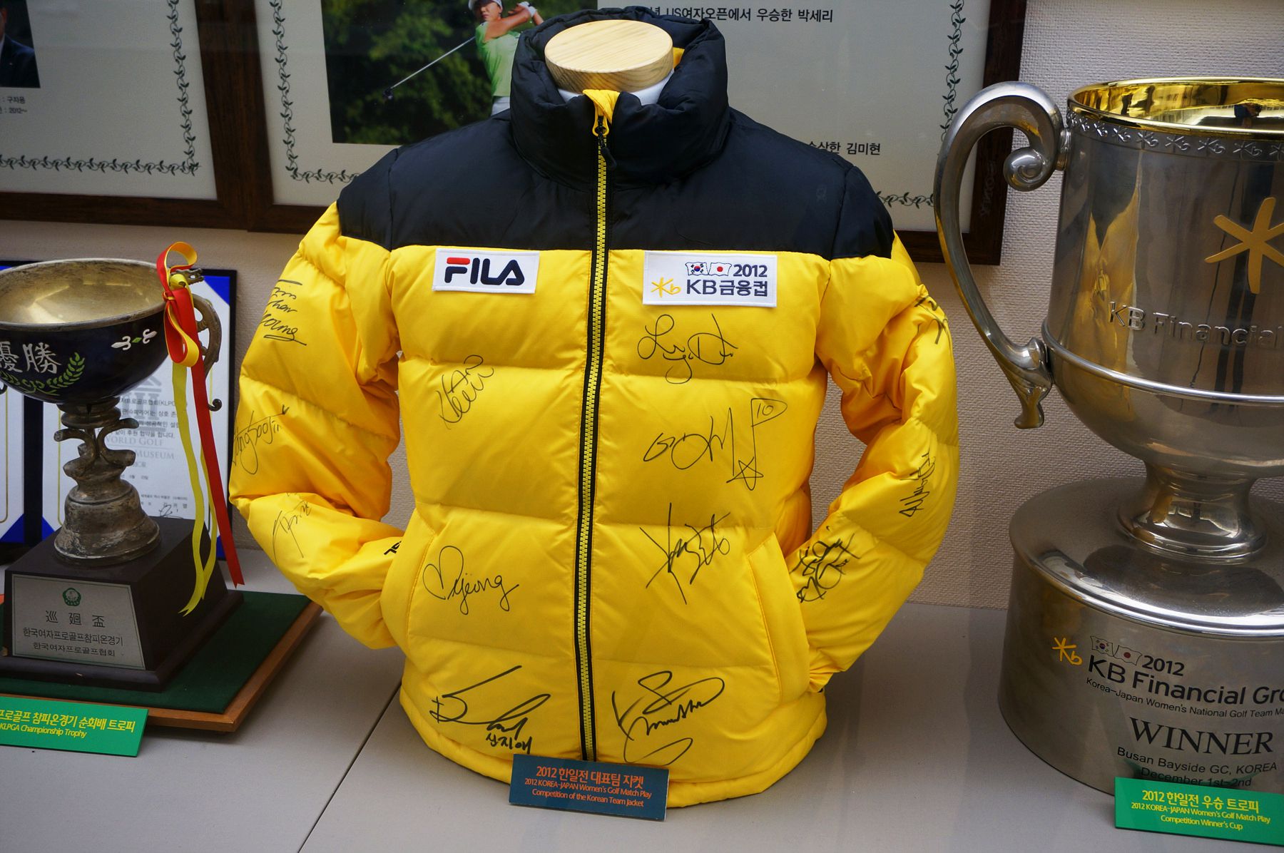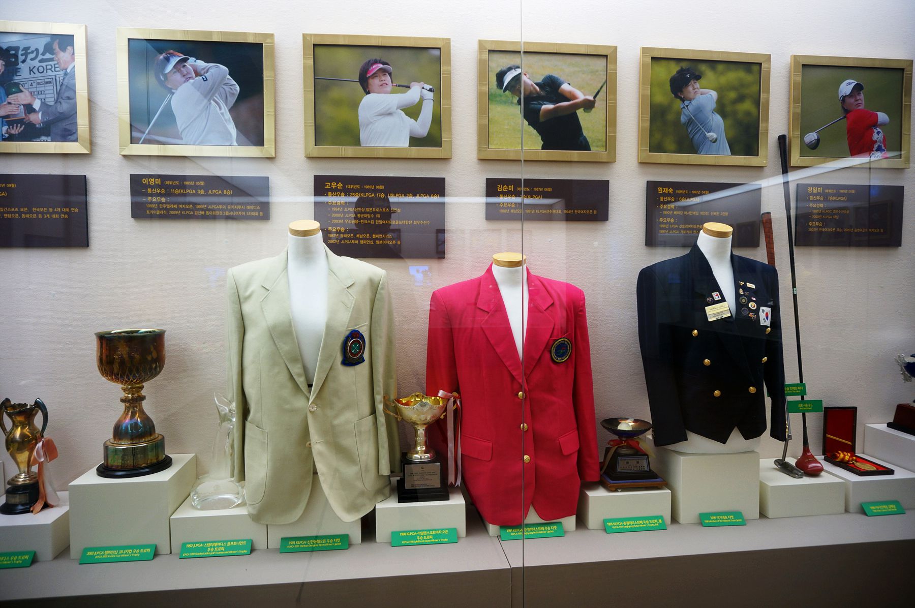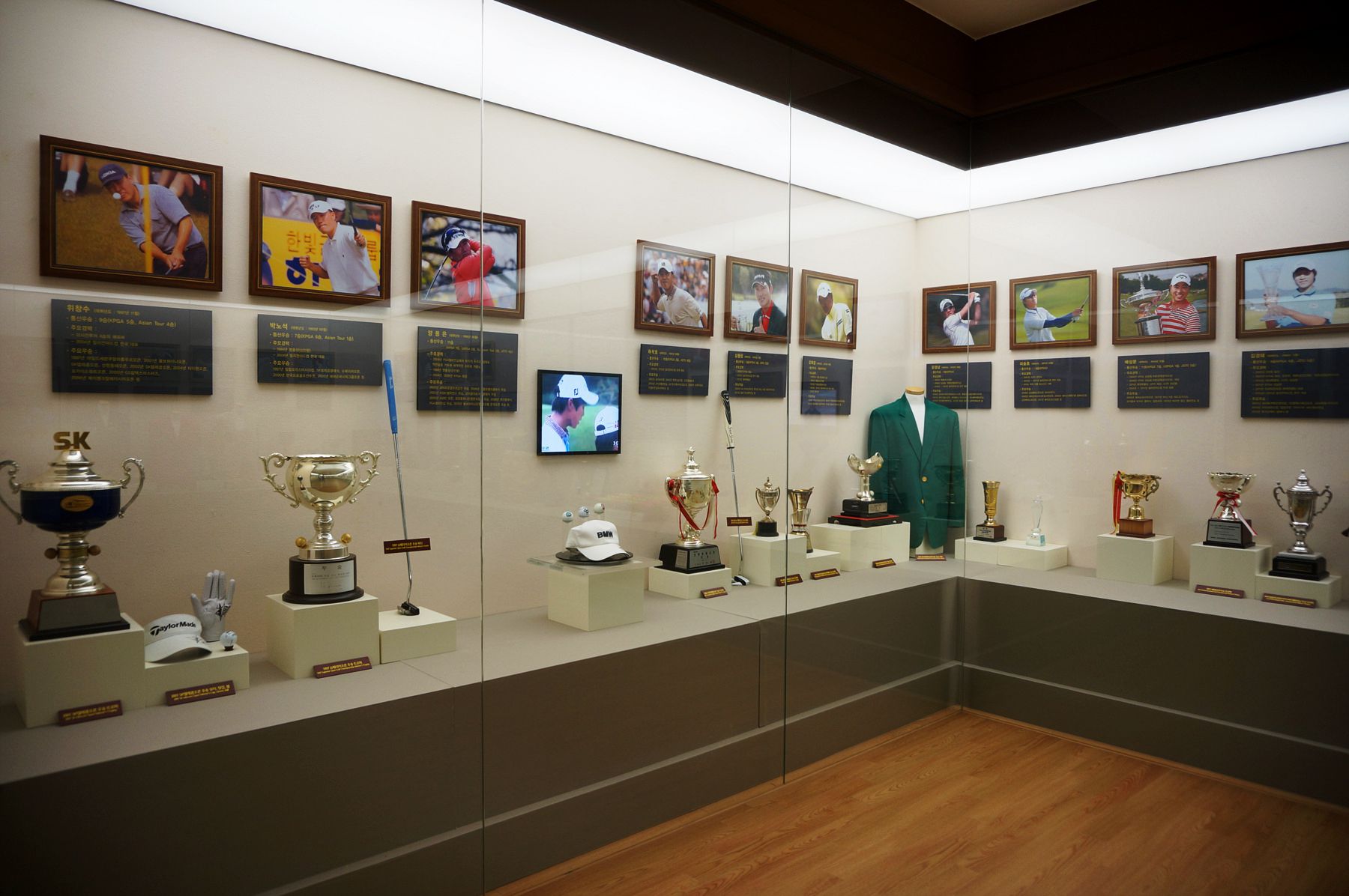각종 골프 대회에 참가했던 선수들의 트로피와 재킷, 골프공 등 다양한 기념품이 전시되어 있습니다.