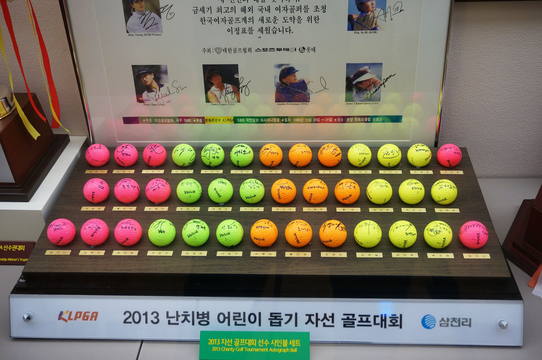난치병 어린이들을 돕기 위한 자선골프 대회를 한 KLPGA 선수들의 사인볼도 볼 수 있습니다.