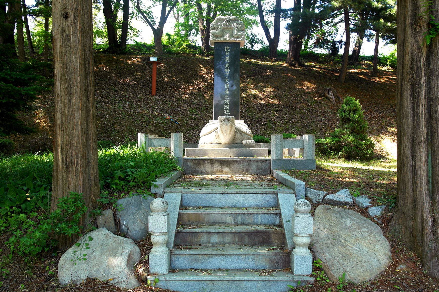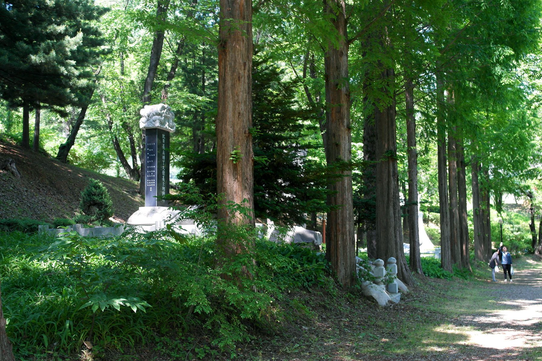 곧게 자라는 나무들 사이에 충절비들이 자리하고 있습니다.