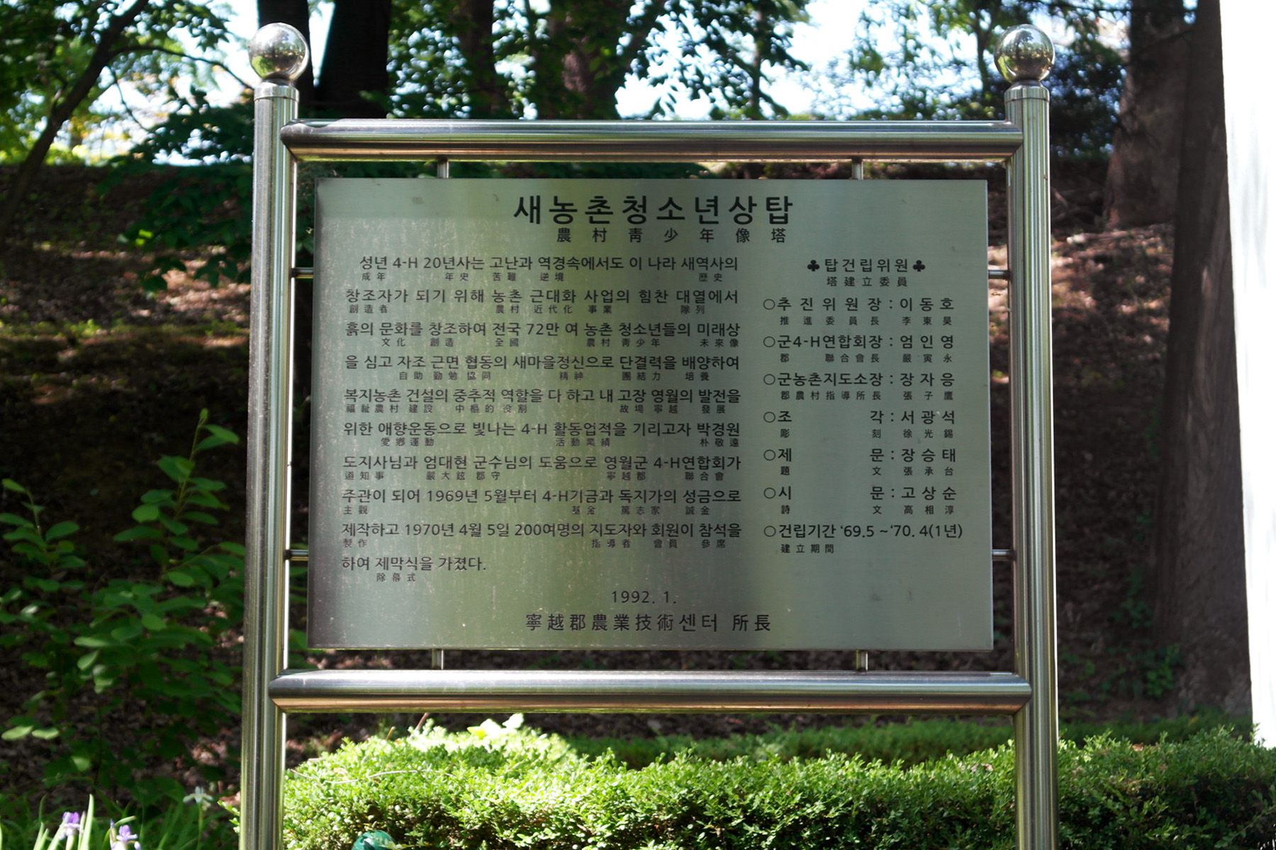 고난과 역경 속에서도 새역사의 창조자가 되기 위한 농촌 근대화 사업을 앞장서는 청소년들의 미래상을 위해 설립된 조형물인