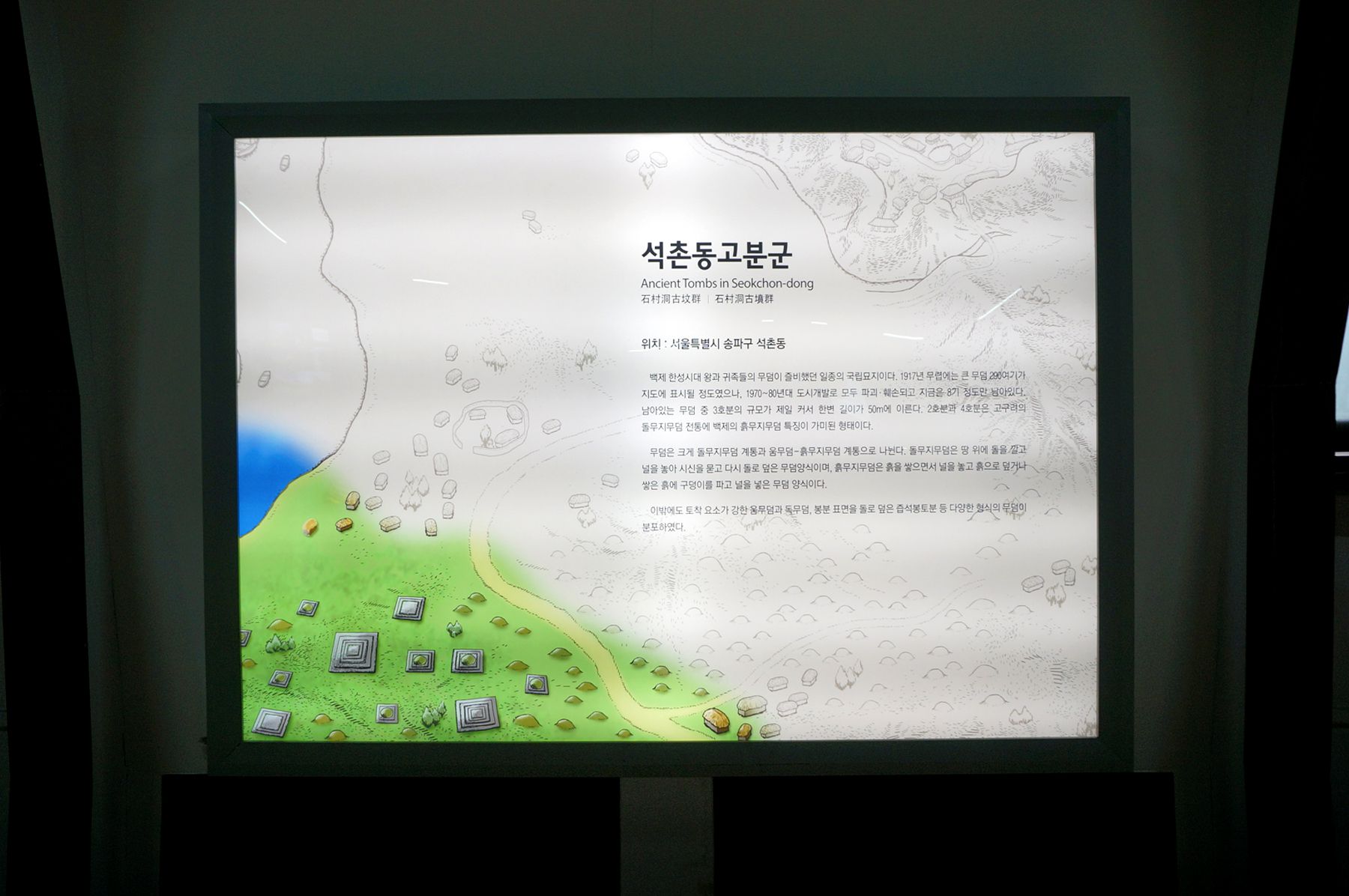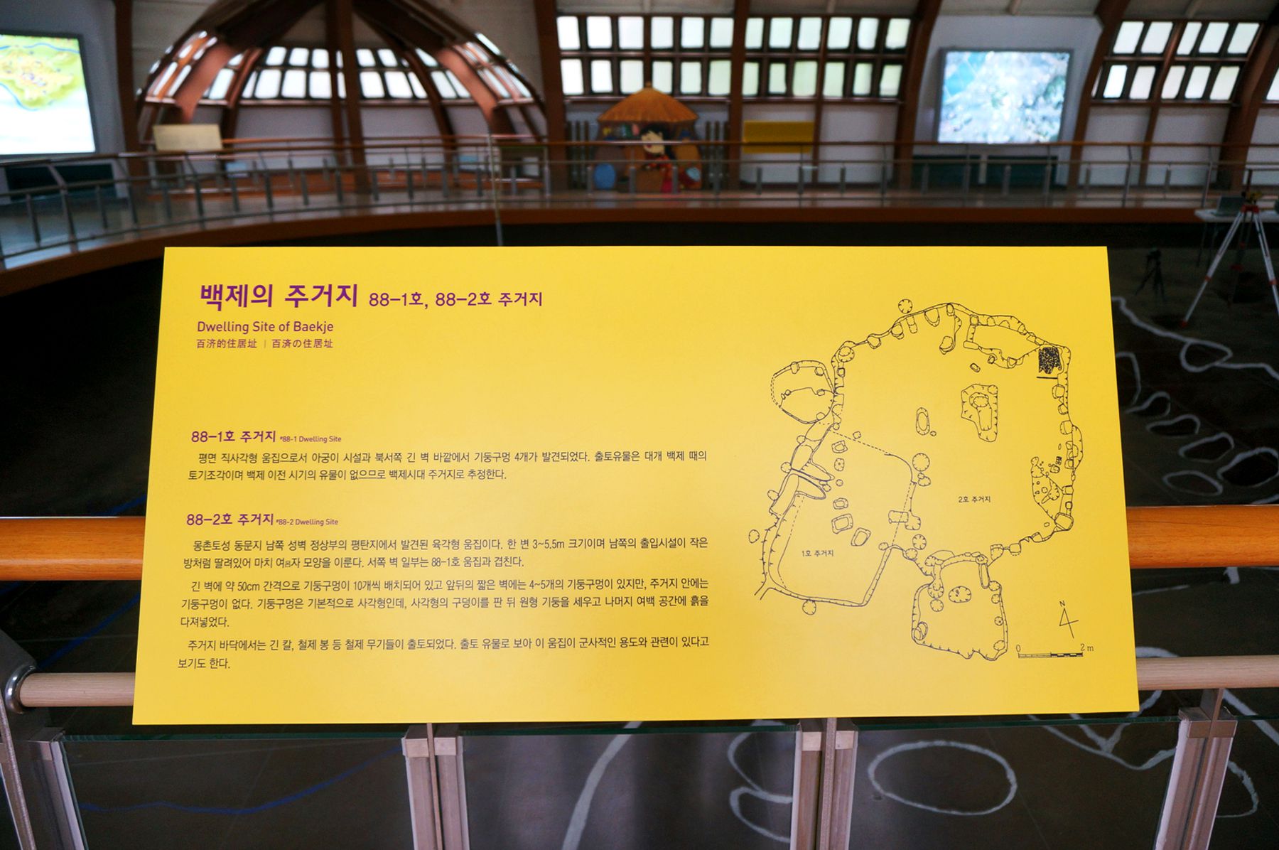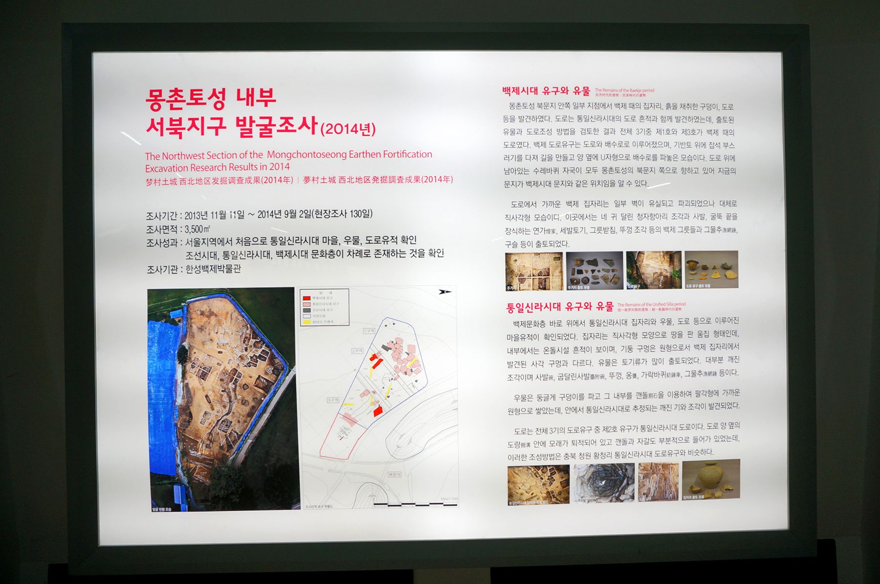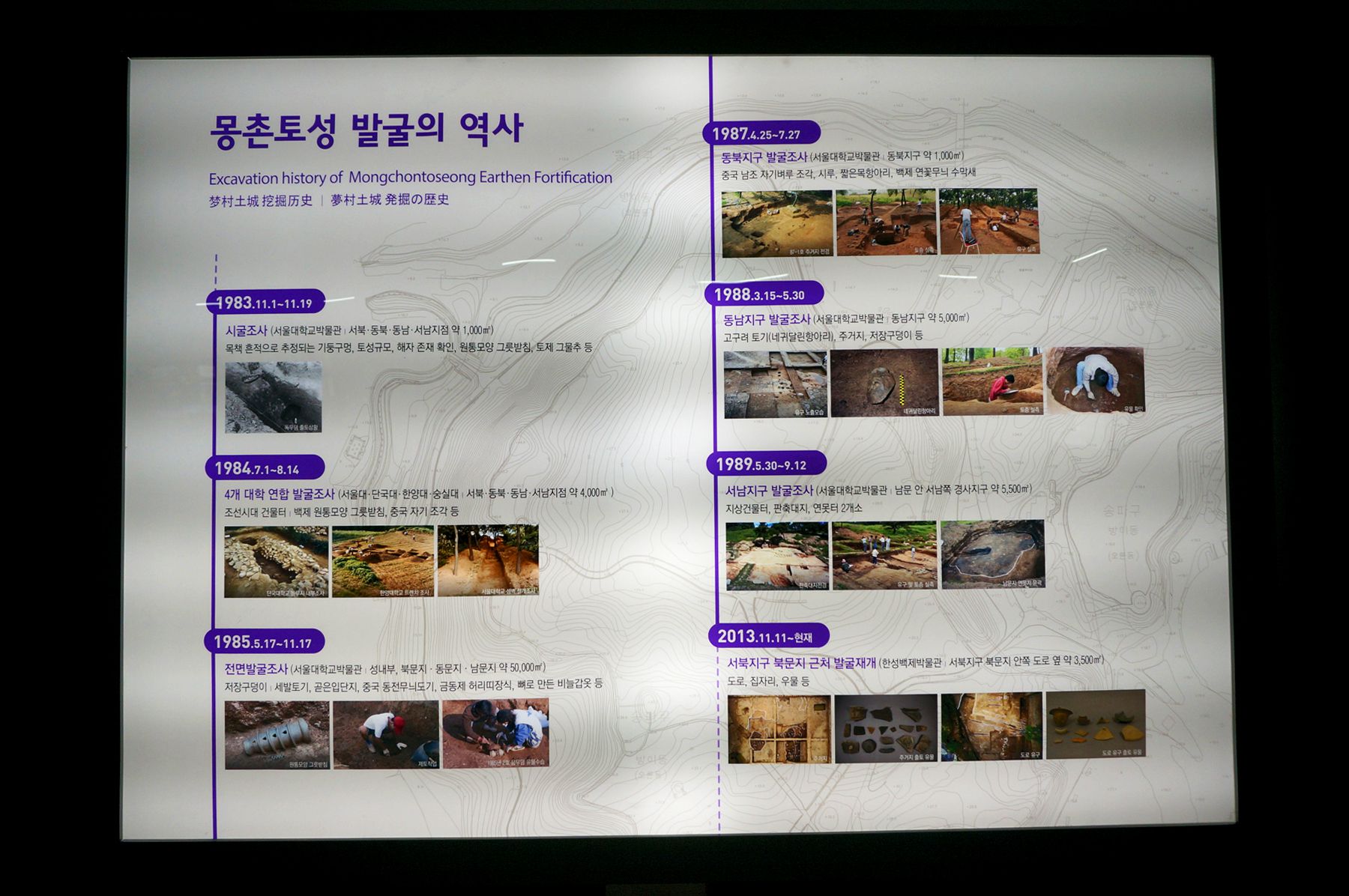몽촌토성 발굴 역사를 시간의 흐름에 따라 잘 배치하여 시기별 발굴 지구와 출토 유물을 한눈에 직접 볼 수 있는 곳입니다.