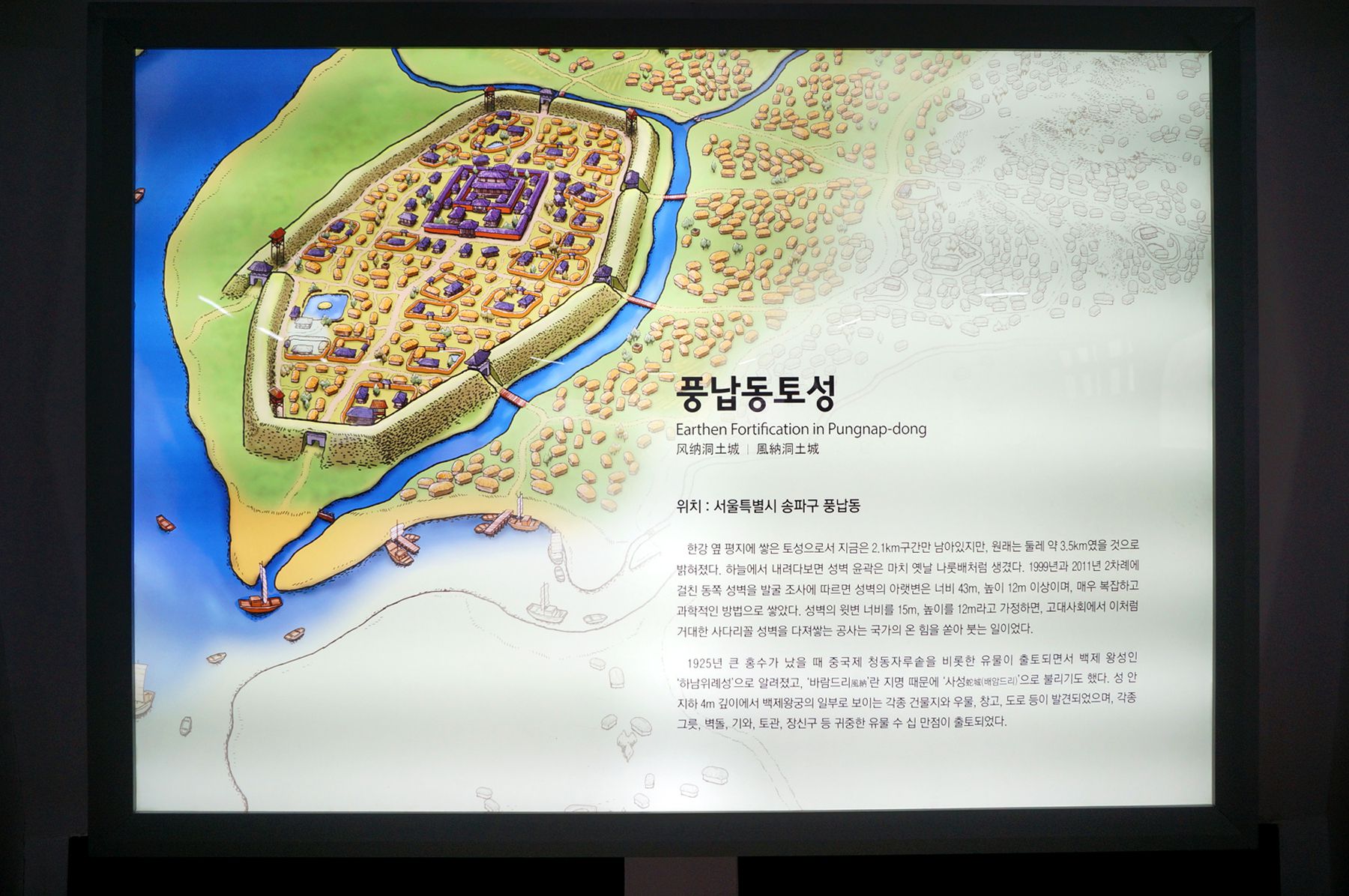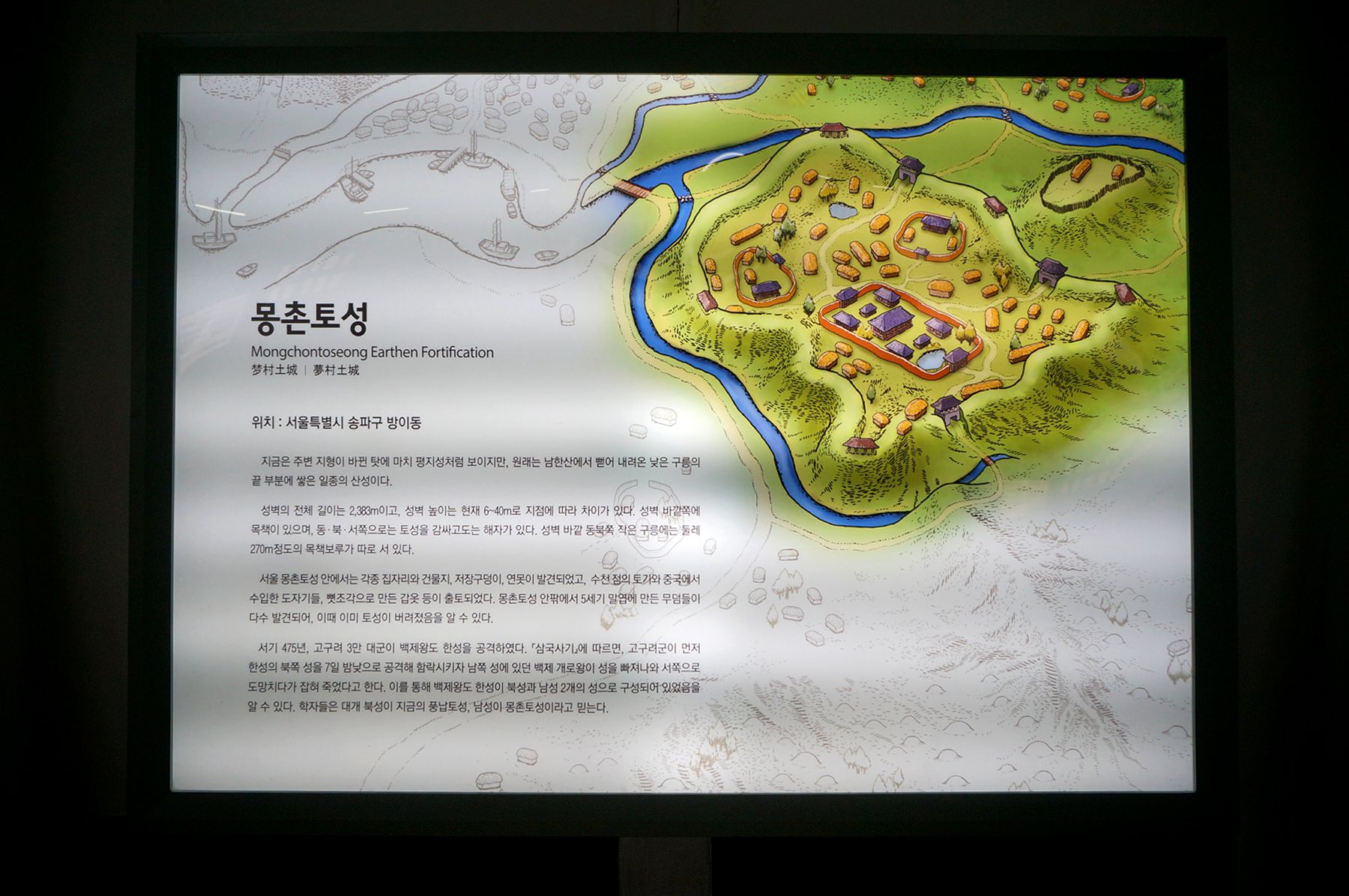 몽촌토성, 풍납동토성, 석촌동 고분군 등 한성 백제 시기의 유적들을 추정한 그림과 설명이 잘 되어 있어