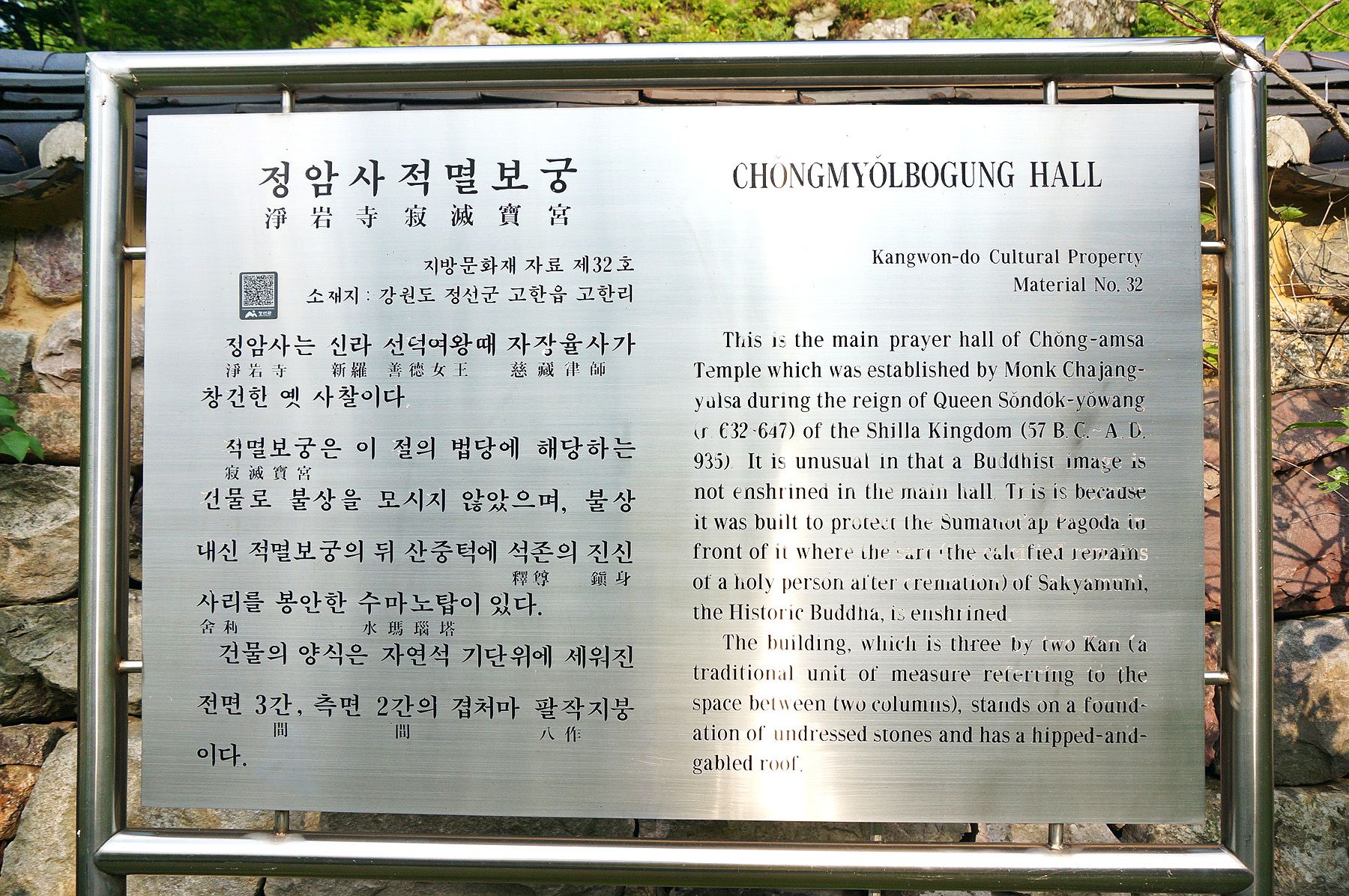 정면3칸, 측면 2칸의 팔작지붕 건물인 적멸궁이라고 적힌 법당안에는