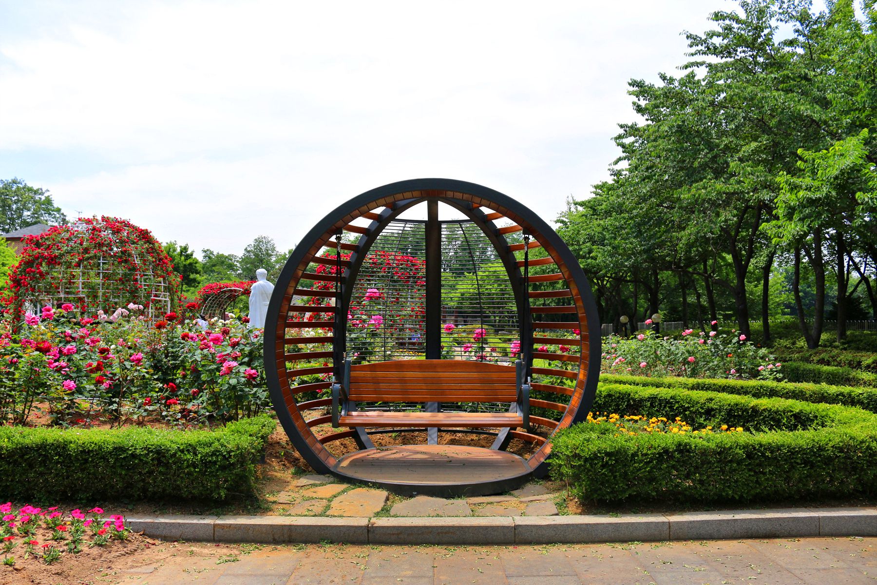 장미와 잘 어울리는 조형물이 있고, 잠시 여유를 가지고 쉴 수 있는 벤치도 마련되어 있습니다.