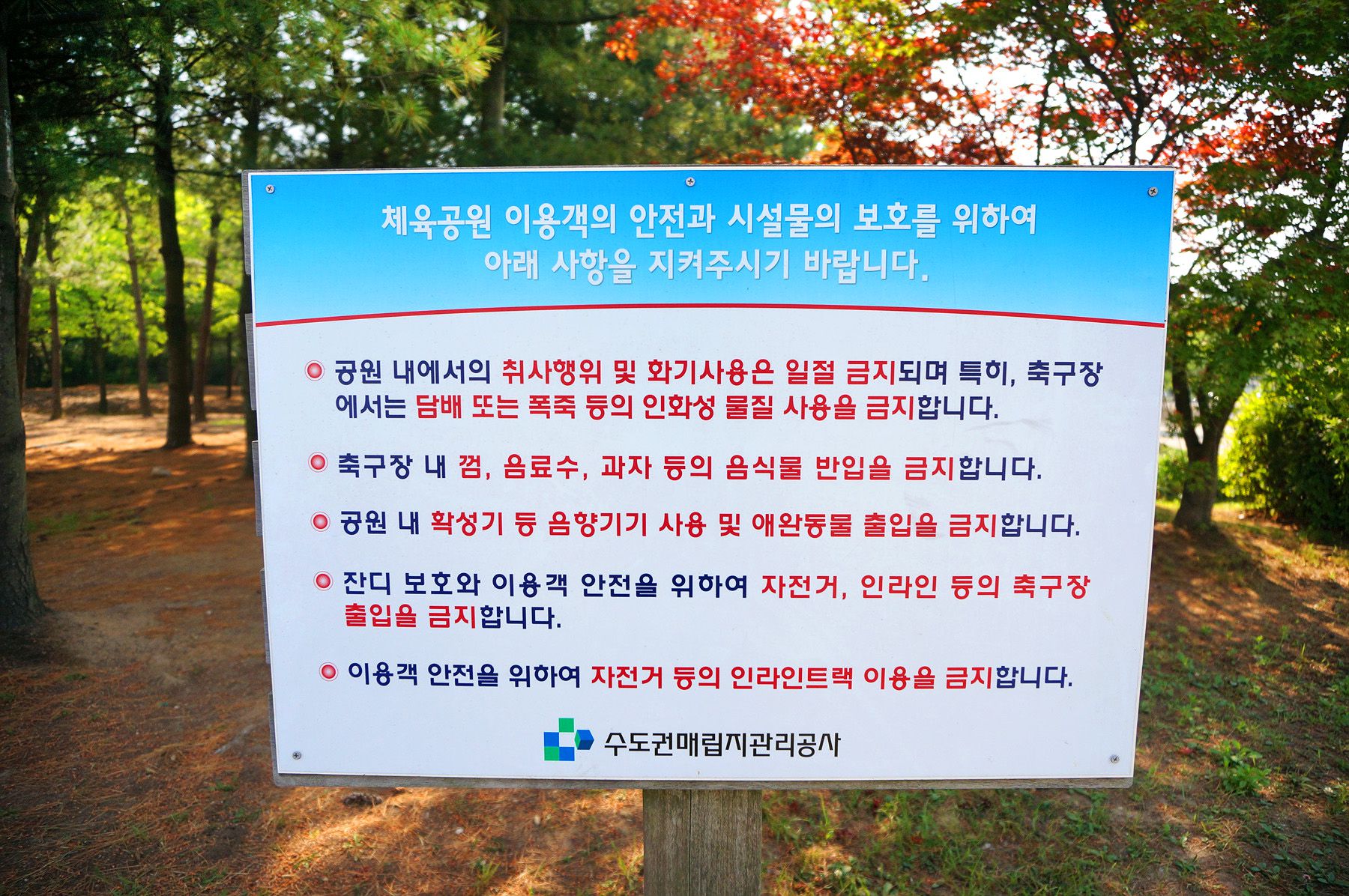 공원 주변에 가스관이 있어 취사 및 화기사용과 흡연을 금한다는 안내문이 적혀있으니 꼭 지켜주시길 바랍니다.