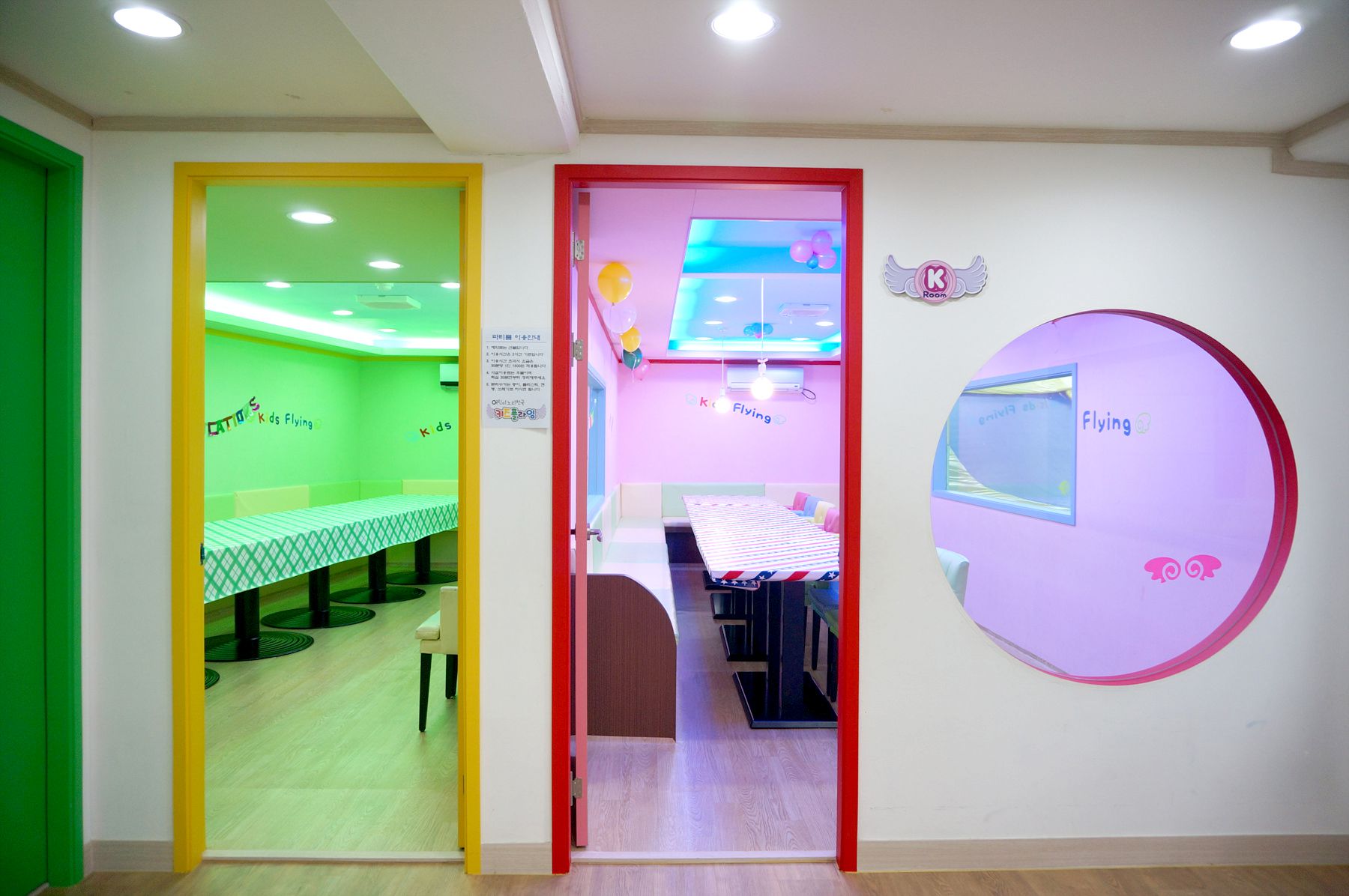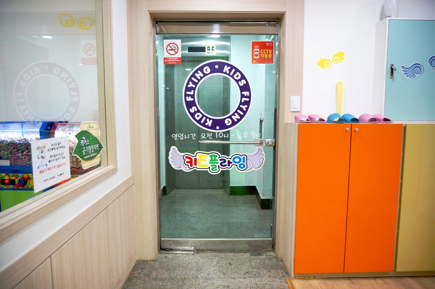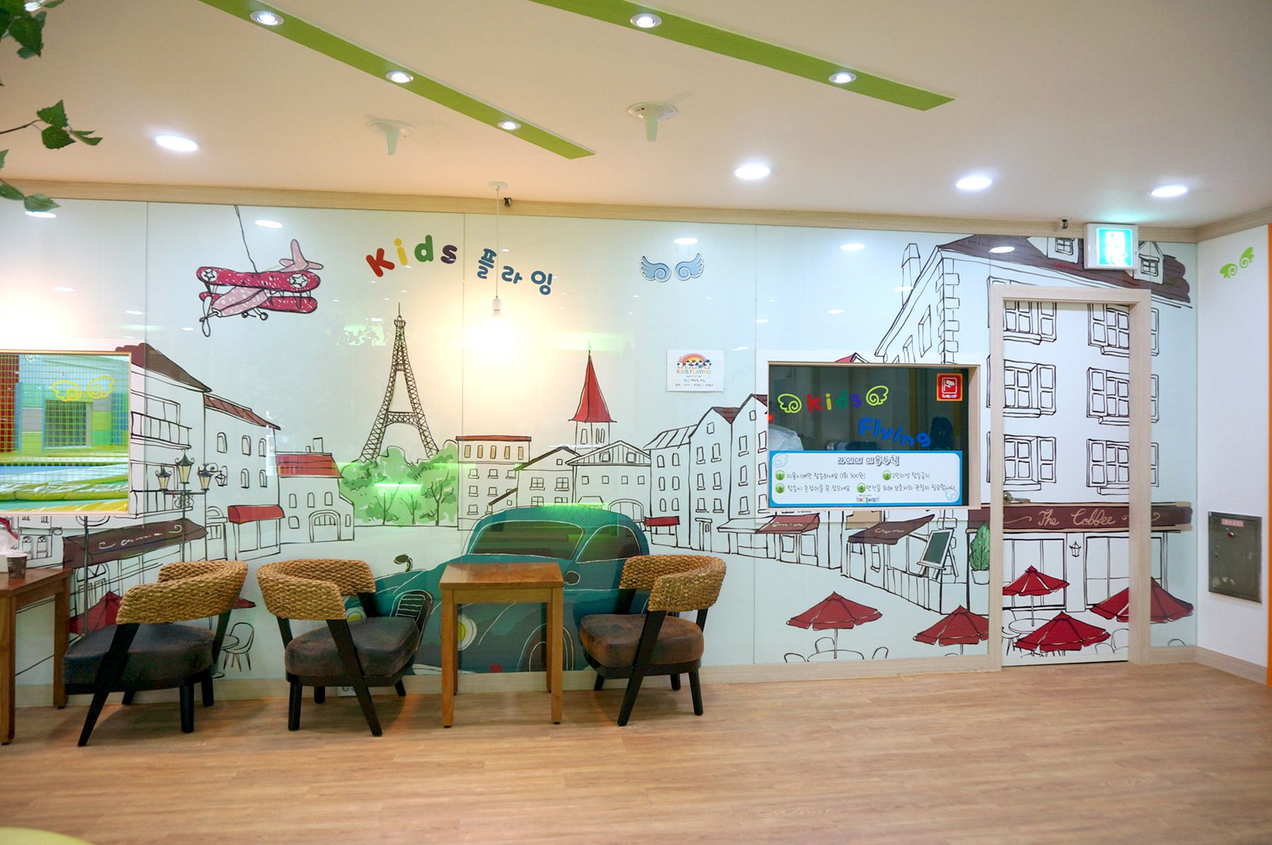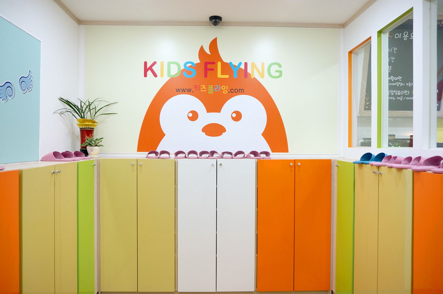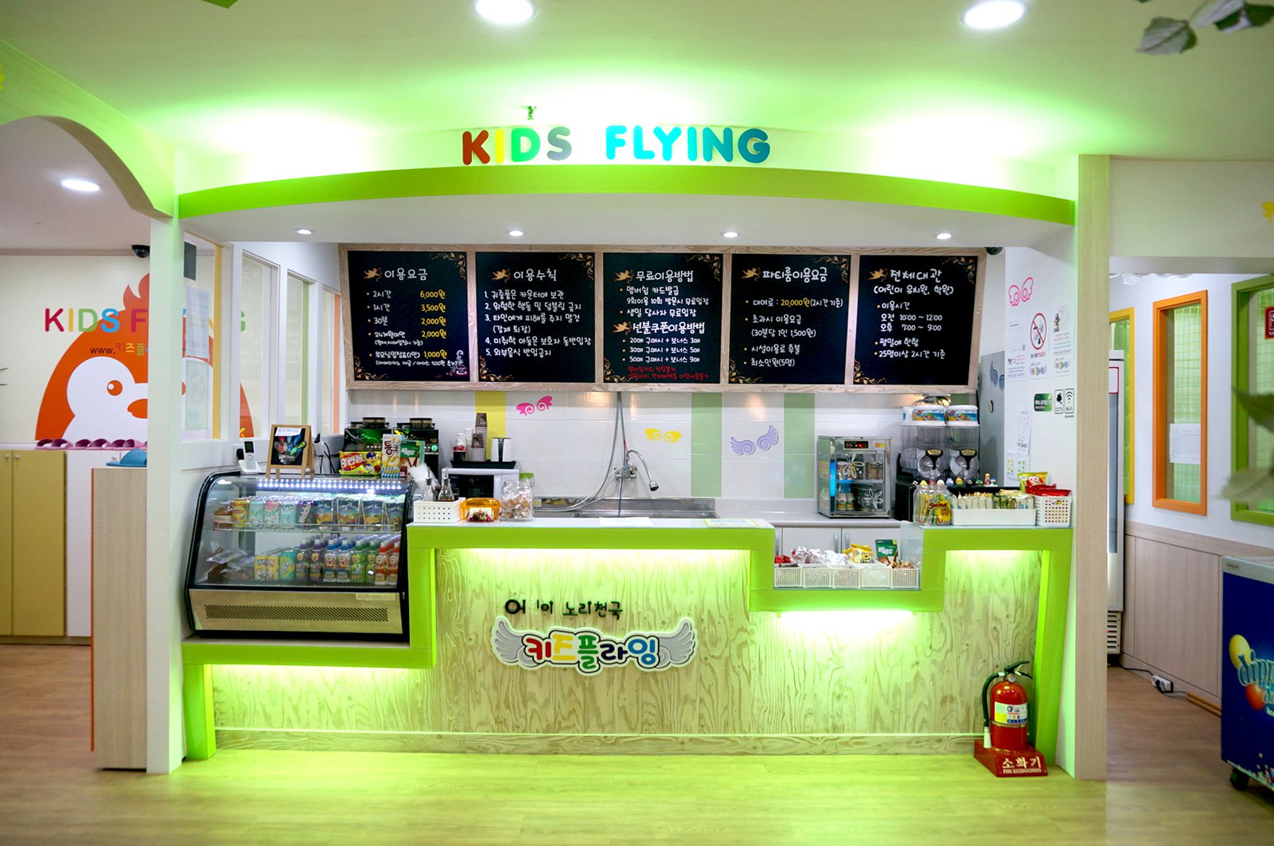 키즈플라잉에는 큐브놀이존, 카페존, 편백놀이존, 미로놀이존, 파티룸존, 트램펄린존, 정글짐존이 있으며