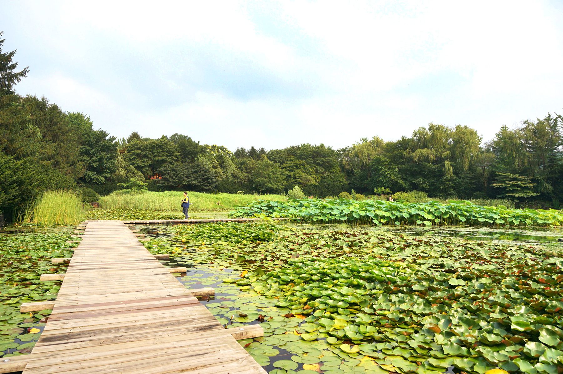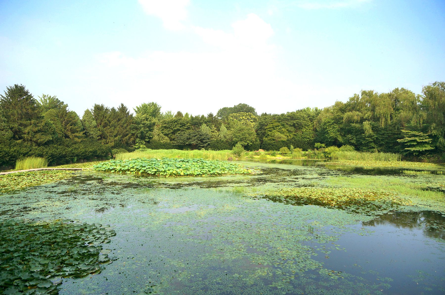 다양한 수생식물을 만날 수 있는 연못과 교목으로 둘러싸인 시원한 잔디광장,