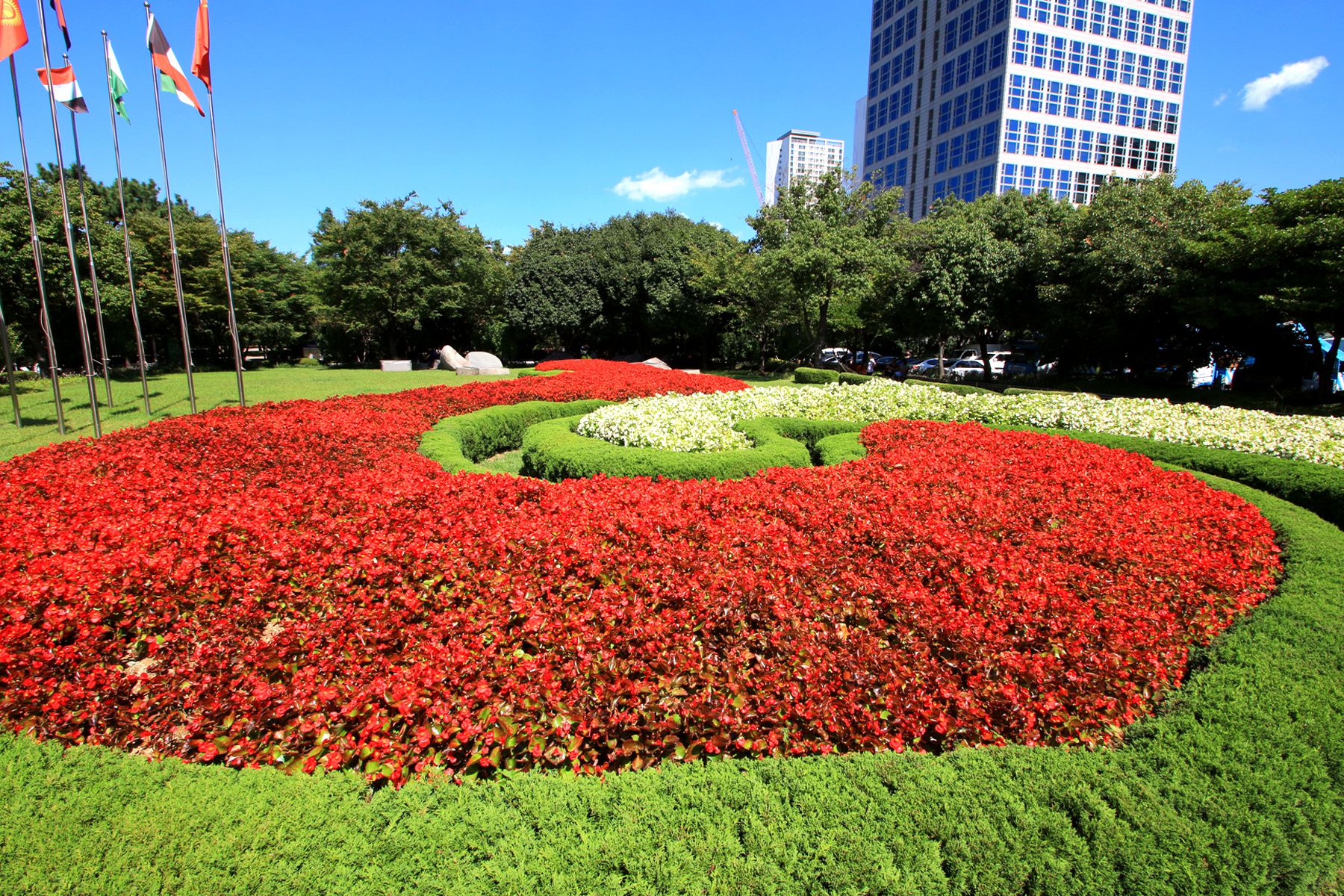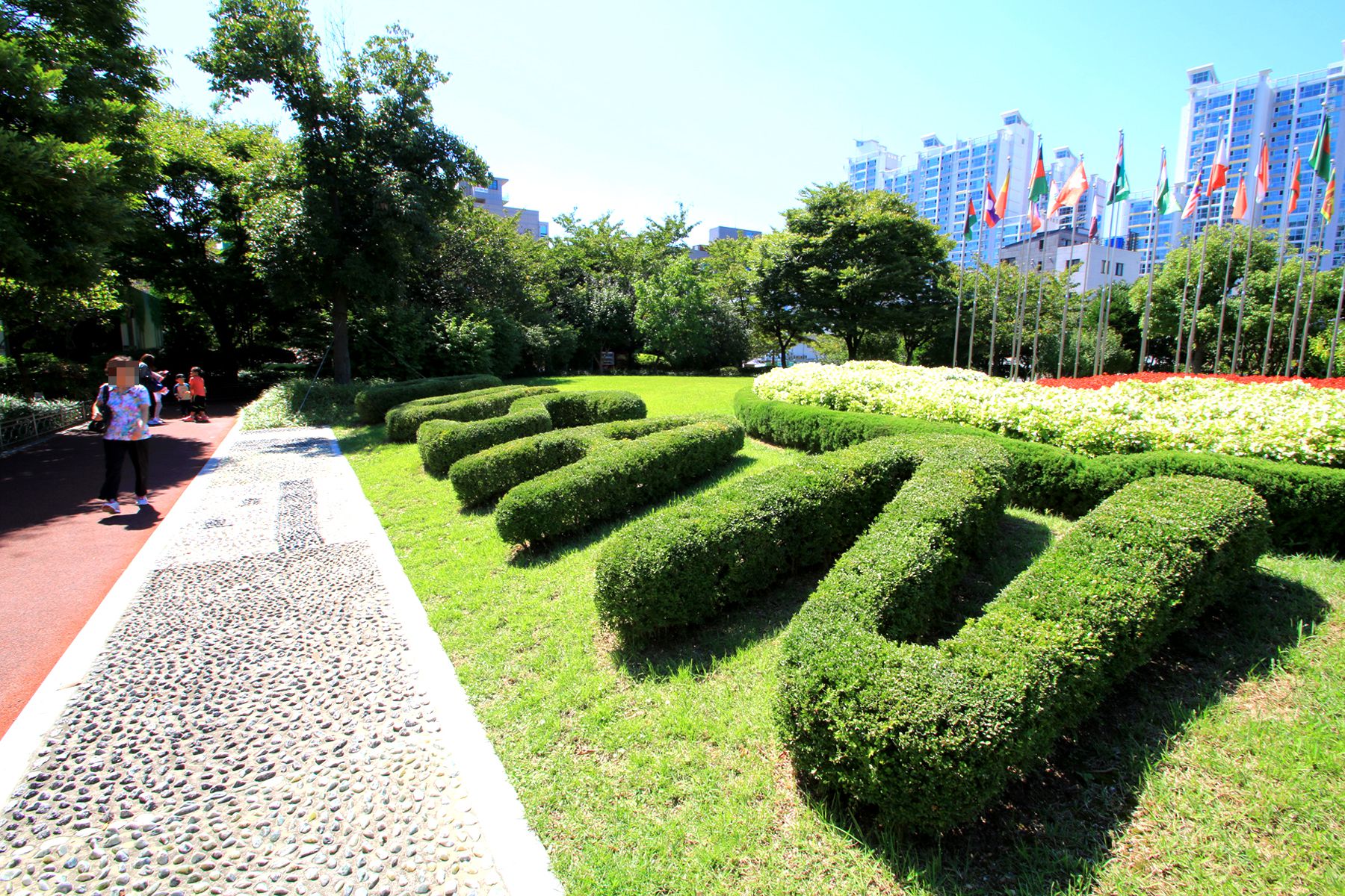 아시안게임을 상징하는 알록달록 조각 작품같은 식재들이 부산시청 녹음공원의 분위기를 화사하게 만들어주고 있답니다.
