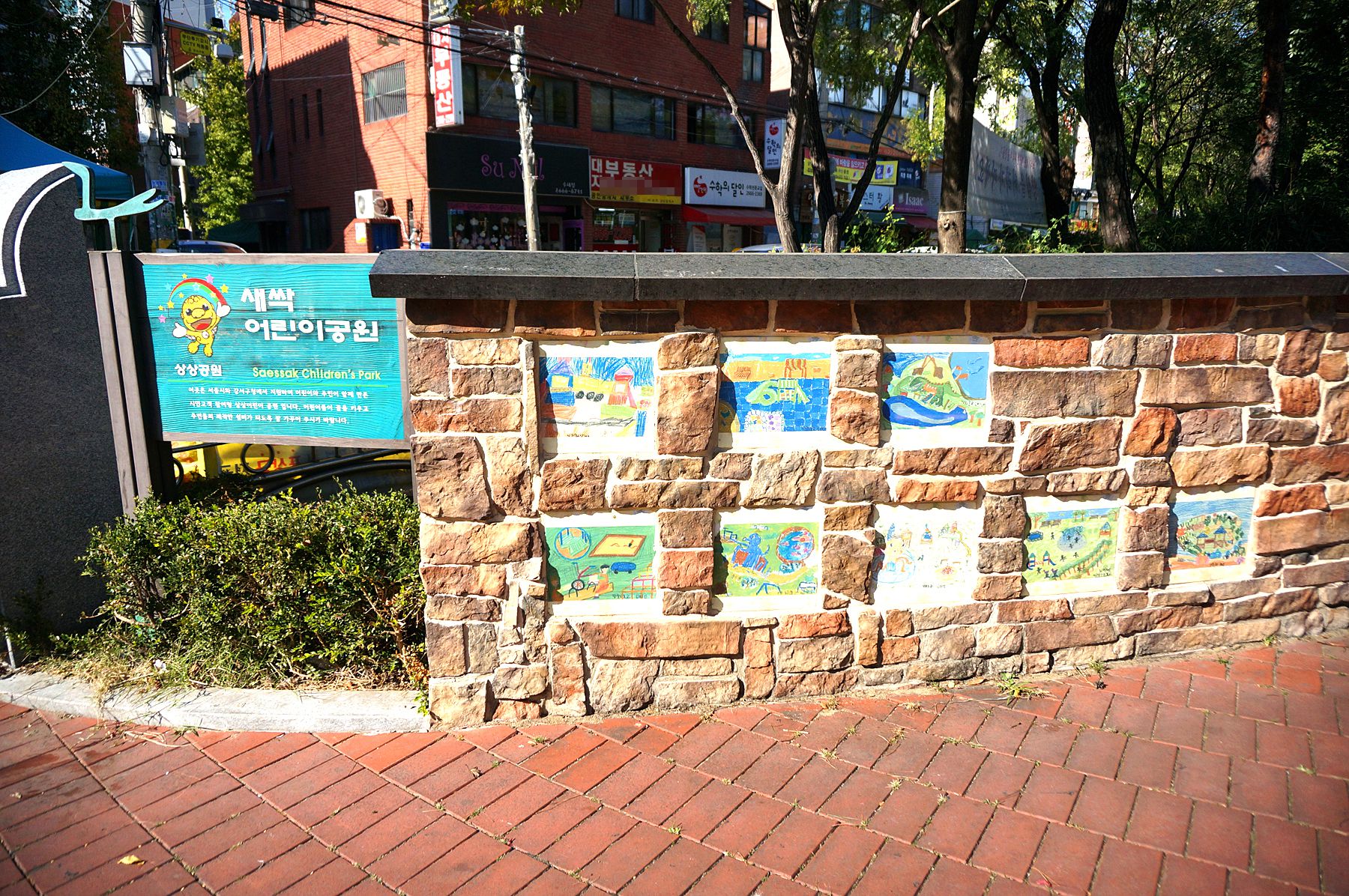 공원 입구 담장의 벽돌 사이로 보이는 알록달록 예쁜 그림은 아이들이 미소를 짓게 되는 곳입니다^^