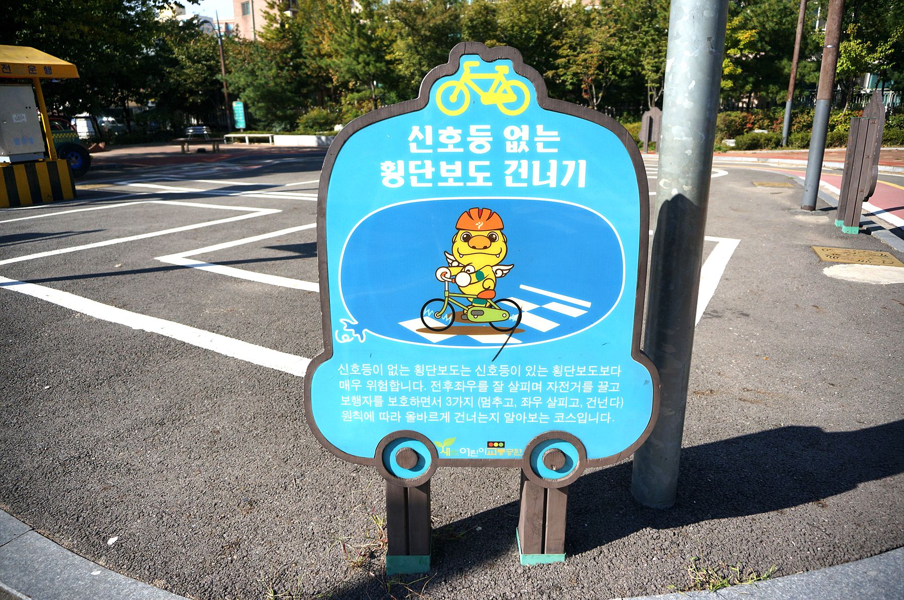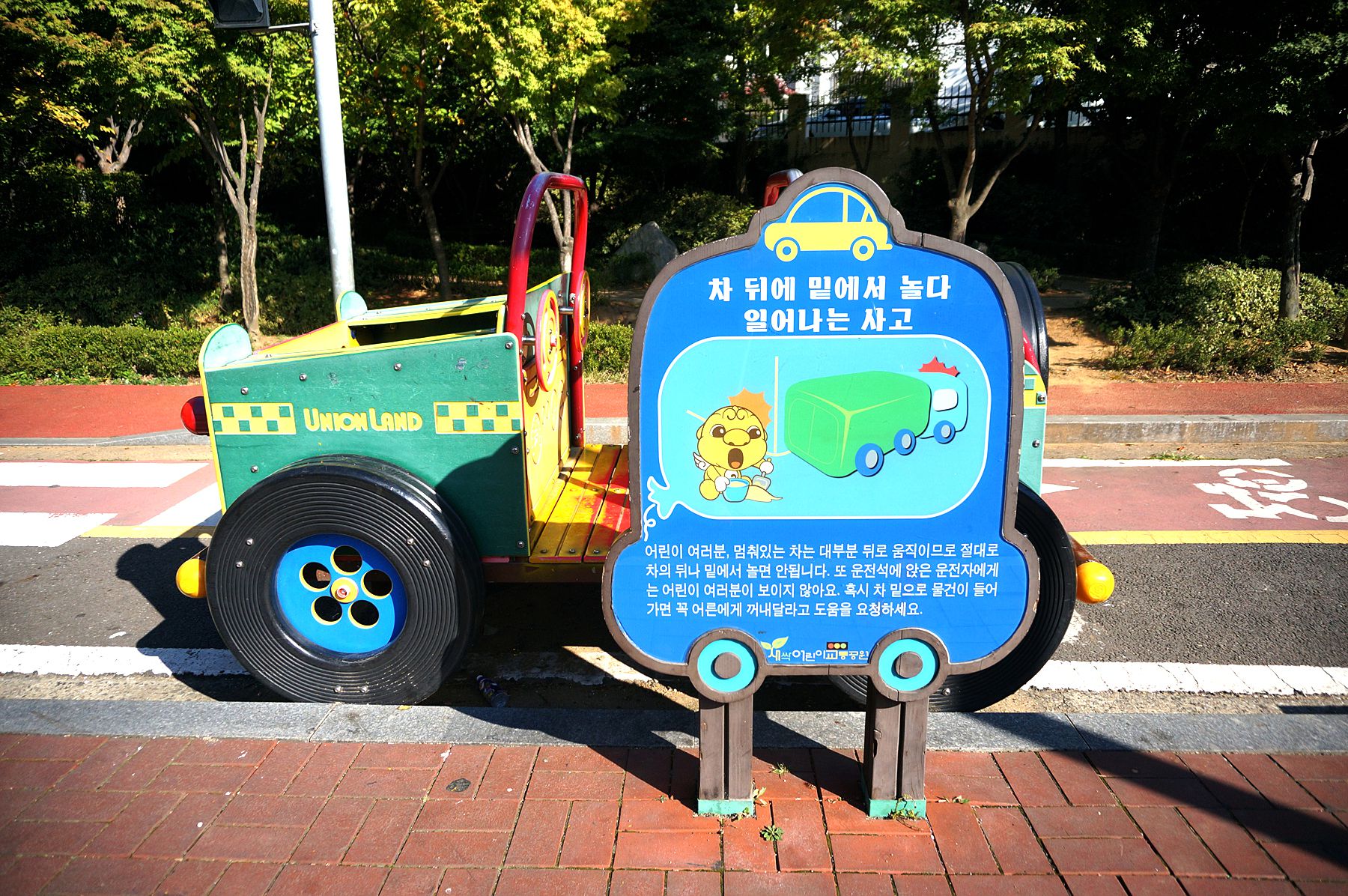 아이들의 눈높이에 맞게 설치된 교통 표지판에 자주 일어나는 사고의 유형을 적어 놓아 경각심을 갖게 하며