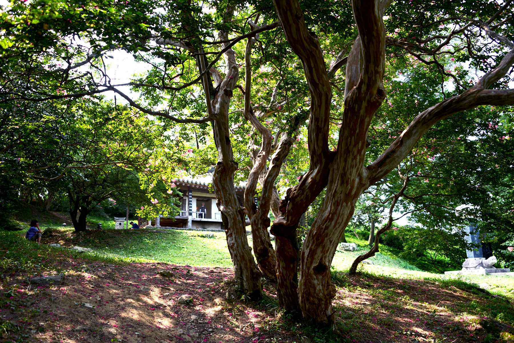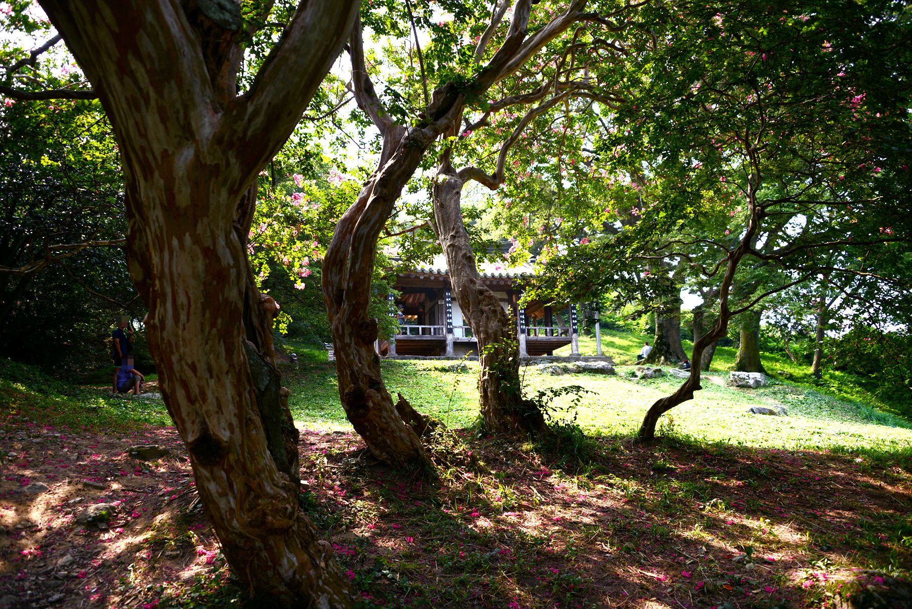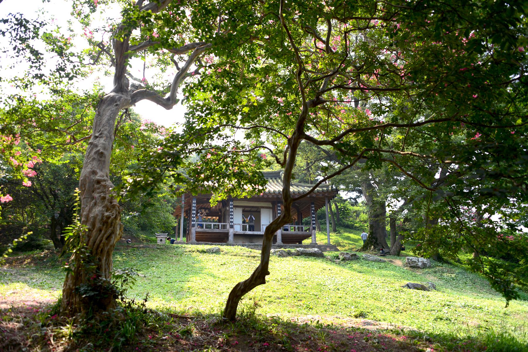 건물 뒤 연못 주위에는 배롱나무가 자리하고 있으며, 오른쪽으로는 소나무 군락이 있습니다.