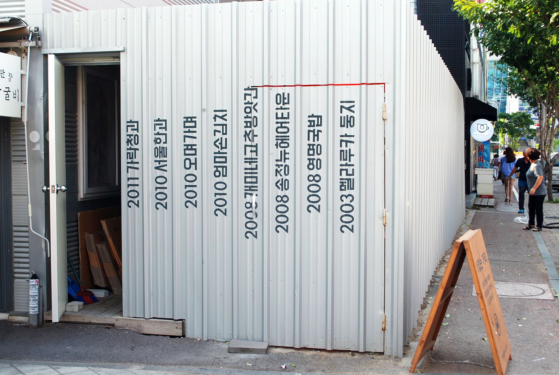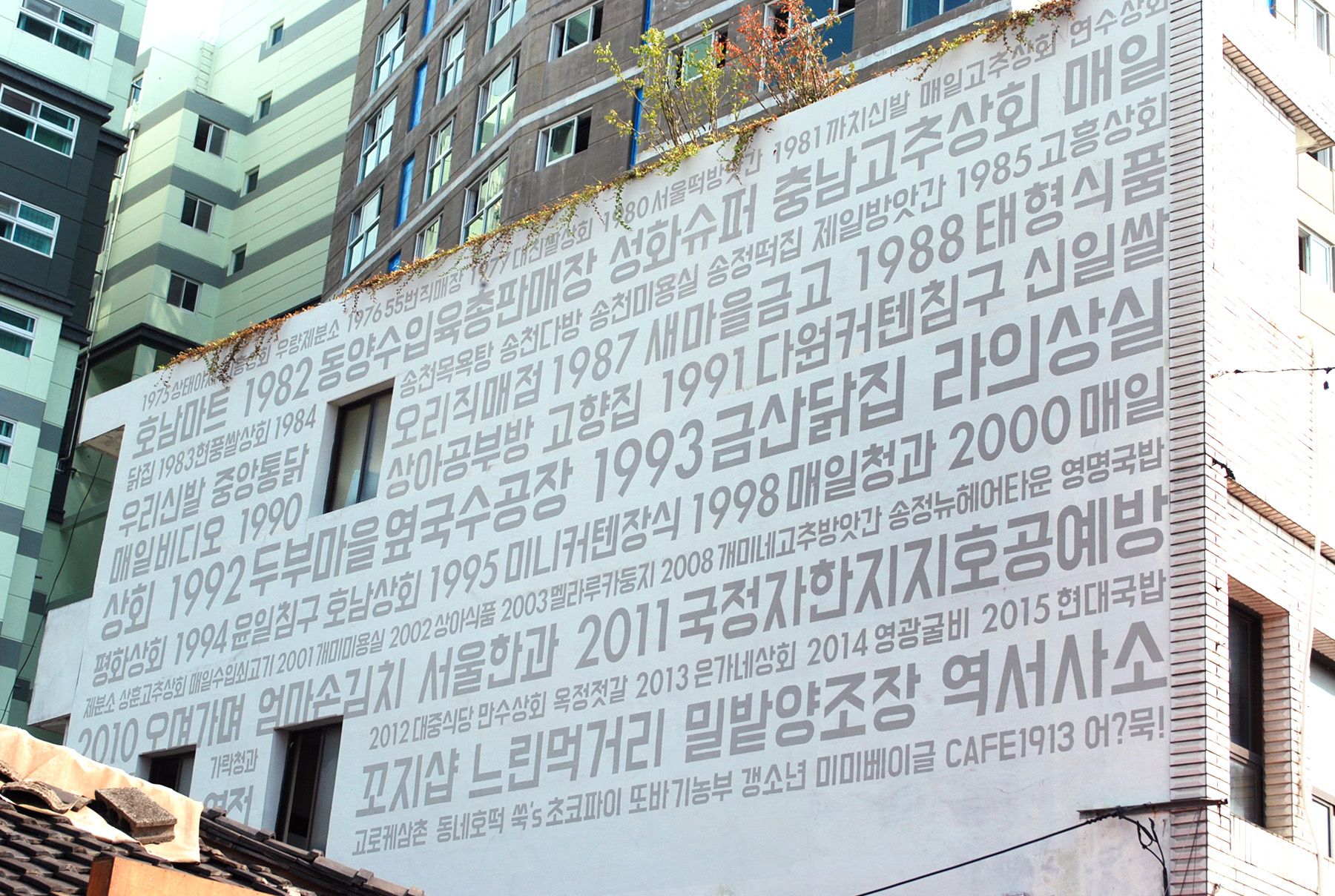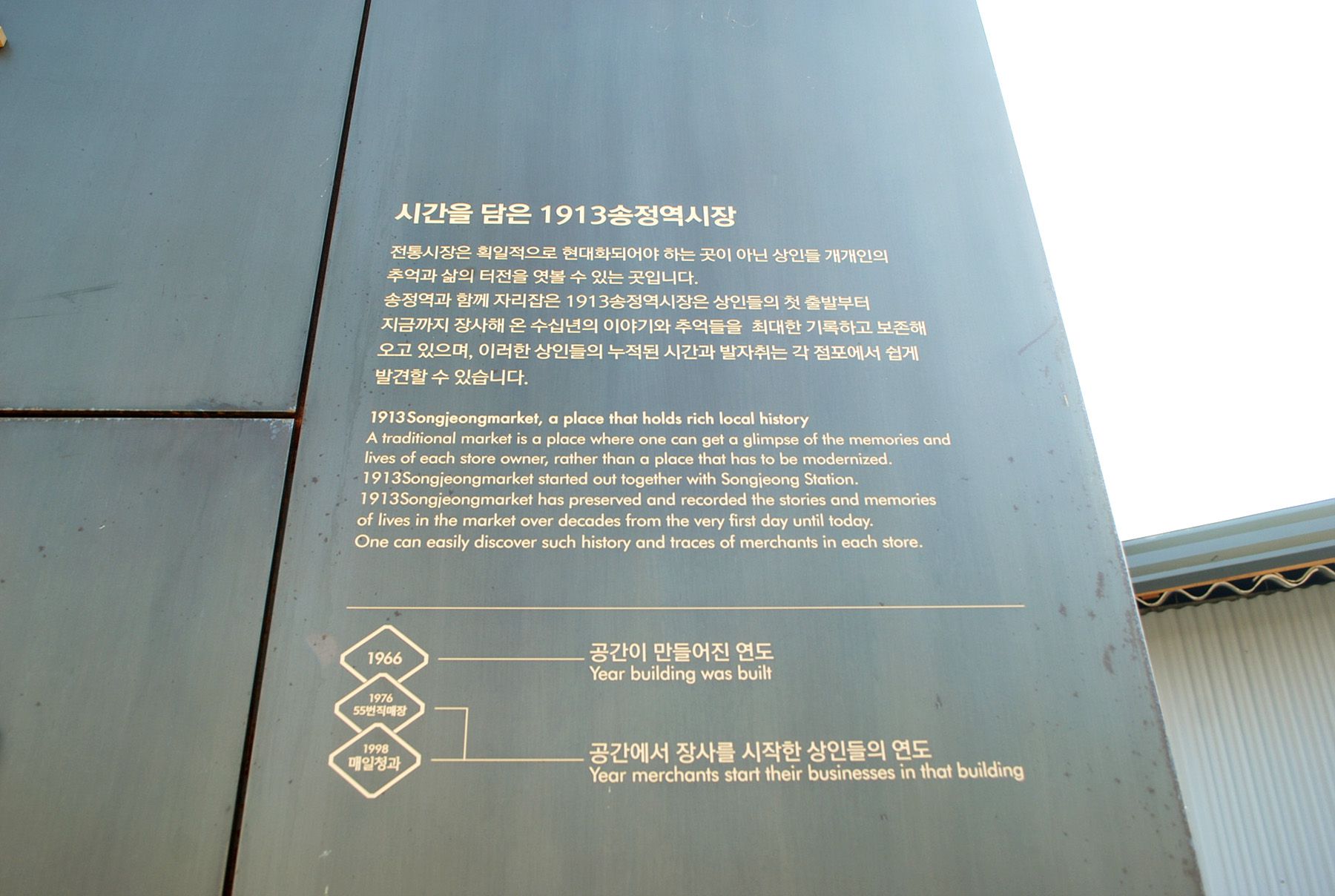 송정역시장 골목의 바닥에는 건물의 연도가 쓰여져 있으며 숫자가 가리키는 방향에 있는 건물의 완공연도를 표시한 것으로