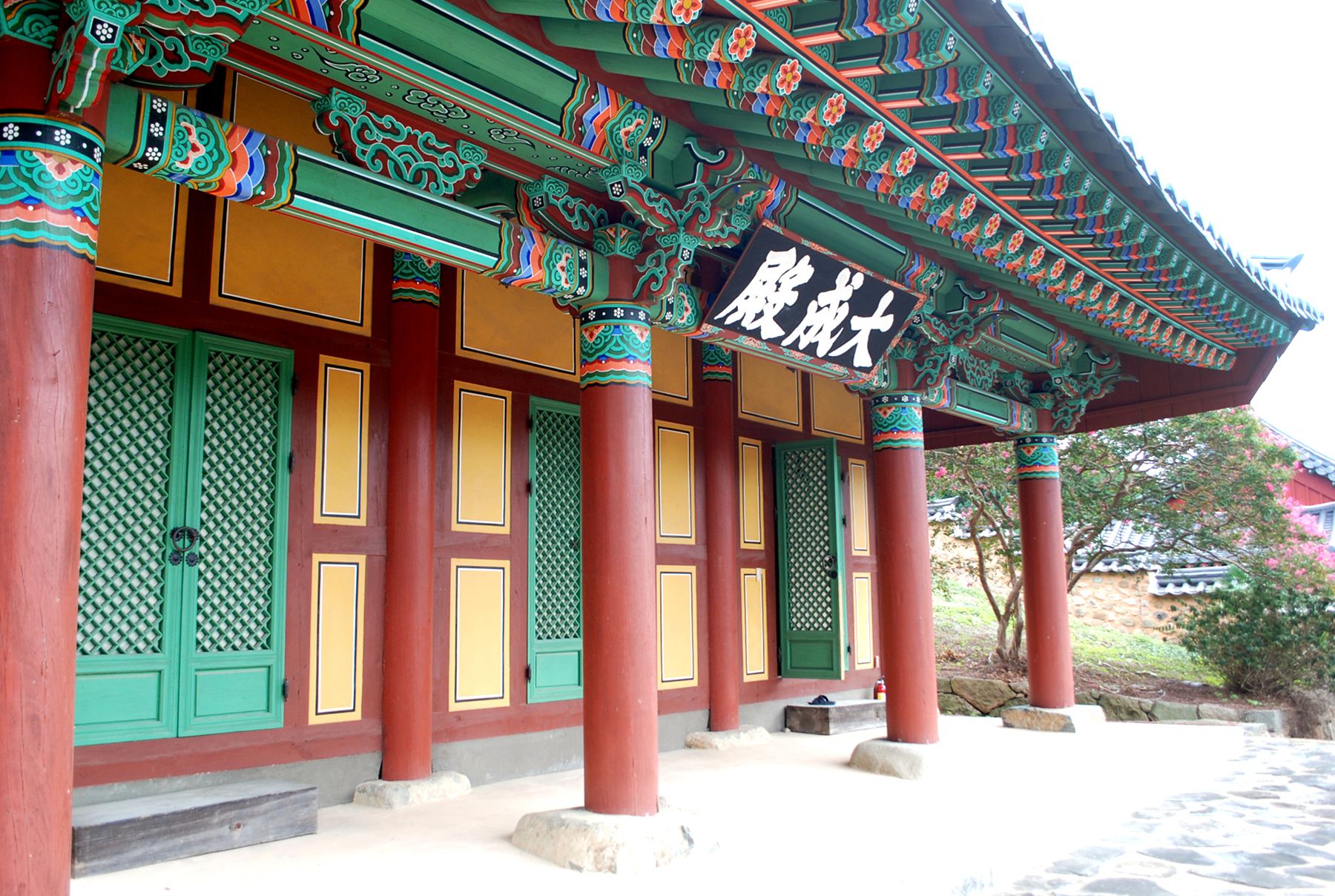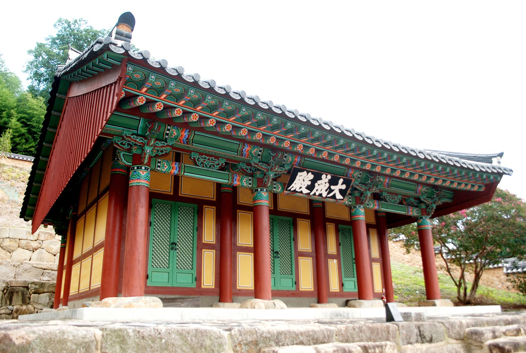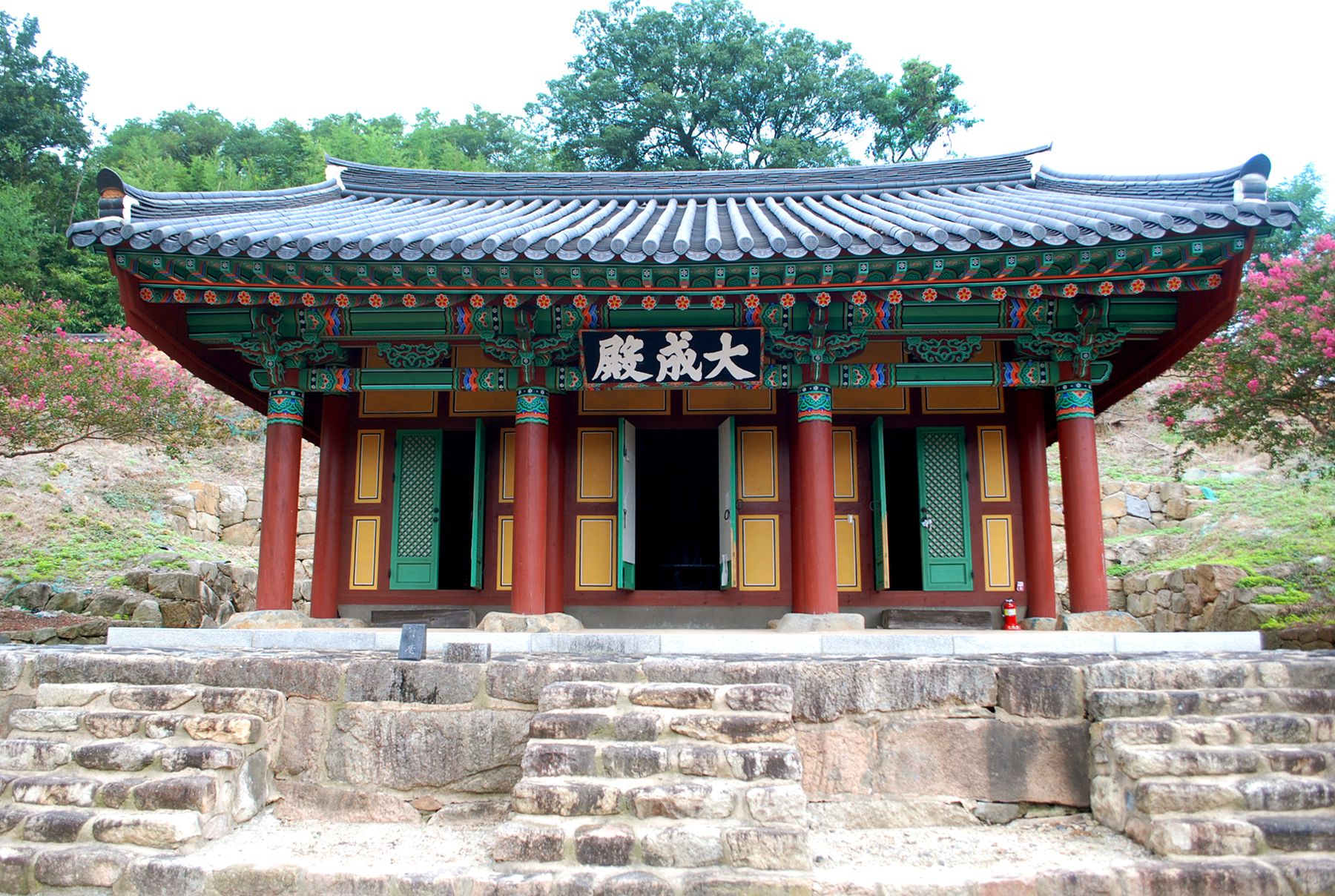 대성전은 정면 3칸, 측면 3칸 맞배지붕이고, 지형상 건물 전면을 2단으로 석축한 뒤에 기단을 세웠으며