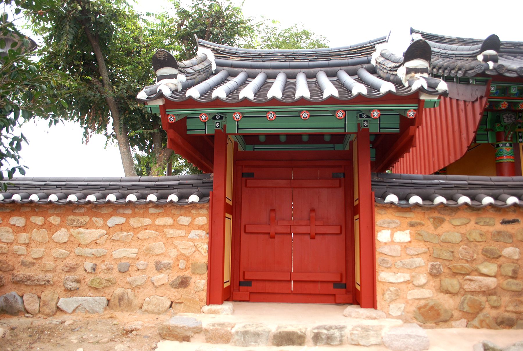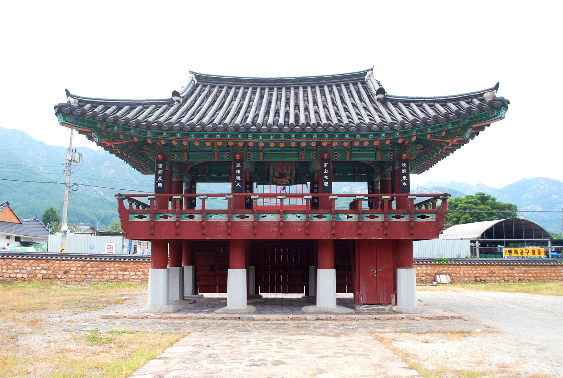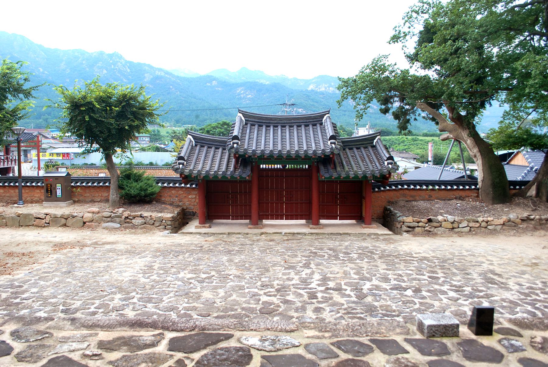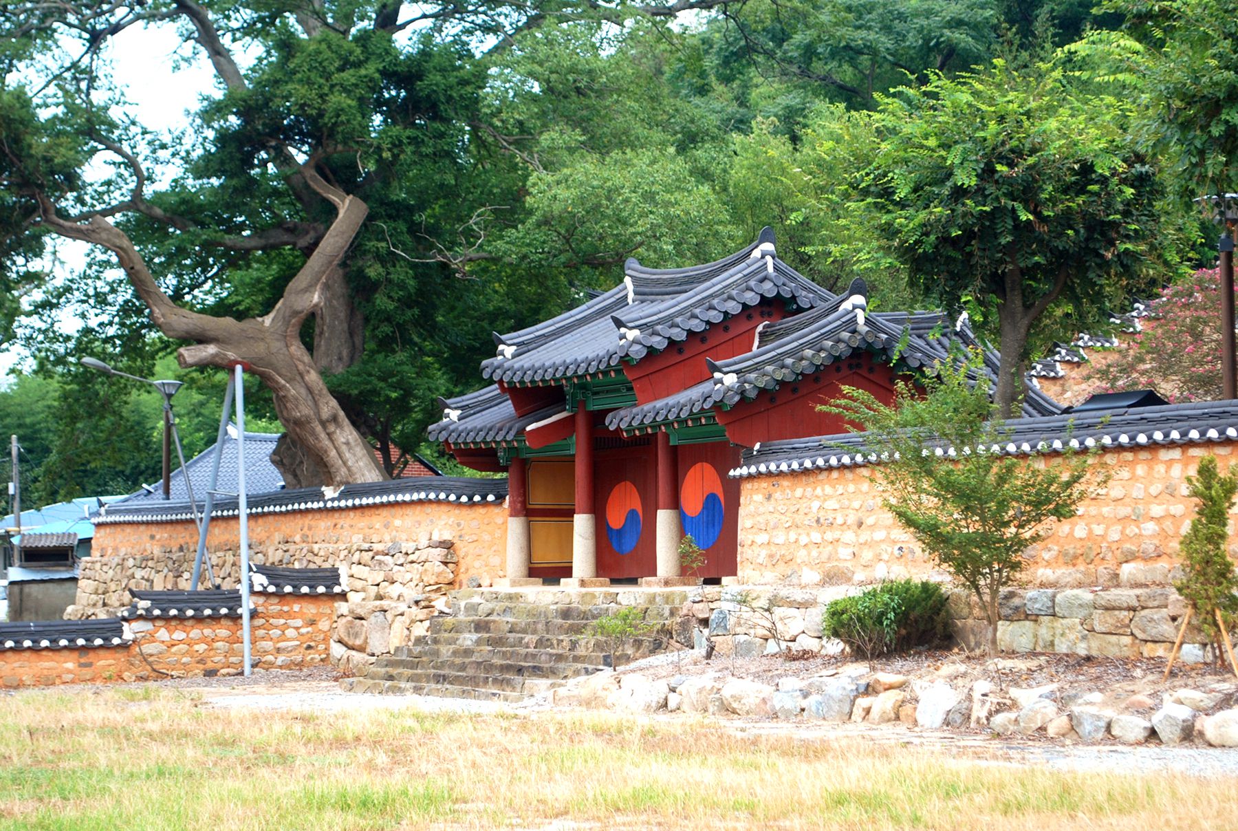 향교의 입구를 알리는 홍살문이 전면에 자리해 있고 그 옆으로는 돌담이 둘러있는데요,