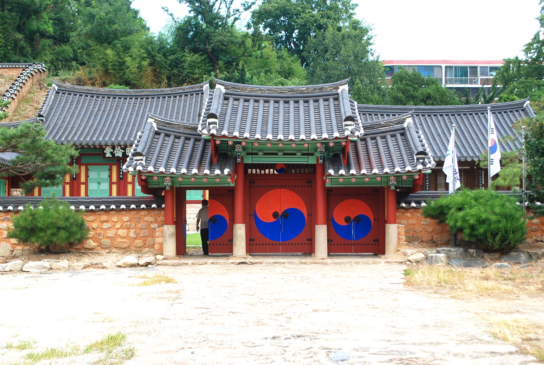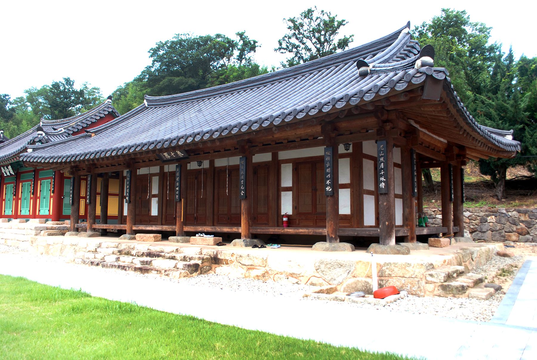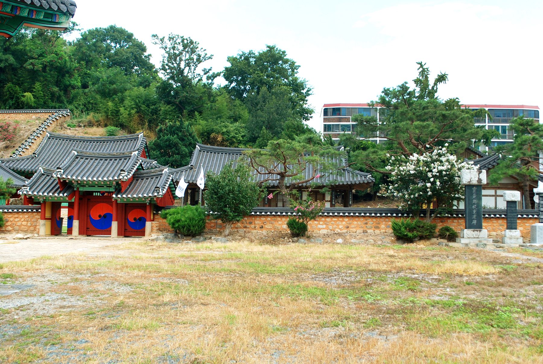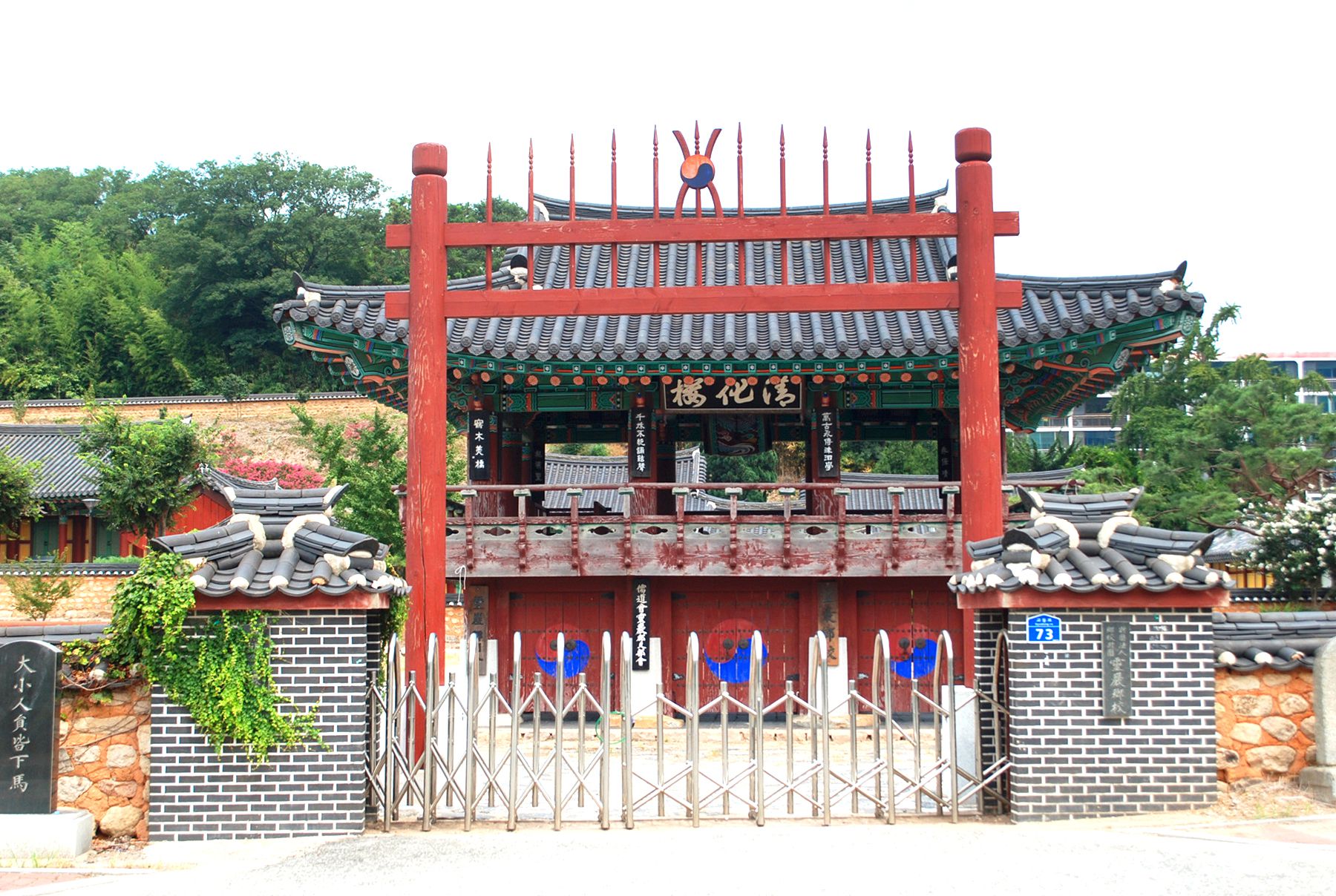 신성한 영역임을 알리는 홍살문 뒤로 만화루 누각이 자리해있으며, 그 뒤편으로 강당과 사당 건물이 자리하고 있습니다.