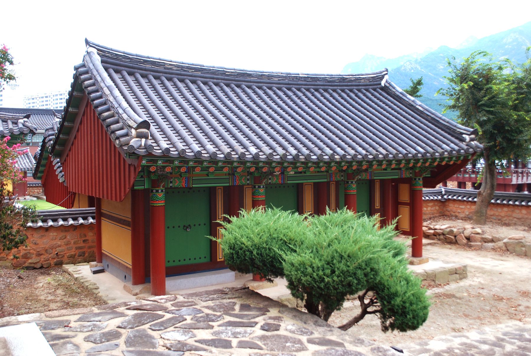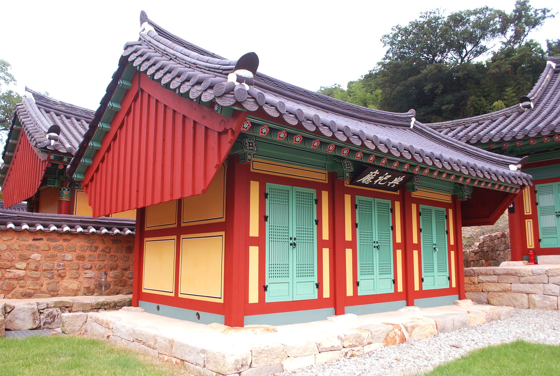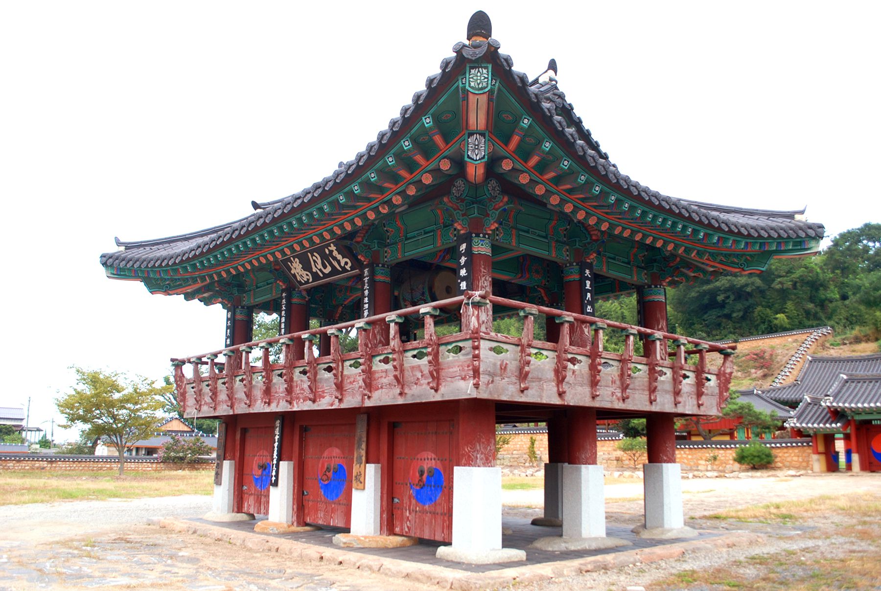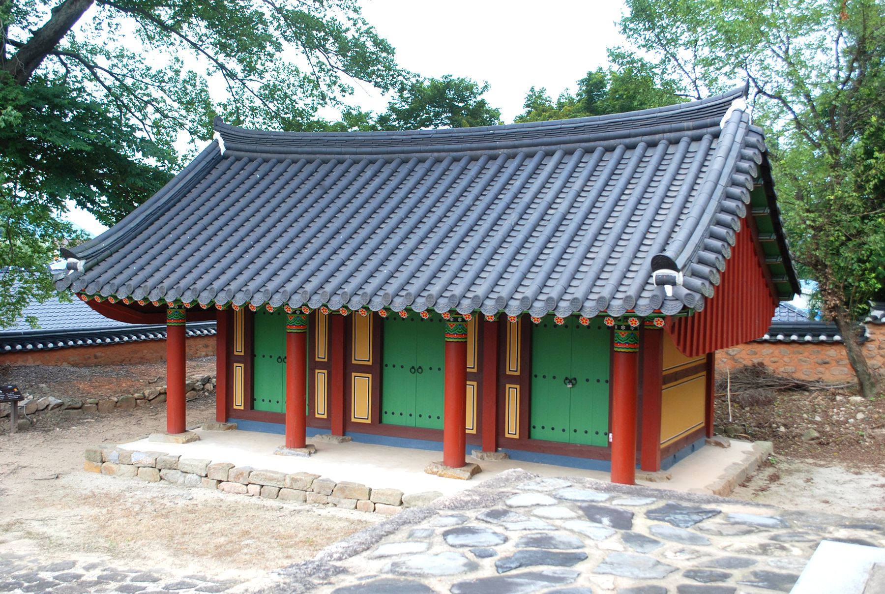 신성한 영역임을 알리는 홍살문 뒤로 만화루 누각이 자리해있으며, 그 뒤편으로 강당과 사당 건물이 자리하고 있습니다.
