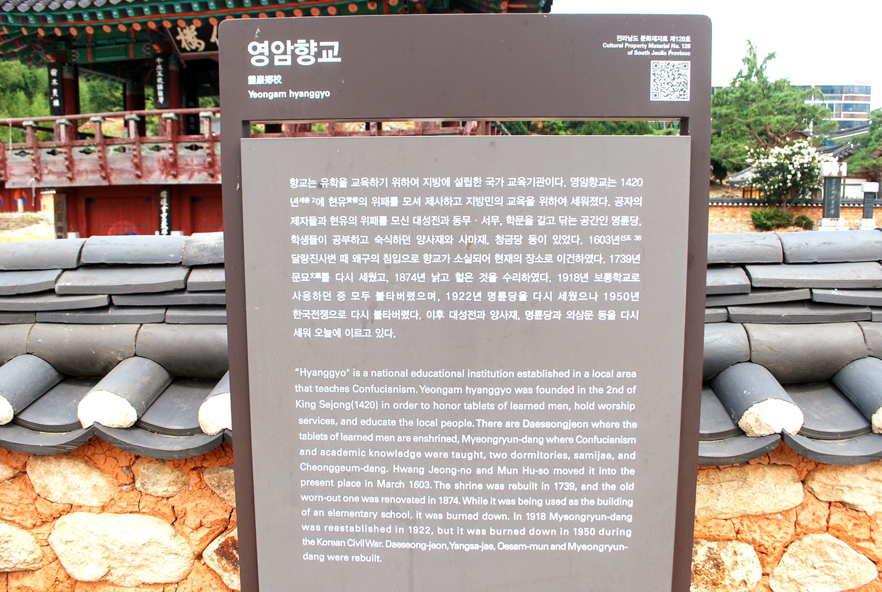 1420년(세종 2)에 현유의 위패를 봉안, 배향하고 지방민의 교육과 교화를 위하여 창건된 역사가 깊은 영암향교는