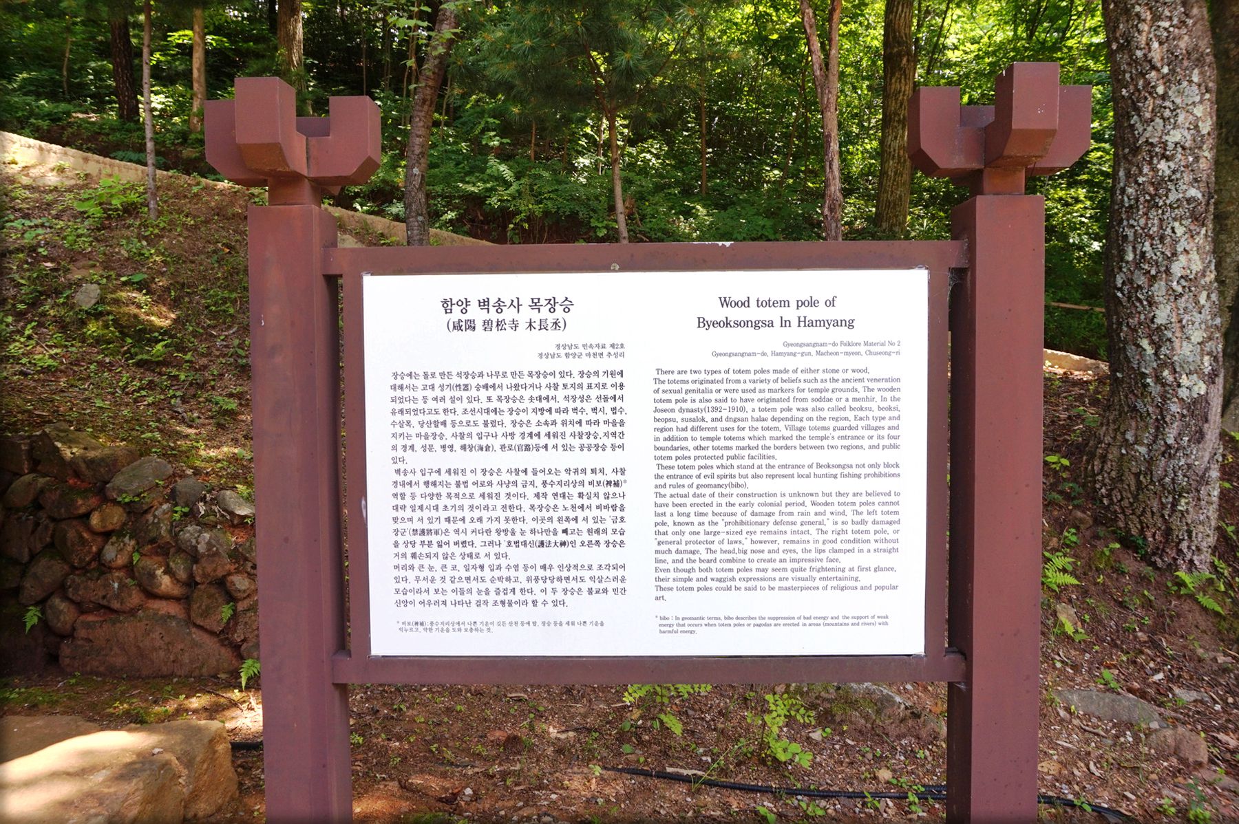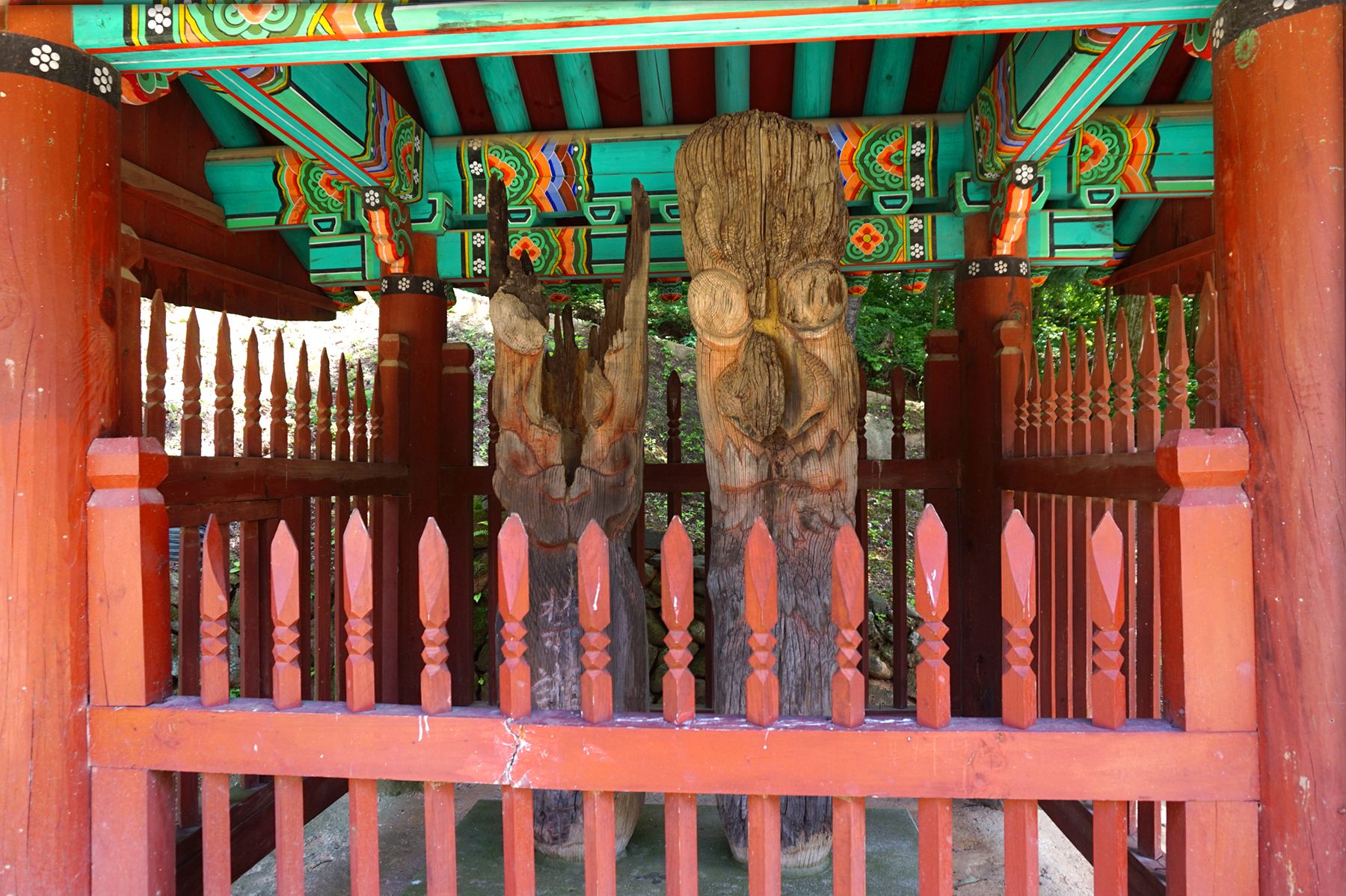 2기의 목장승은 왼쪽이 금호장군, 오른쪽이 호법대장군을 나타내며, 재질은 밤나무입니다.