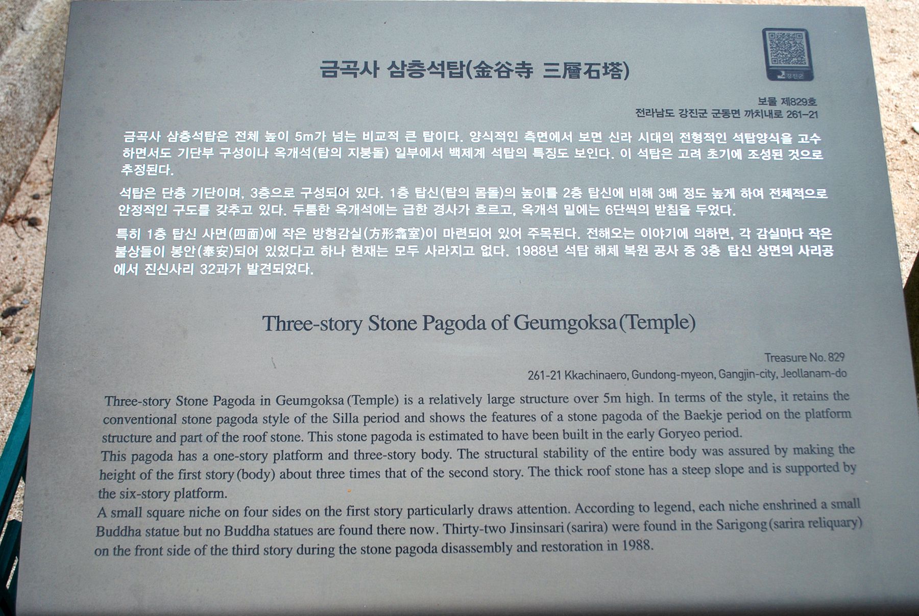 1988년 6월에 해체하여 복원할 때 석가세존 진신사리 32과가 발견되어 세상의 이목을 받기도 했습니다.