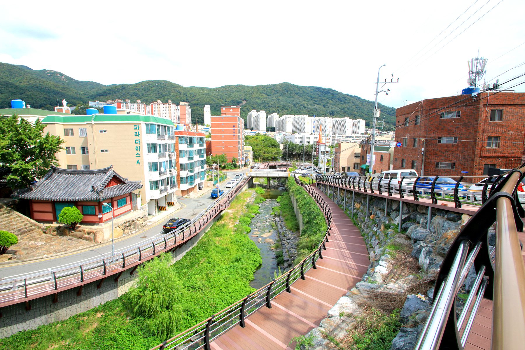 주변 은하사와 신어산을 등산하고 내려오는 분들이 이어지는 신어천 산책로를 따라 걸으며