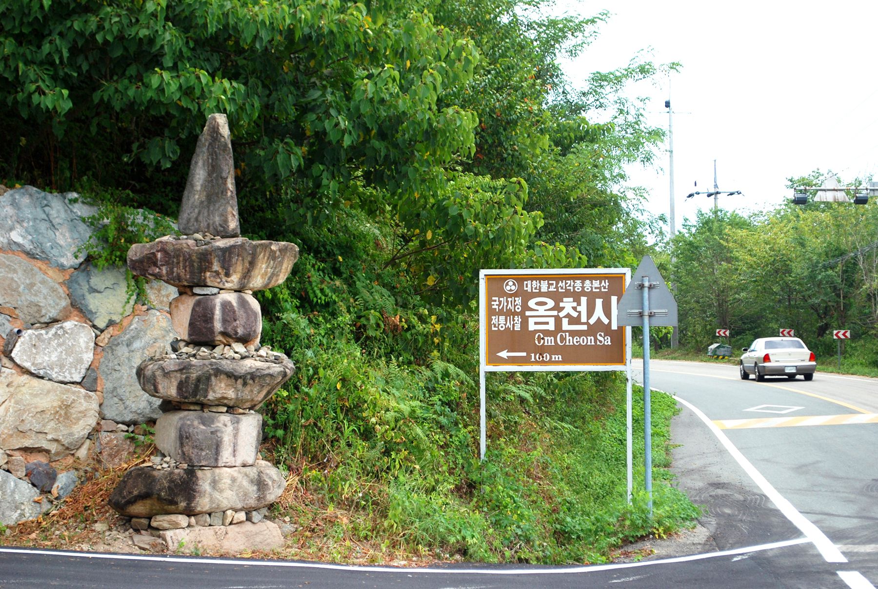 입구부터 남다른 옴천사는 일주문을 지나 경내에 들어가는 길에 많은 돌탑들이 자리하고 있으며