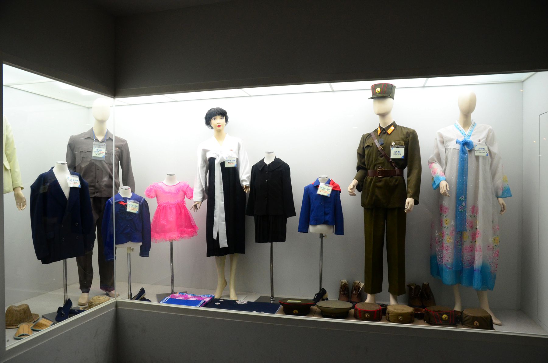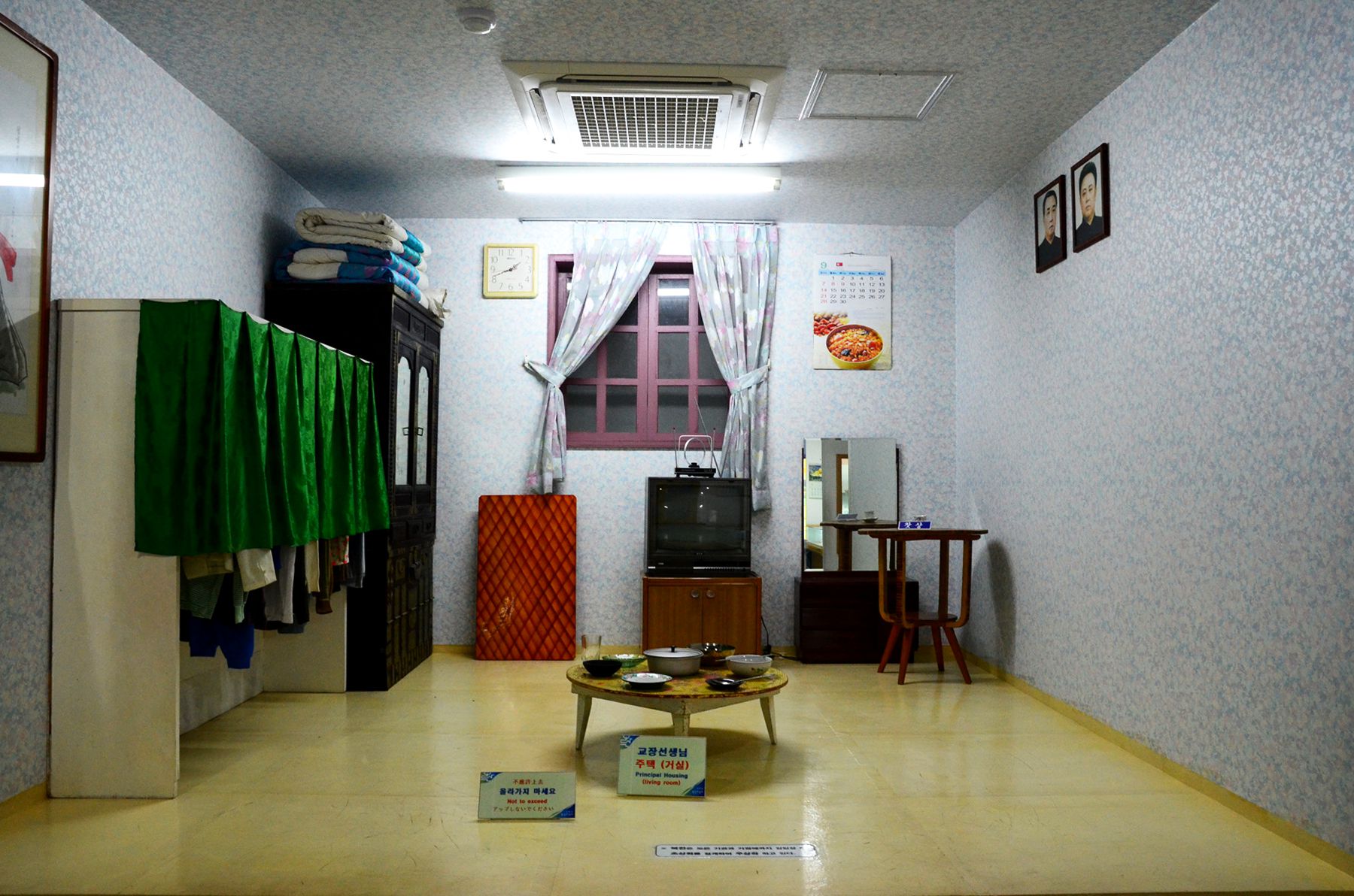 옷과 티비 탁자등 생활용품 진열과 김일성 부자 초상화까지 걸려있는 모습이네요.