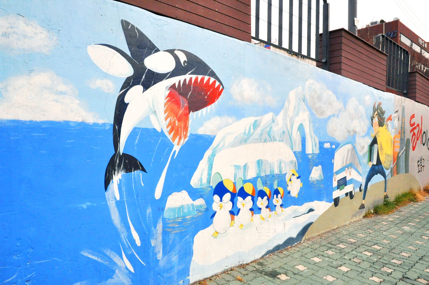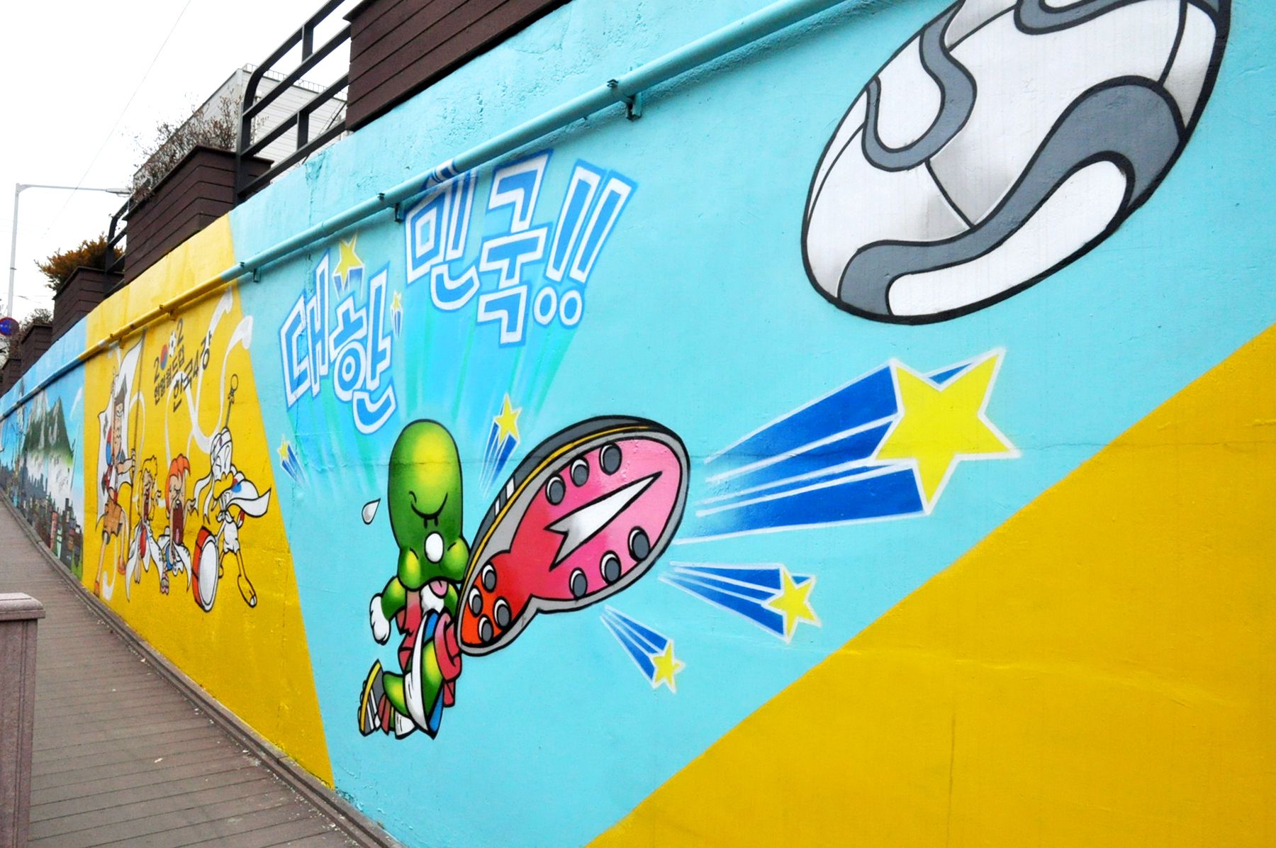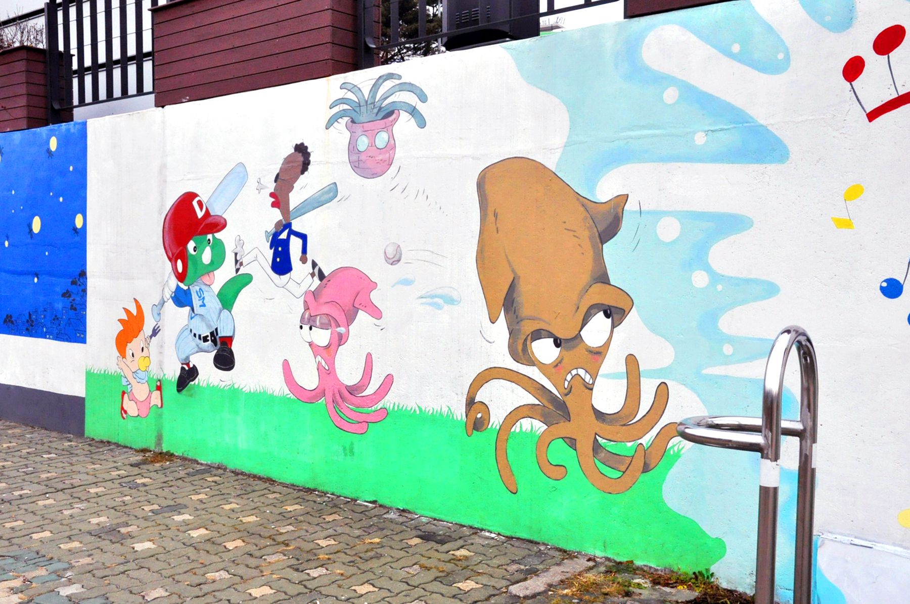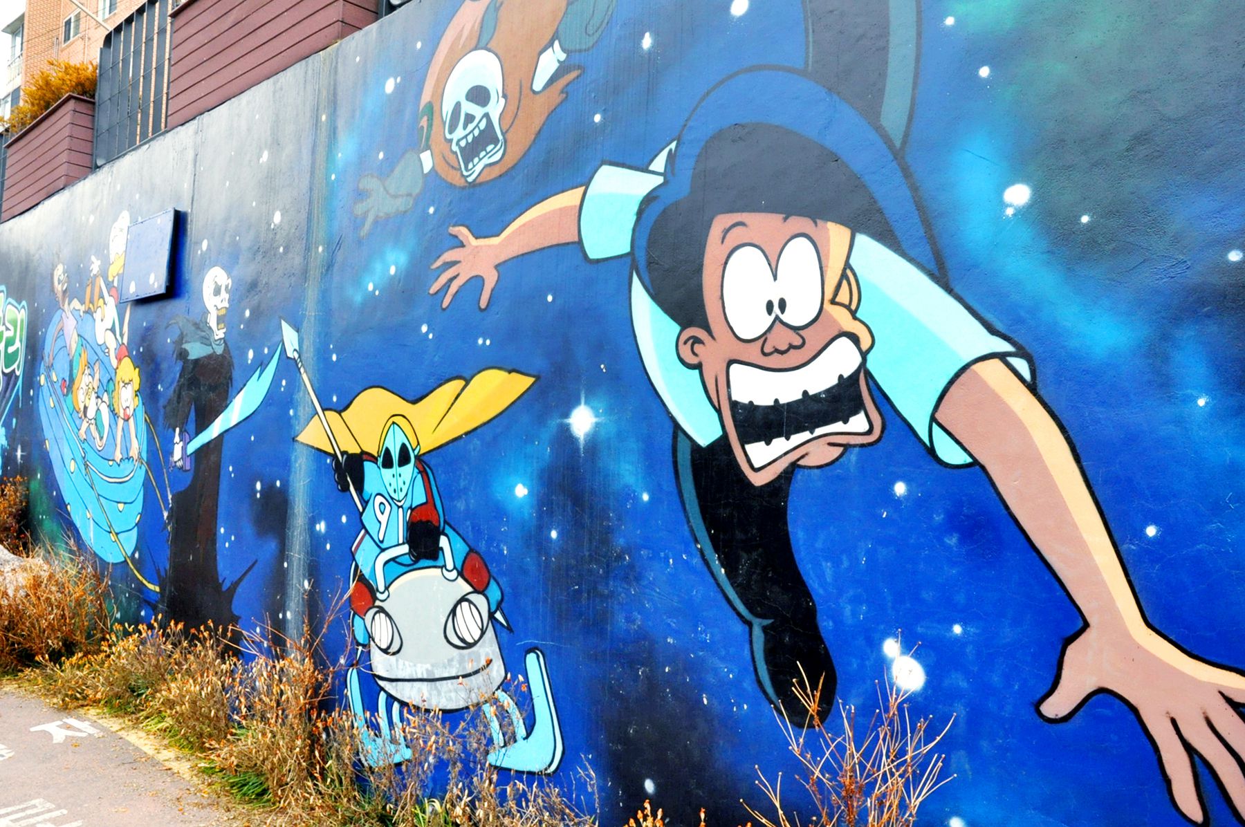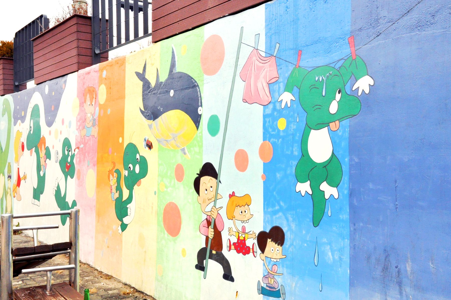 둘리 벽화가 스프레이 페인트를 이용한 그래피티 방식으로 조성되어 둘리와 친구들의 좌충우돌 모험기가