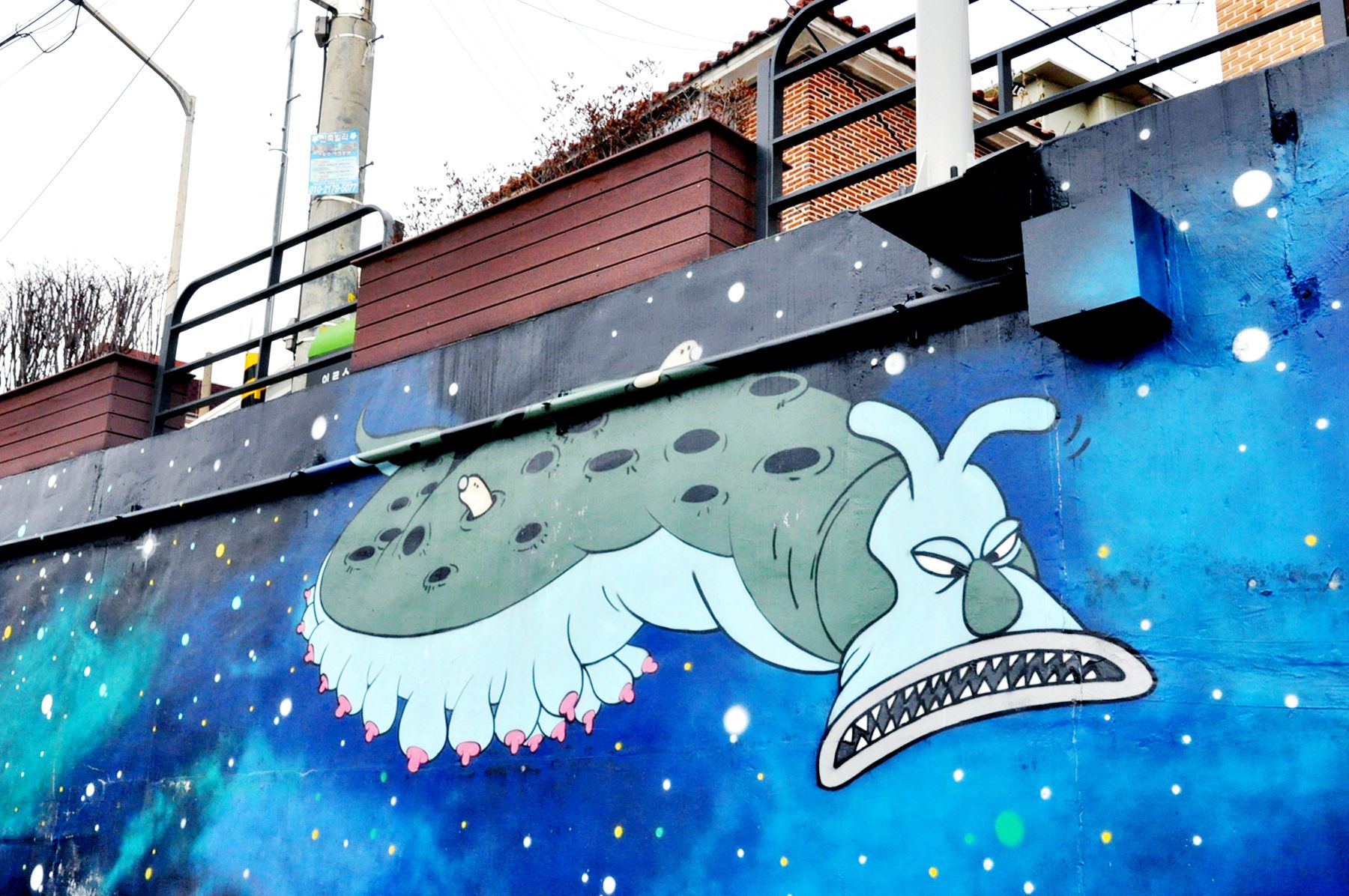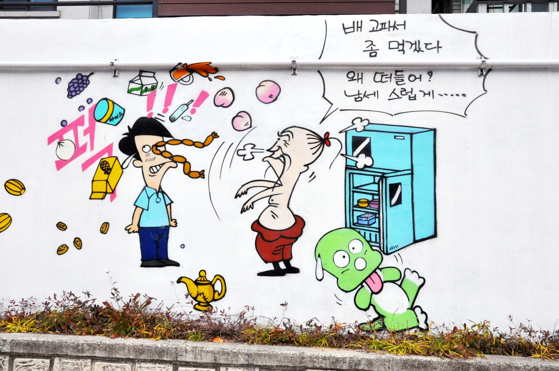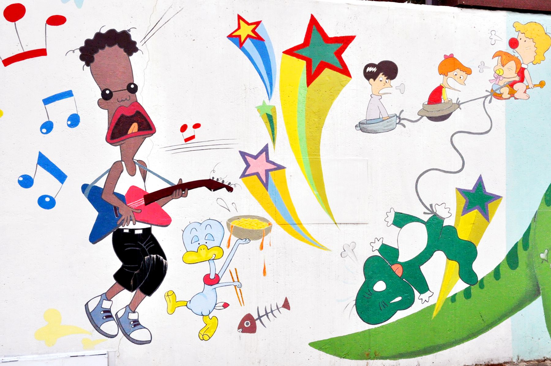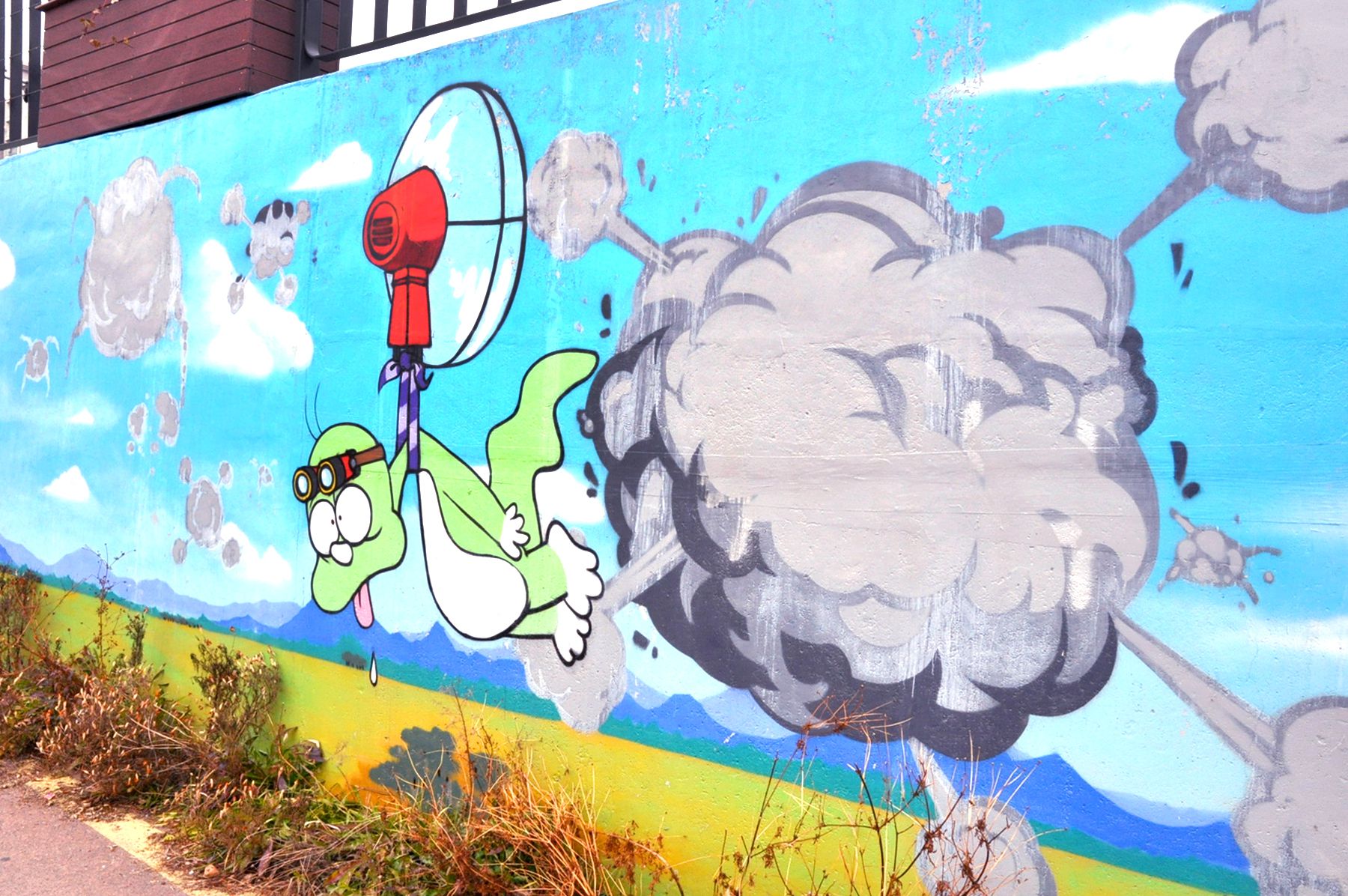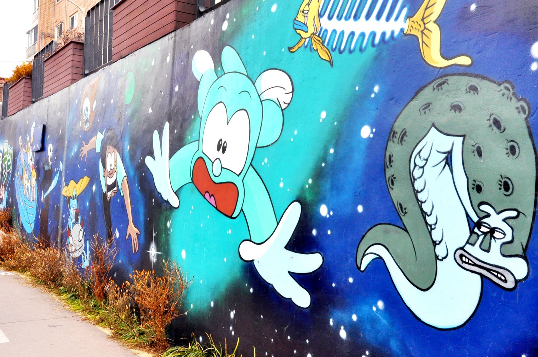 둘리 벽화가 스프레이 페인트를 이용한 그래피티 방식으로 조성되어 둘리와 친구들의 좌충우돌 모험기가