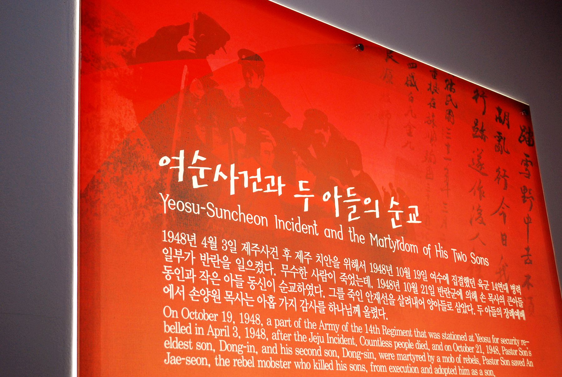 손양원 목사님의 용서를 볼 수 있는 큰 사건인 1948년도에 일어났던 여수반란사건에 대한 내용도 살펴볼 수 있습니다.