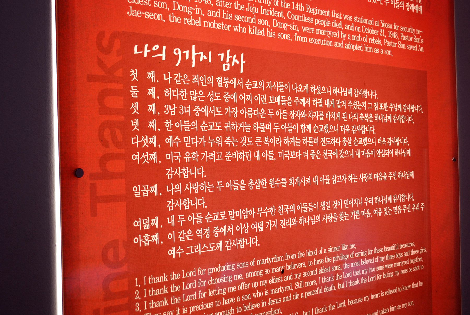 당시 9가지의 기도글 또한 전시되고 있으며 아들을 잃은 슬픔만큼 용서와 사랑으로 더욱 평화적인 세상을 만들고자 하셨던 손양원 목사님의 진심이 많은 사람들의 눈물샘을 자극했다고 하는데요,