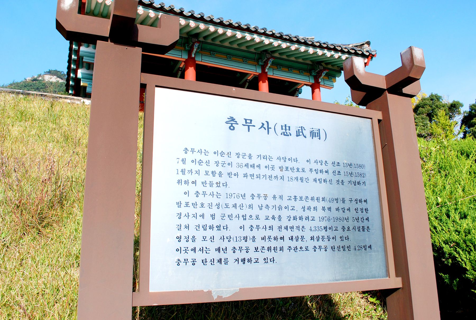 충무사는 충무공 이순신을 기리기 위해 건립한 사당으로 도제산의 남쪽 기슭 이순신이 수군 만호로 재직했던 고흥 발포만호성의 성곽 북벽 근처에 1976년부터 1980년까지 5년에 걸쳐 조성되었는데요,