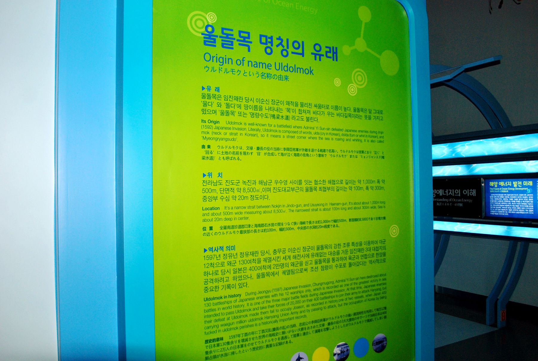 세계적으로 조류가 빠른 지역으로써 조류발전의 후보지로 각광받고 있는 울둘목에 대한 자세한 내용도 알아볼 수 있습니다.