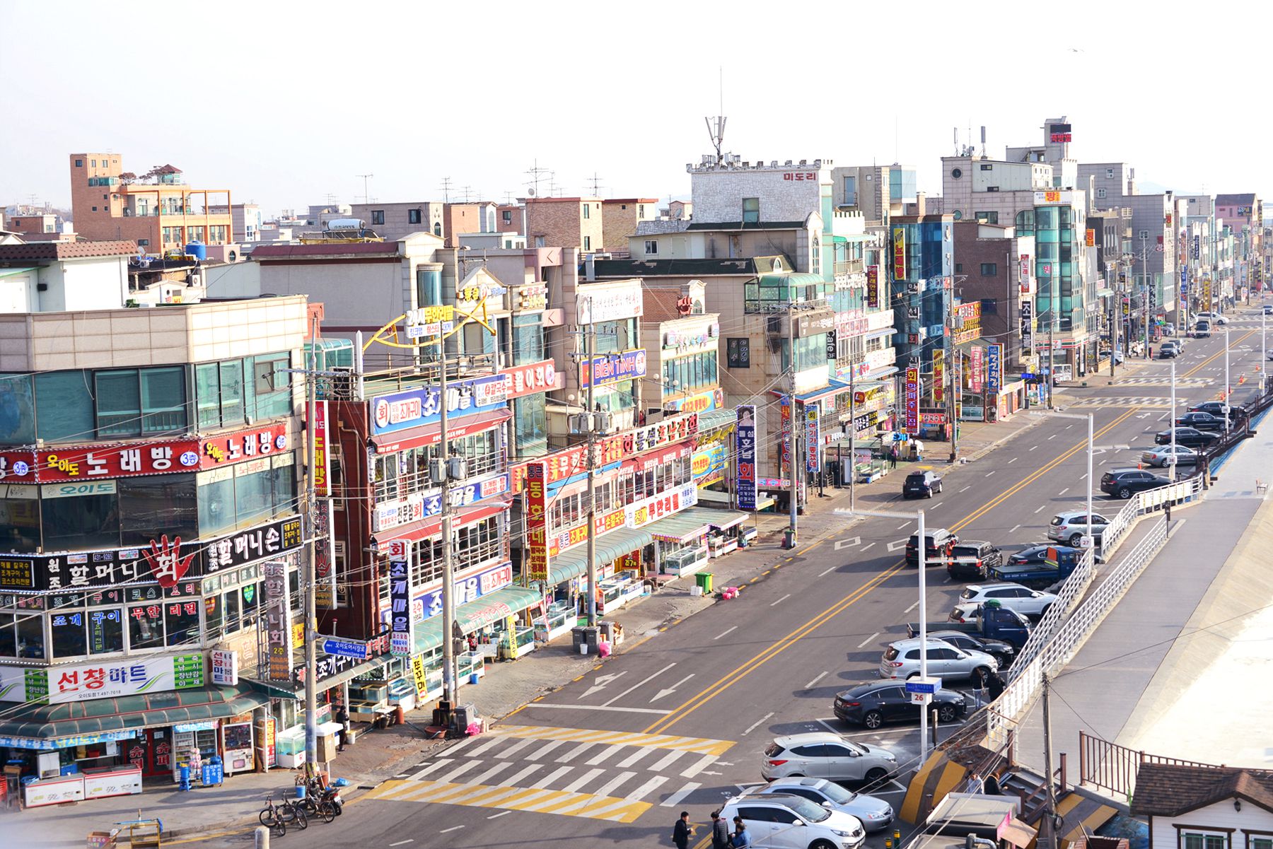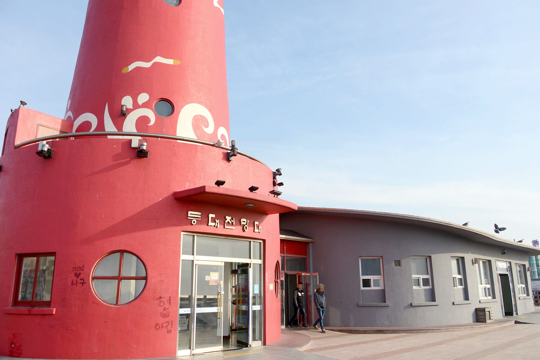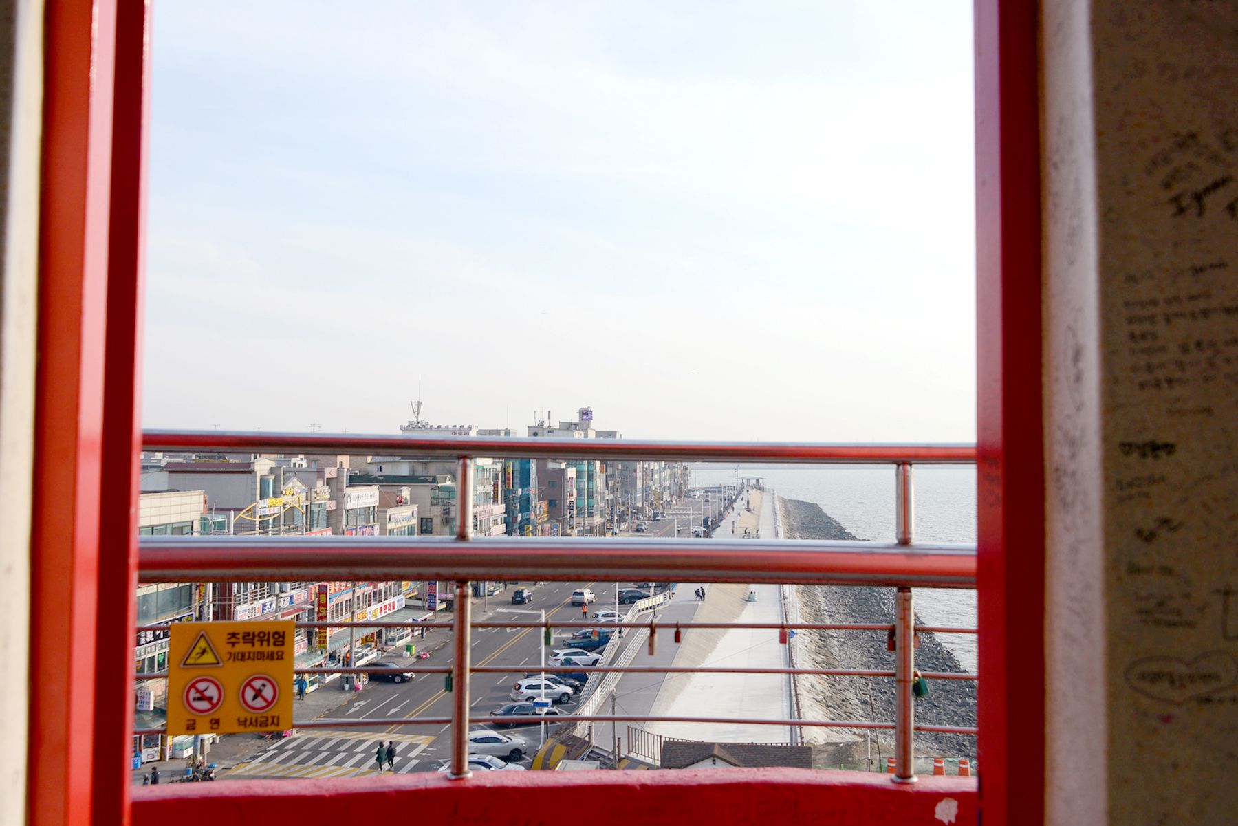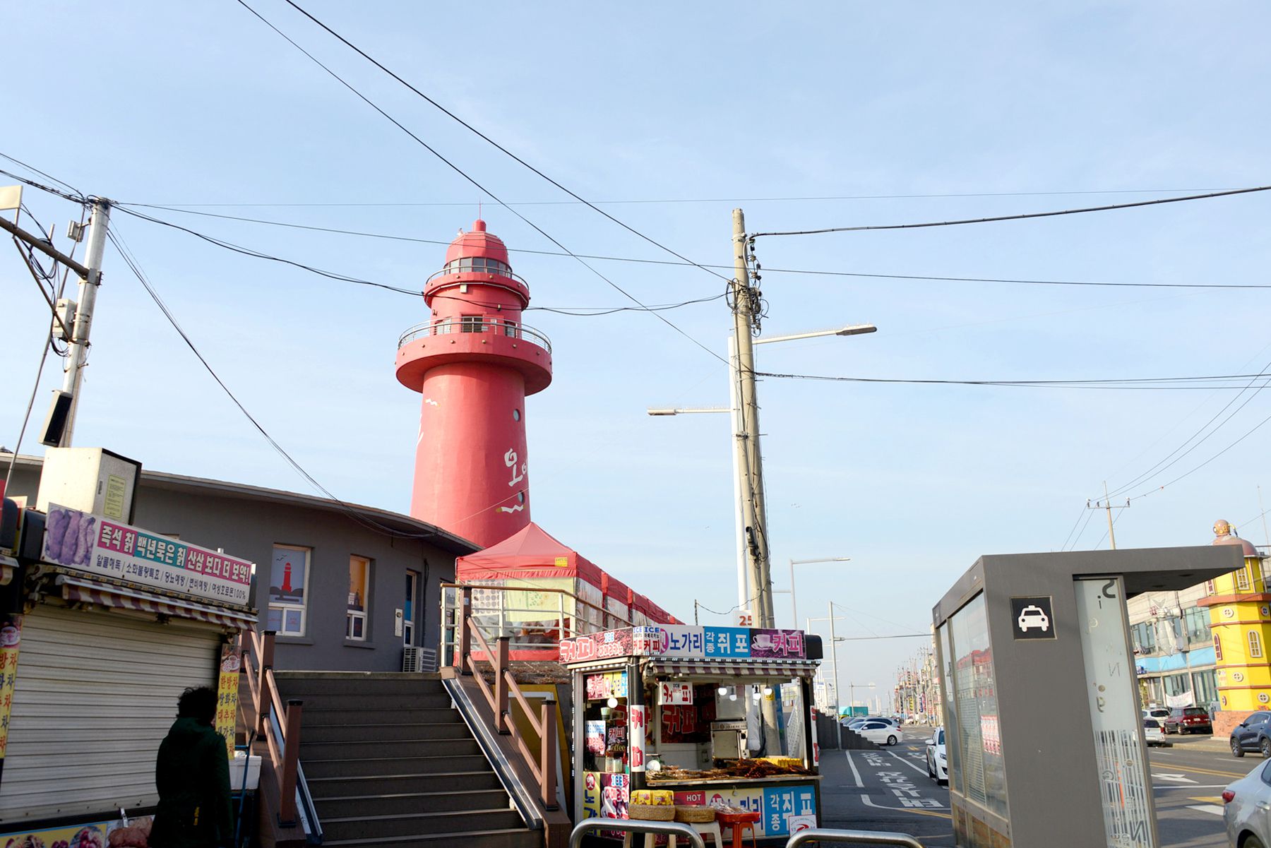 빨강등대 전망대에 오르면 조개구이 가게들이 즐비한 거리와 물이 빠진 갯벌이 드러난 바다,