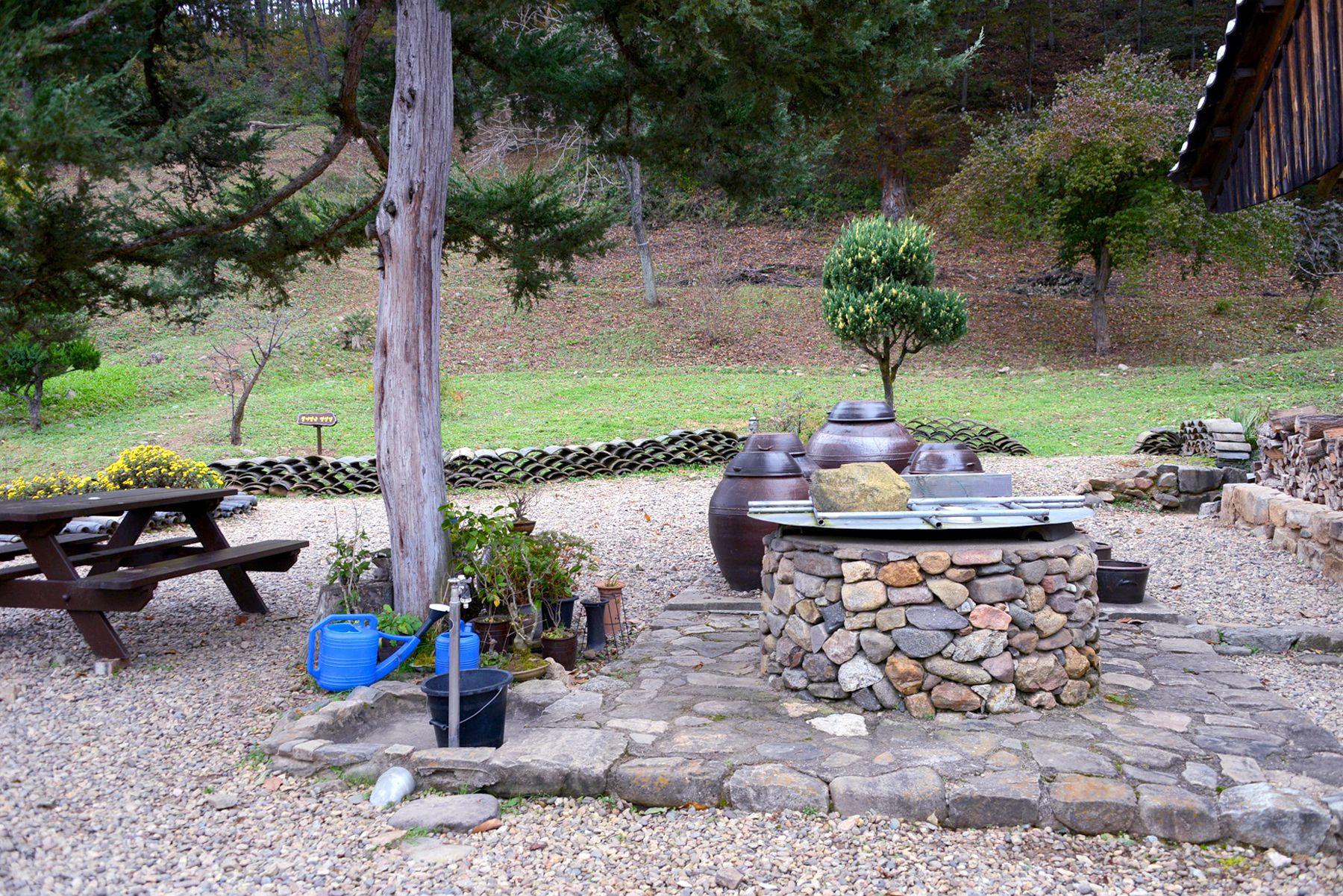 소나무 자연 속에서 심신을 편안히 할 수 있는 곳으로 한옥스테이와 더불어 뒷산 철기장군 명상길, 야외 피크닉 테이블, 원목의자 비치, 텃밭 야채 이용 등