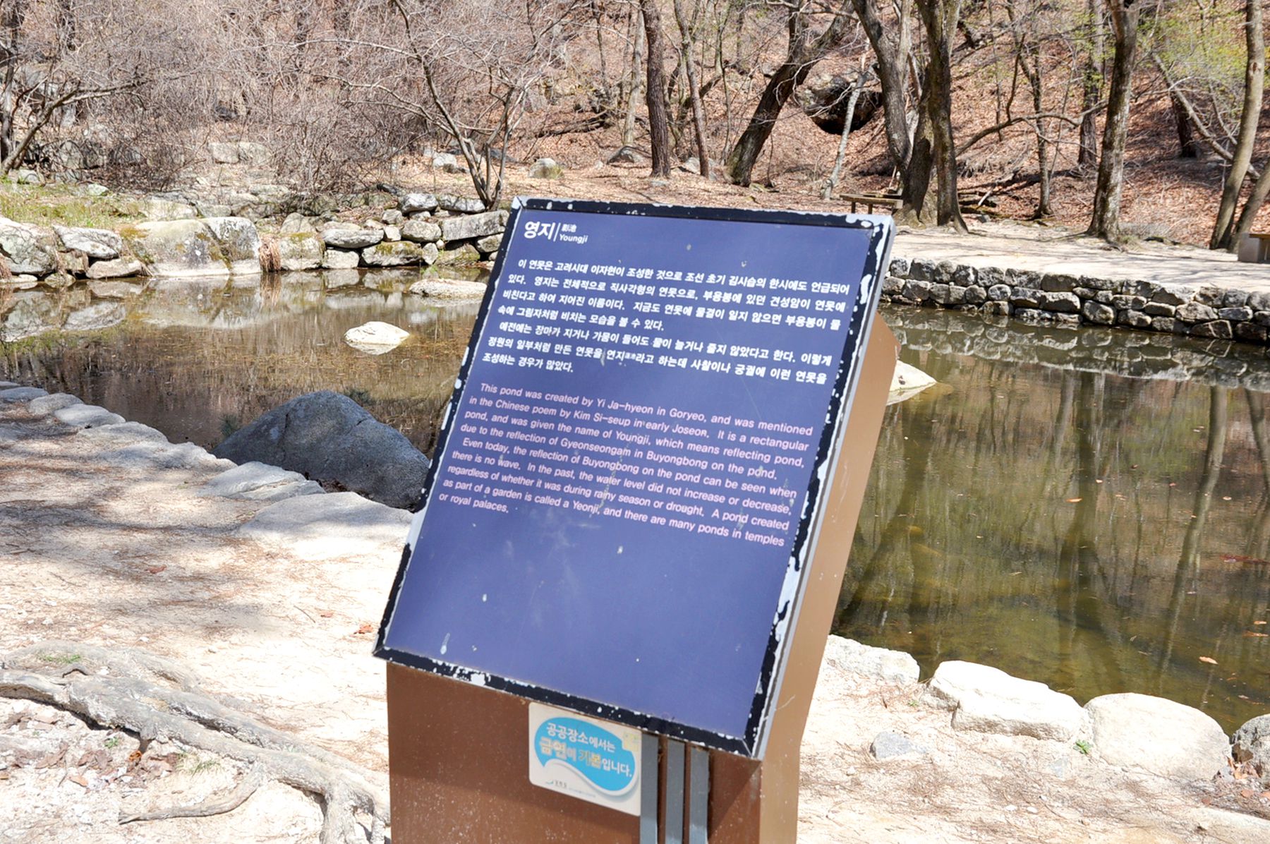 이 영지는 이자현이 고려시대에 조성한 것으로 연못 가운데는 삼신산을 상징하는 세개의 큰 돌이 놓여져 있으며