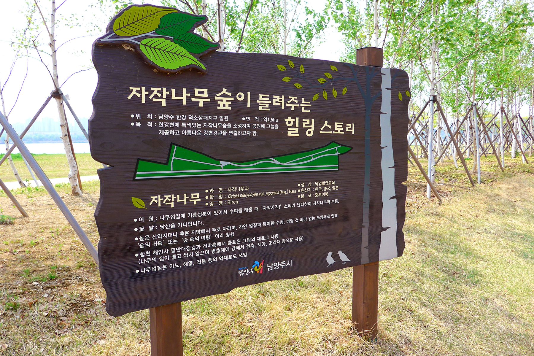 한강변의 특색있는 자작나무숲에서 그늘을 제공하고 아름다운 강변 경관을 연출함으로써 힐링의 시간을 갖기 좋아 특히 연인들의 데이트 장소로 인기만점이랍니다.