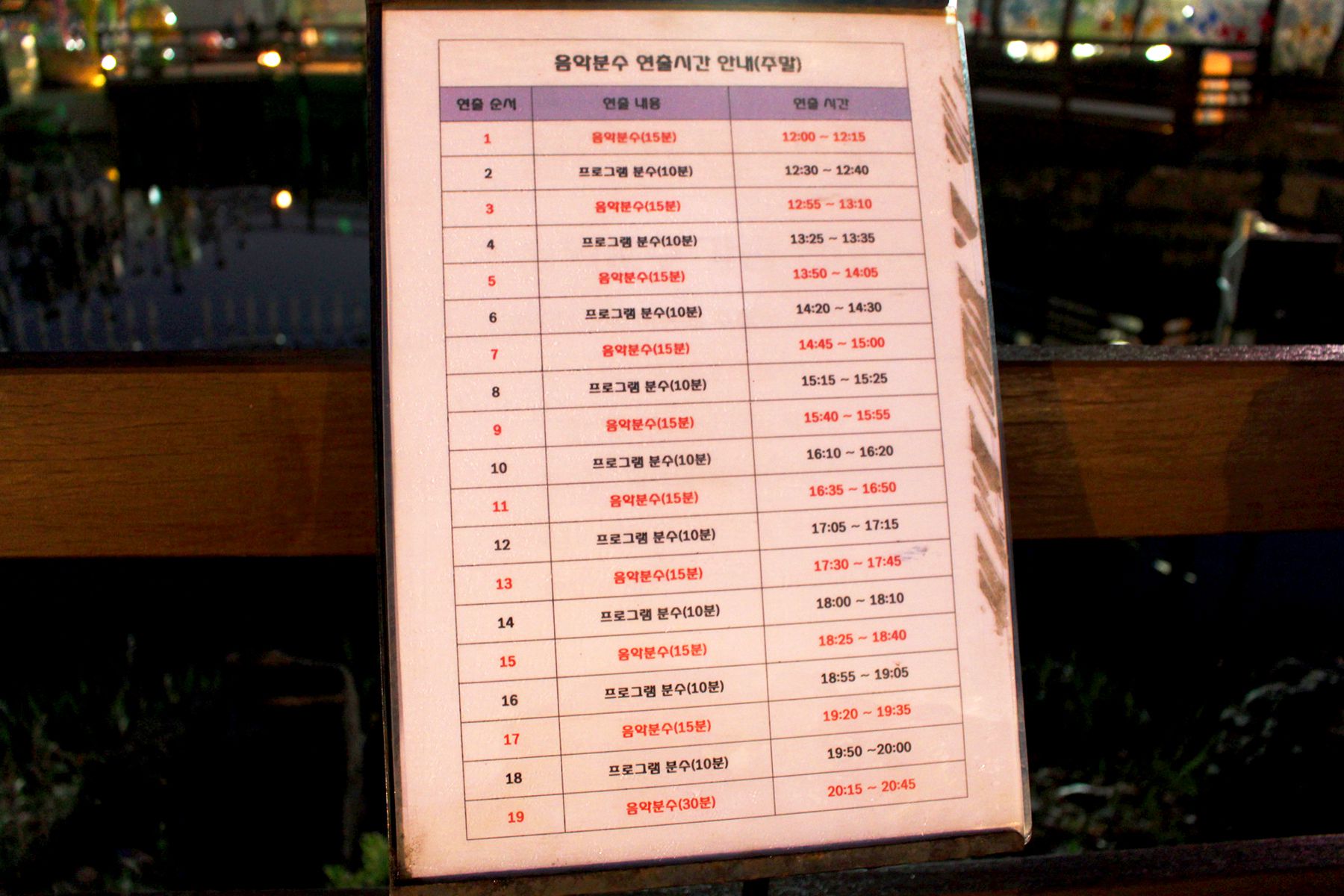 프로그램분수는 10분, 음악분수는 15분동안 즐길 수 있으며, 시간이 정해져있으니 참고하시길 바랍니다.