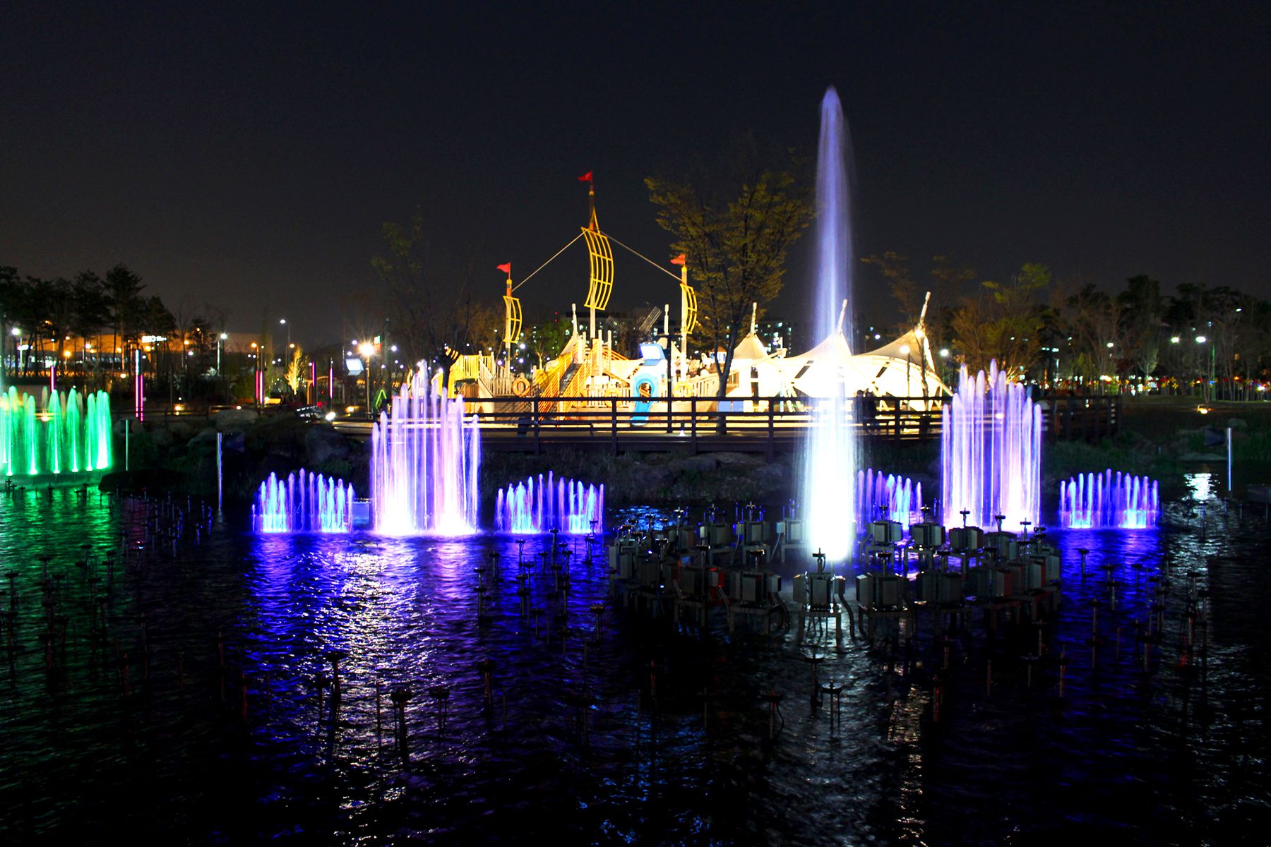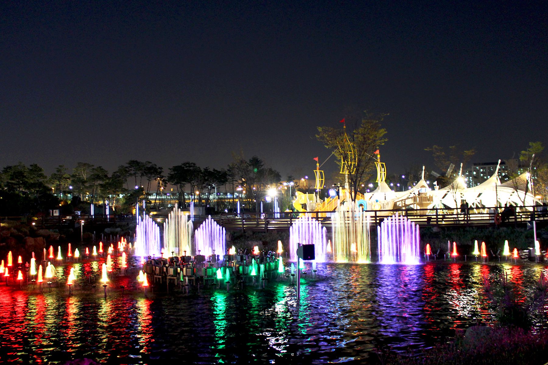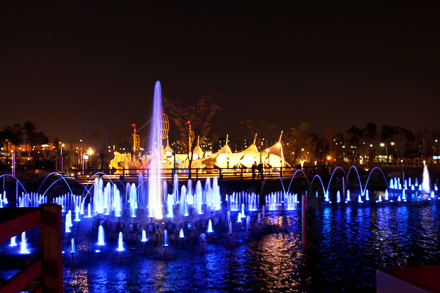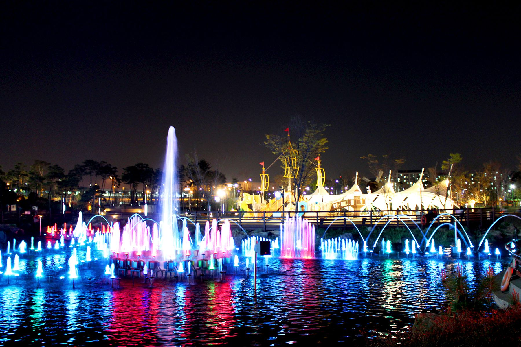 화려한 조명빛과 함께 시원한 물줄기를 뿜어내는 레이크파크는 휴식과 함께 달콤한 분위기를 연출한답니다.