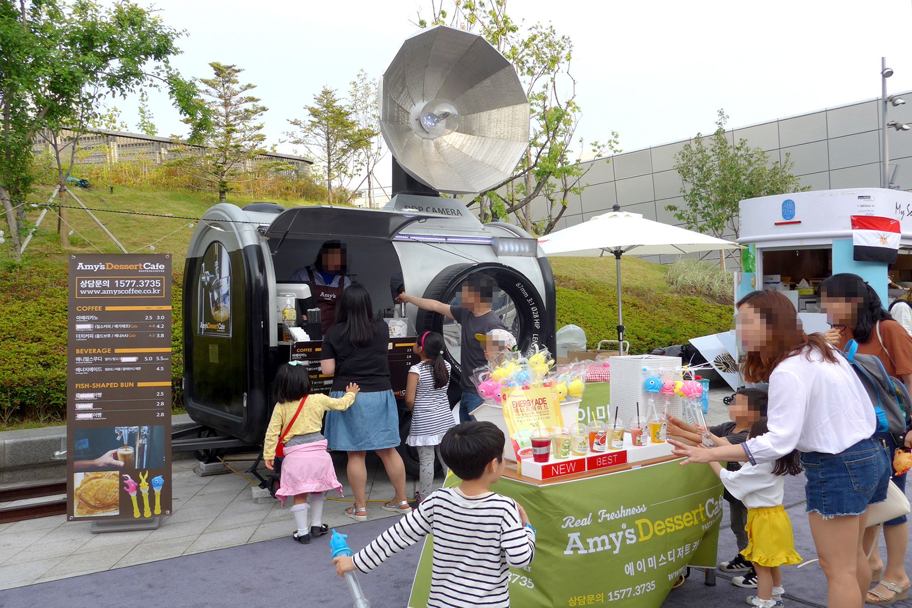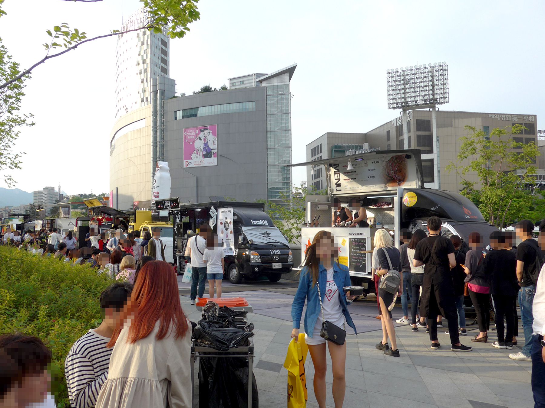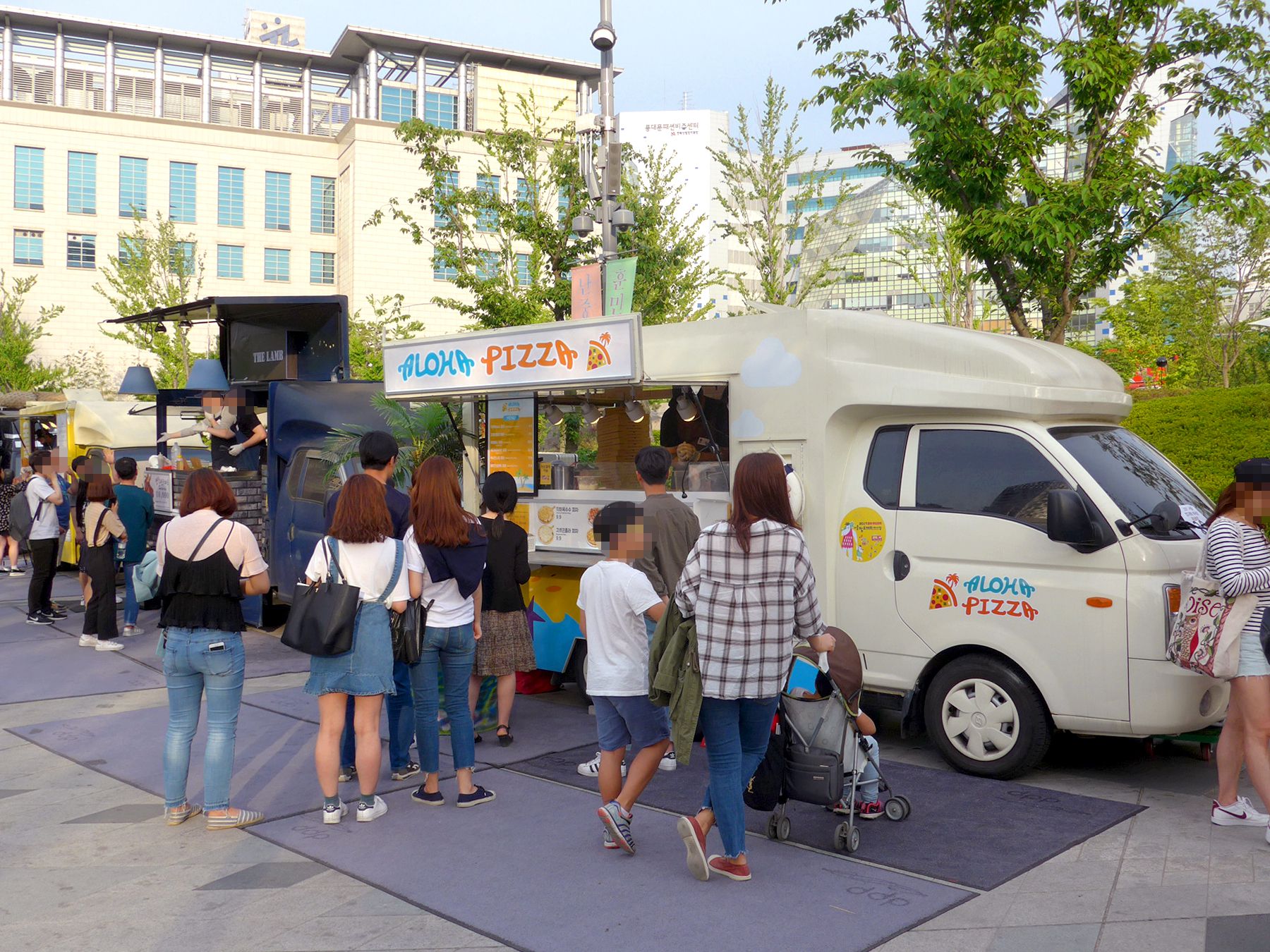 멋스러운 공간들 속 의자가 있는 곳이면 어디든지 사람들이 월드푸드트럭의 음식을 즐기고 있으며,