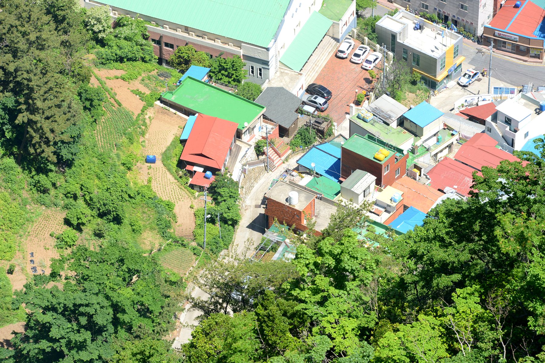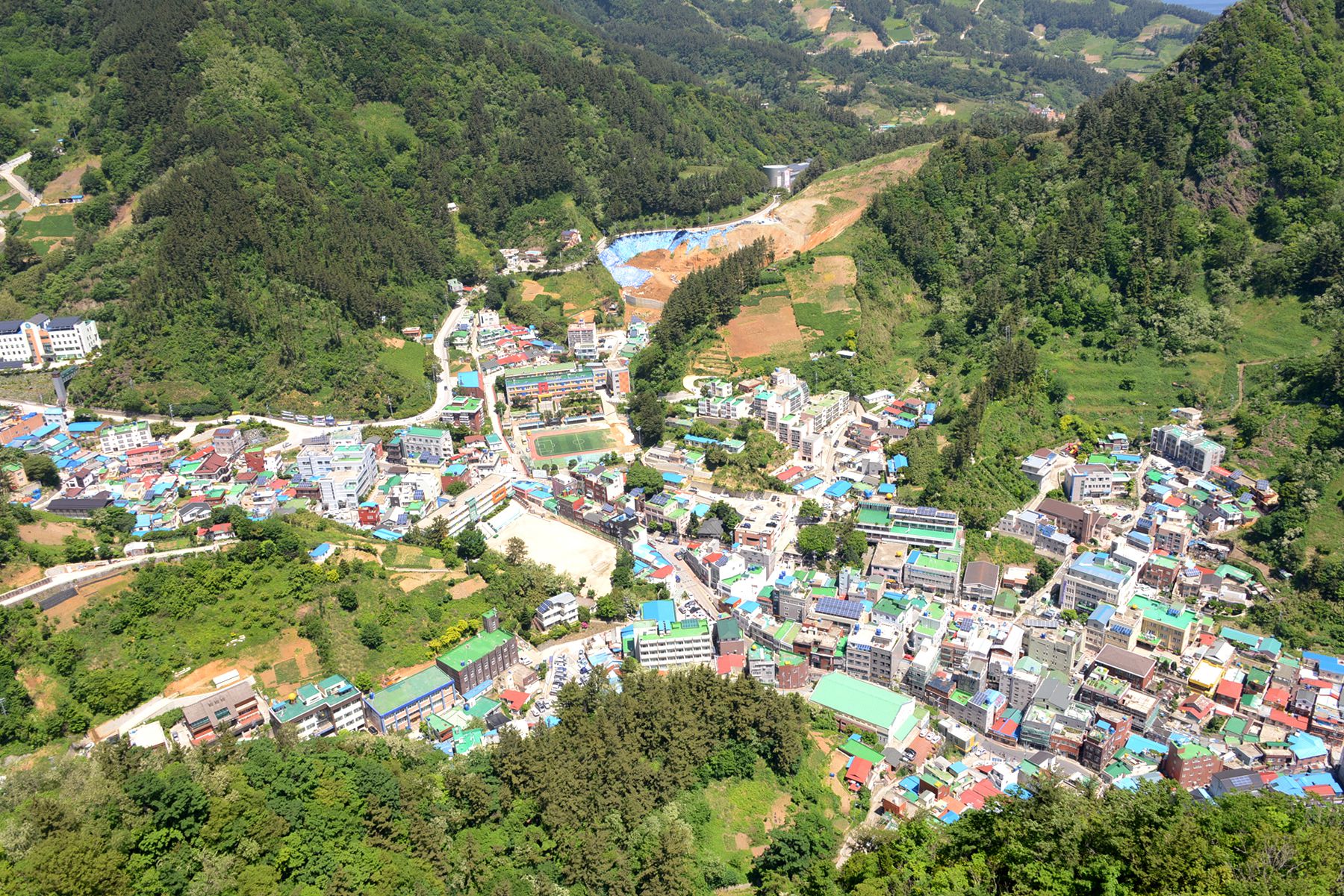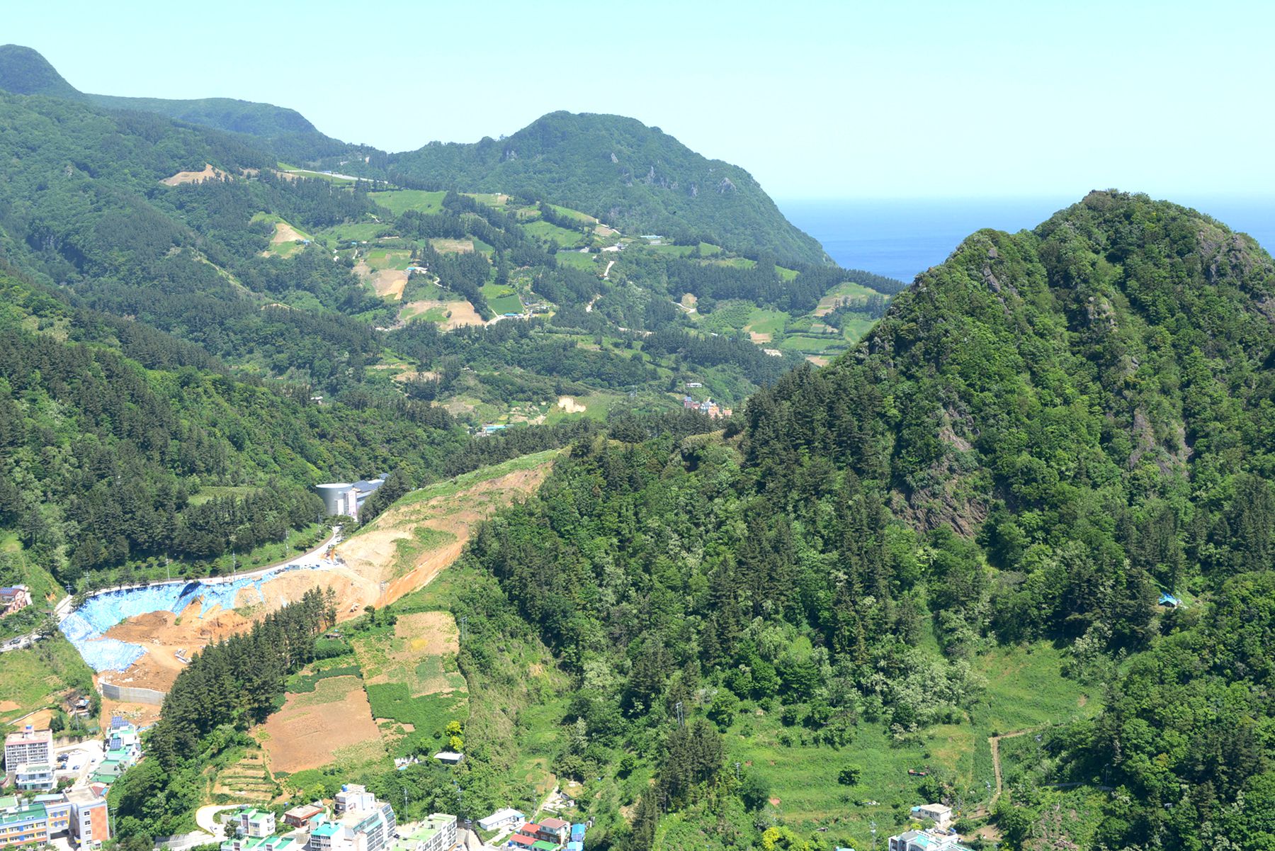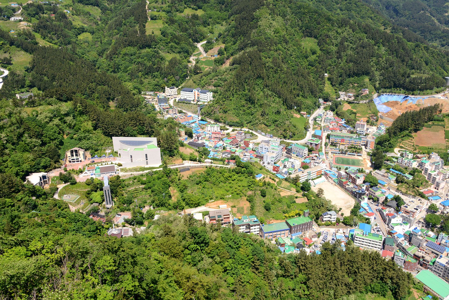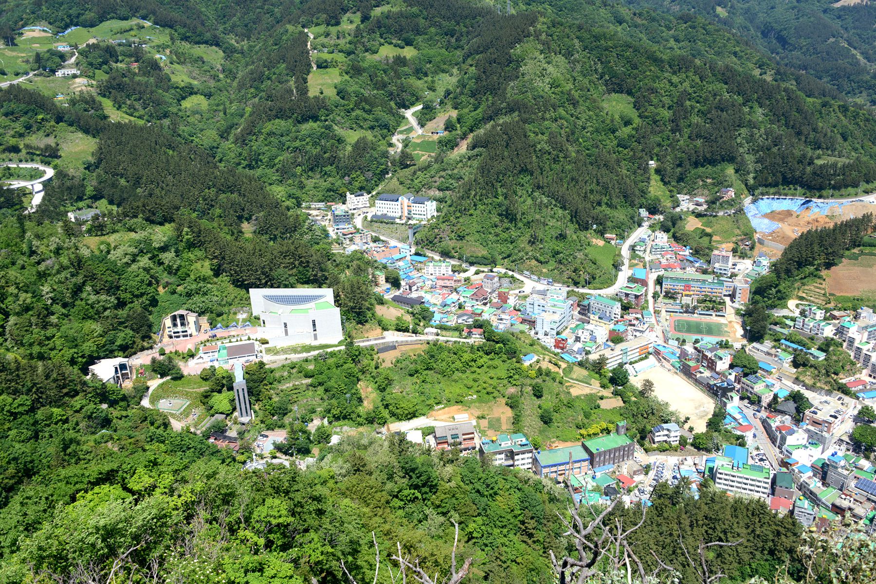 시가지전망대 정상에서는 울릉도 시가지가 한눈에 내려다보이며 집과 도로, 축구장 등 여러 건물도 작게 보인답니다.