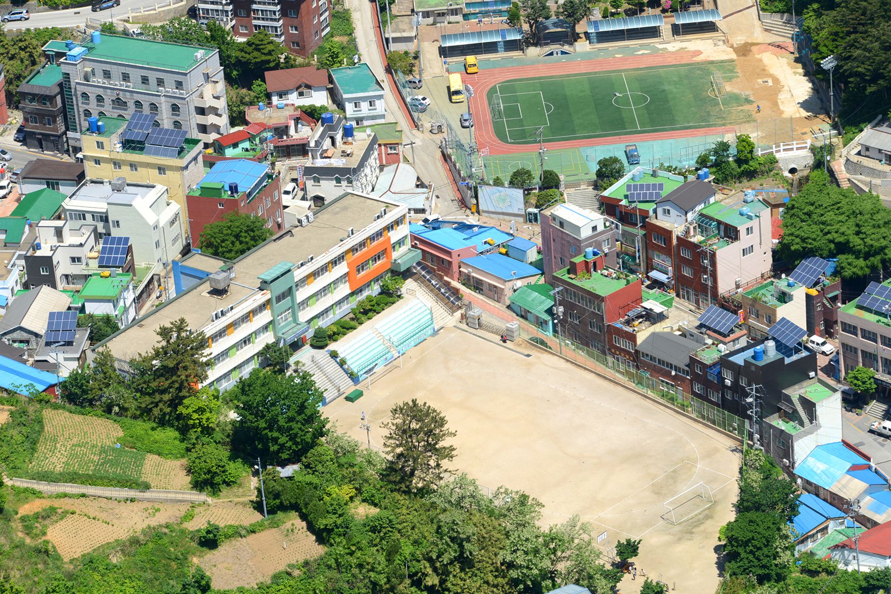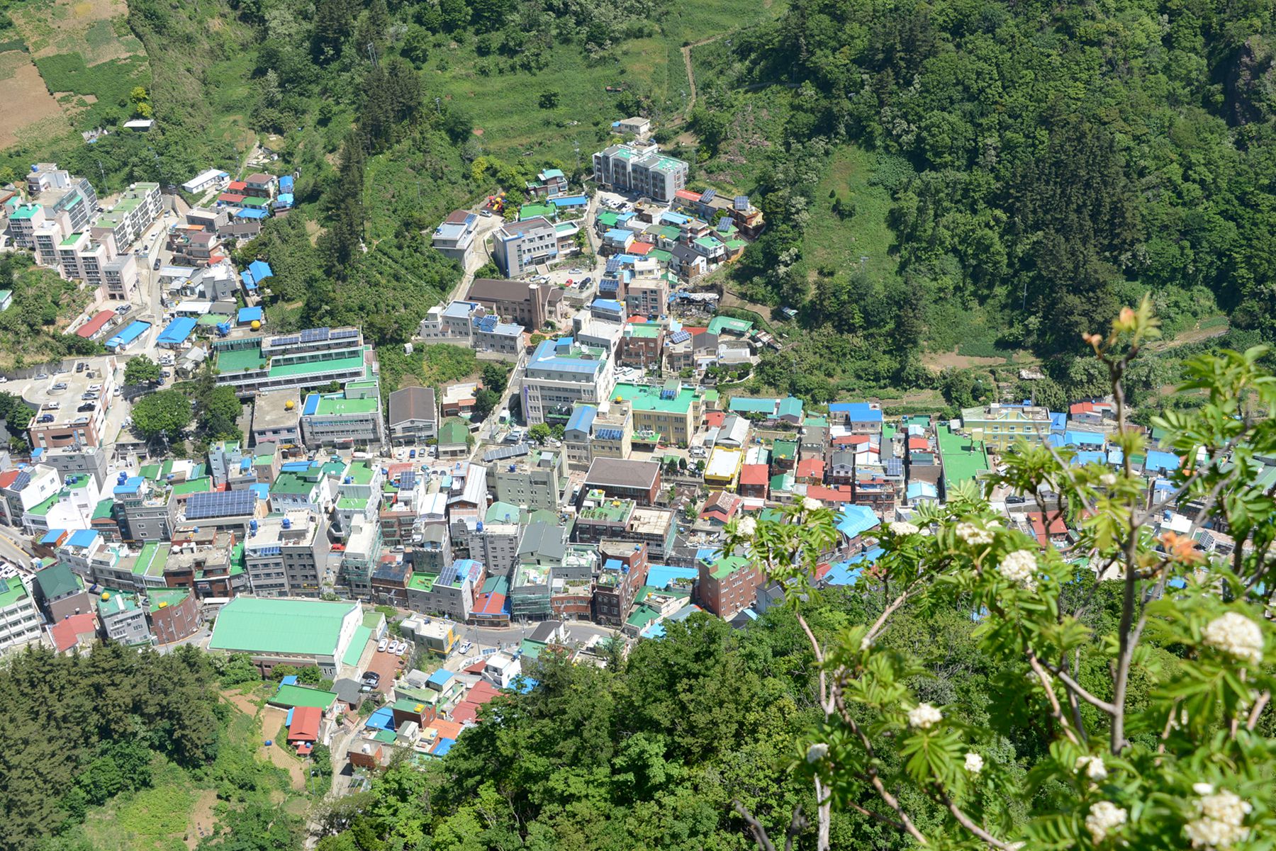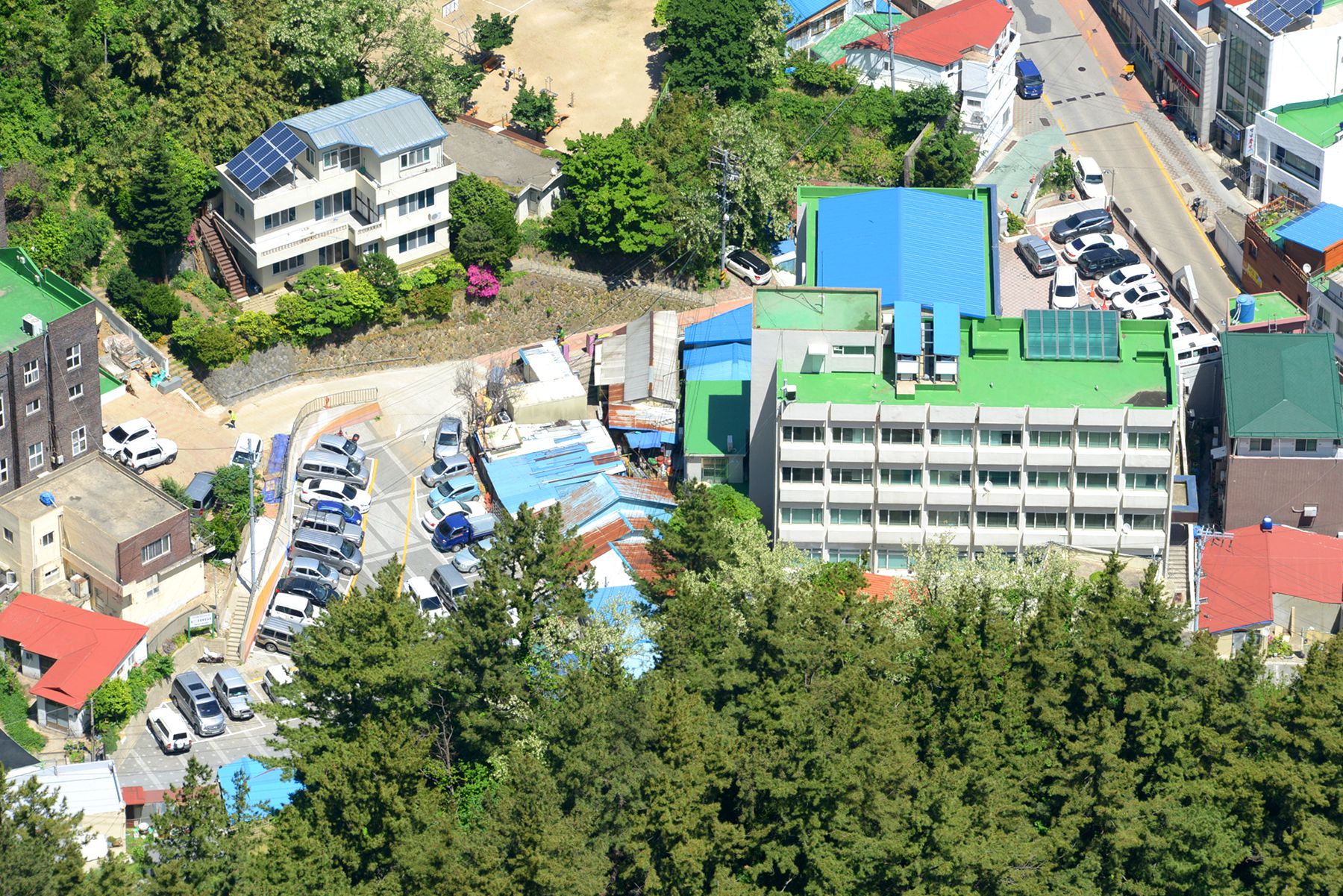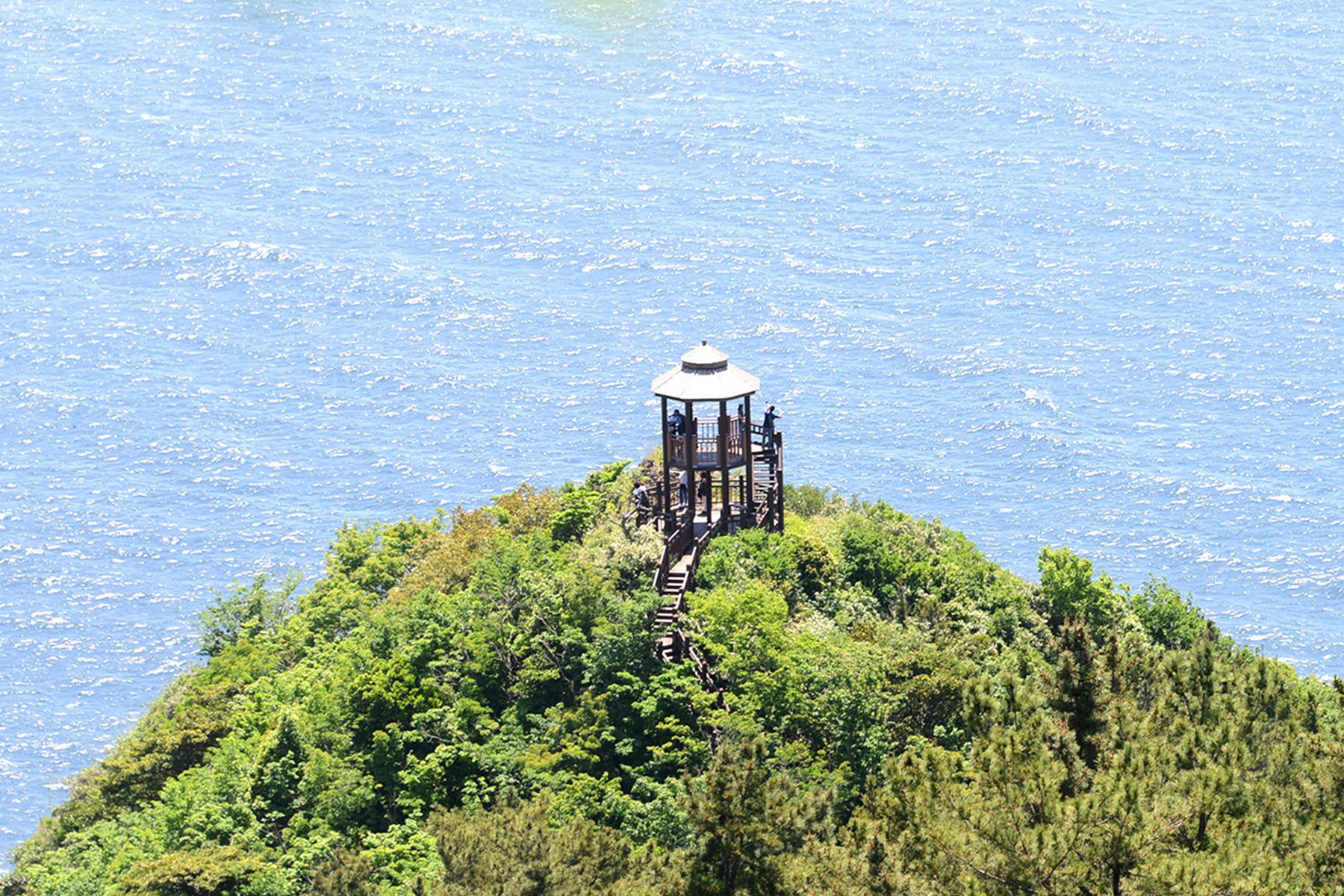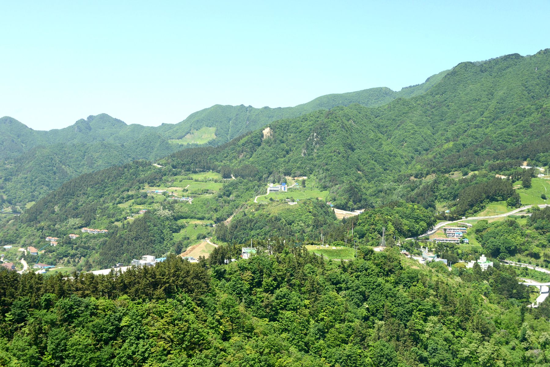 시가지전망대 정상에서는 울릉도 시가지가 한눈에 내려다보이며 집과 도로, 축구장 등 여러 건물도 작게 보인답니다.