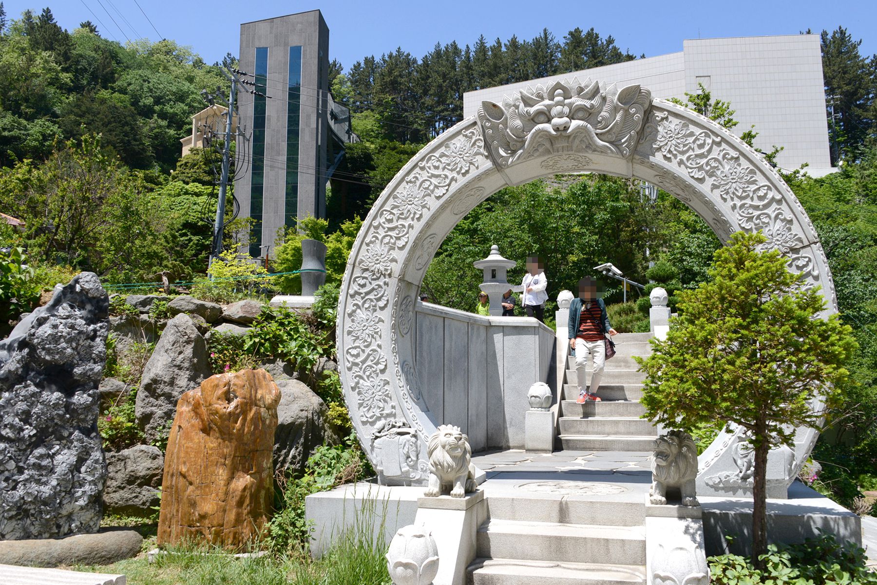 입구에서 왼편으로 보면 해수관음상을 볼 수 있으며, 원통형의 석조조형물 뒤로 전각의 배치가 매우 이색적인 분위기를 자아내고 있답니다.