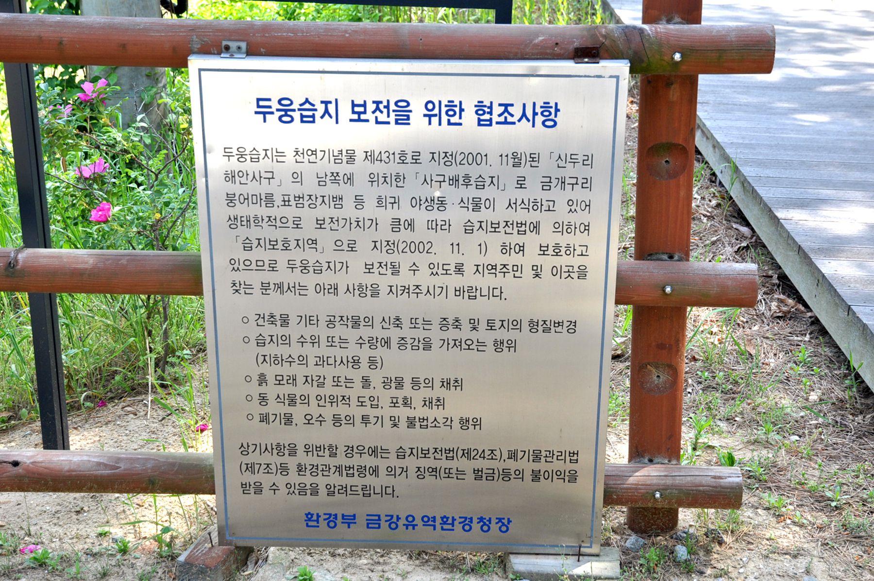 두웅습지는 신두리해안사구가 2001년 천연기념물 제431호로 지정된 이후 2002년 사구습지로는 국내에서 처음으로 습지보호지역으로 지정되었고,