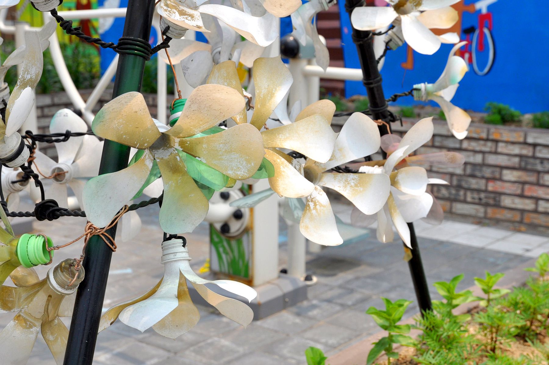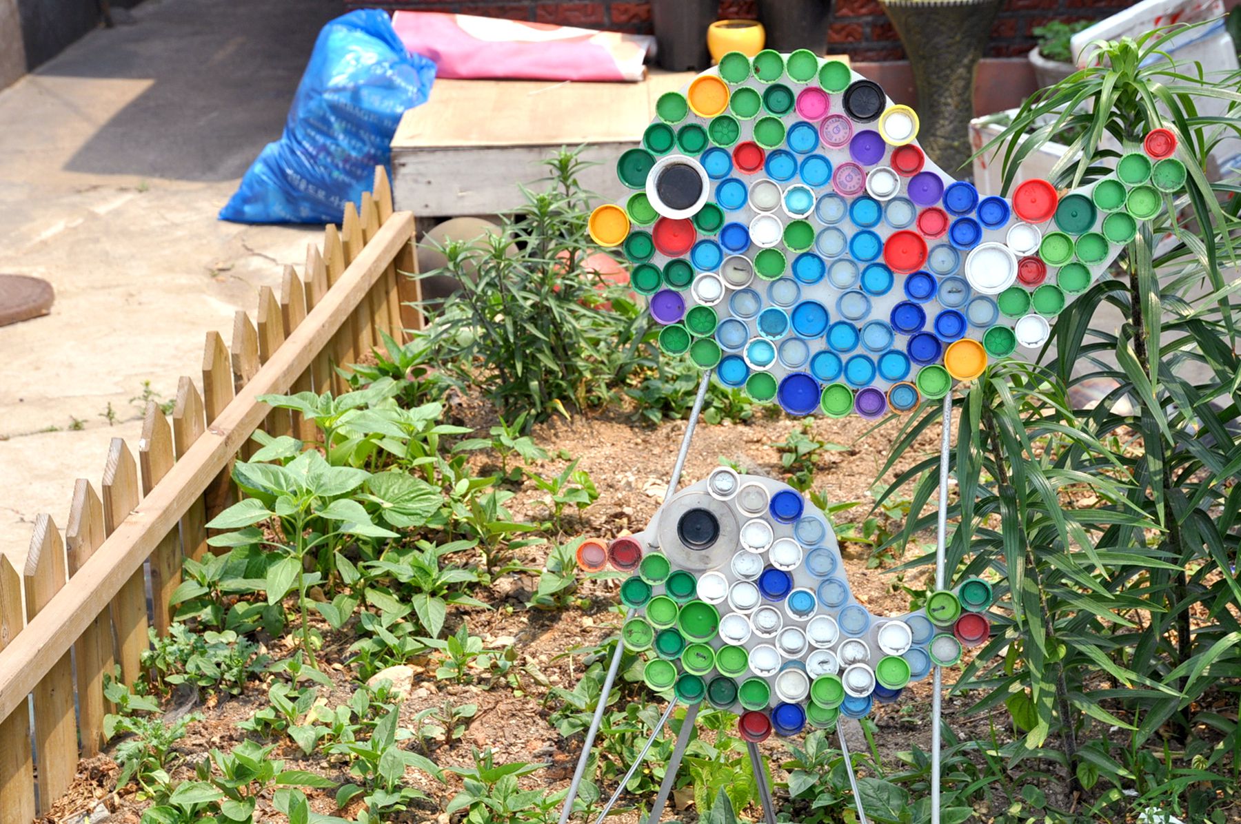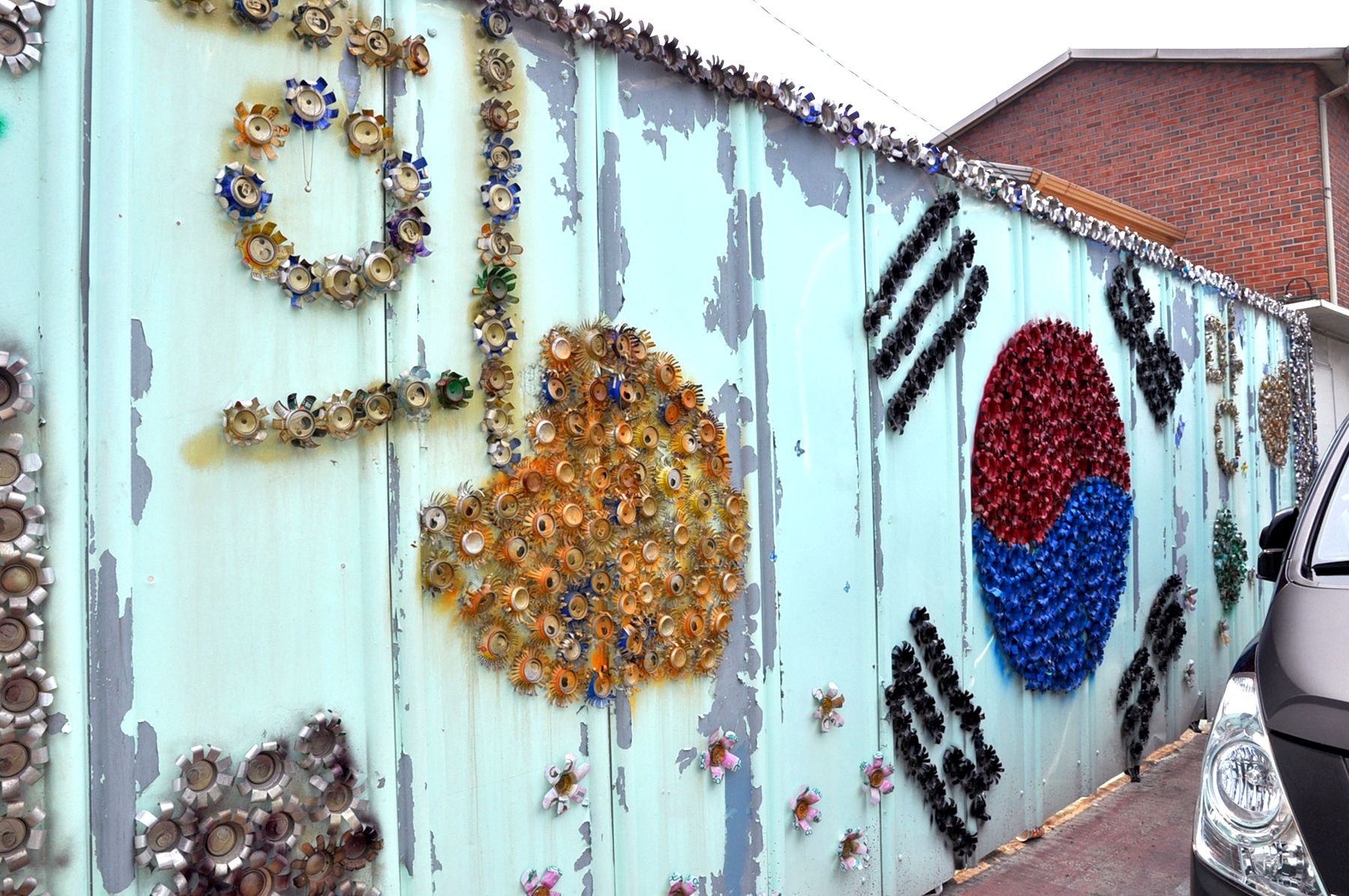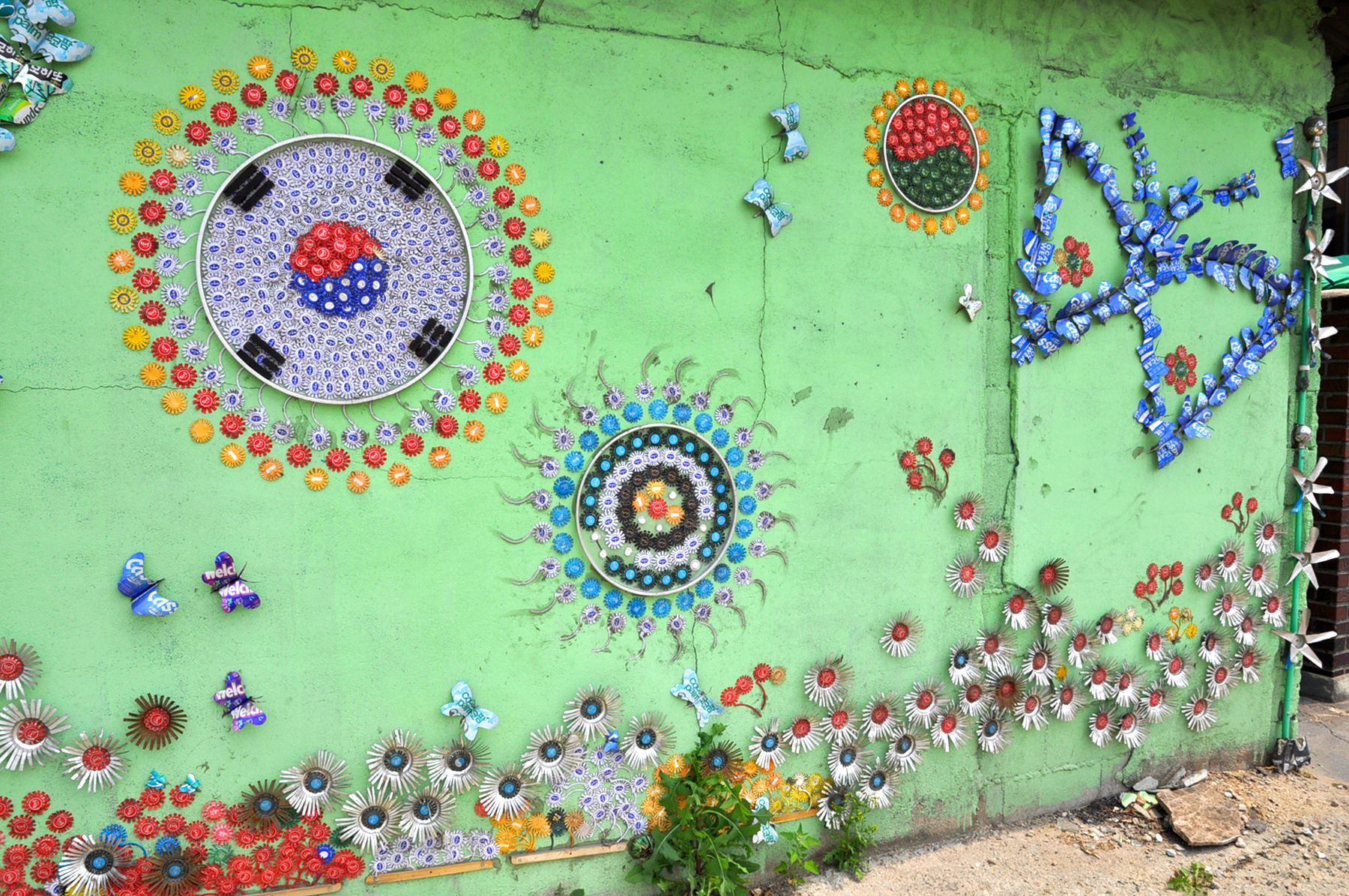 마을 입구에는 재활용품 캔을 이용하여 대형 태극기를 만들어놓았고, 병뚜껑으로 조형물을 만들어 놓은 벽화도 만나볼 수 있습니다.