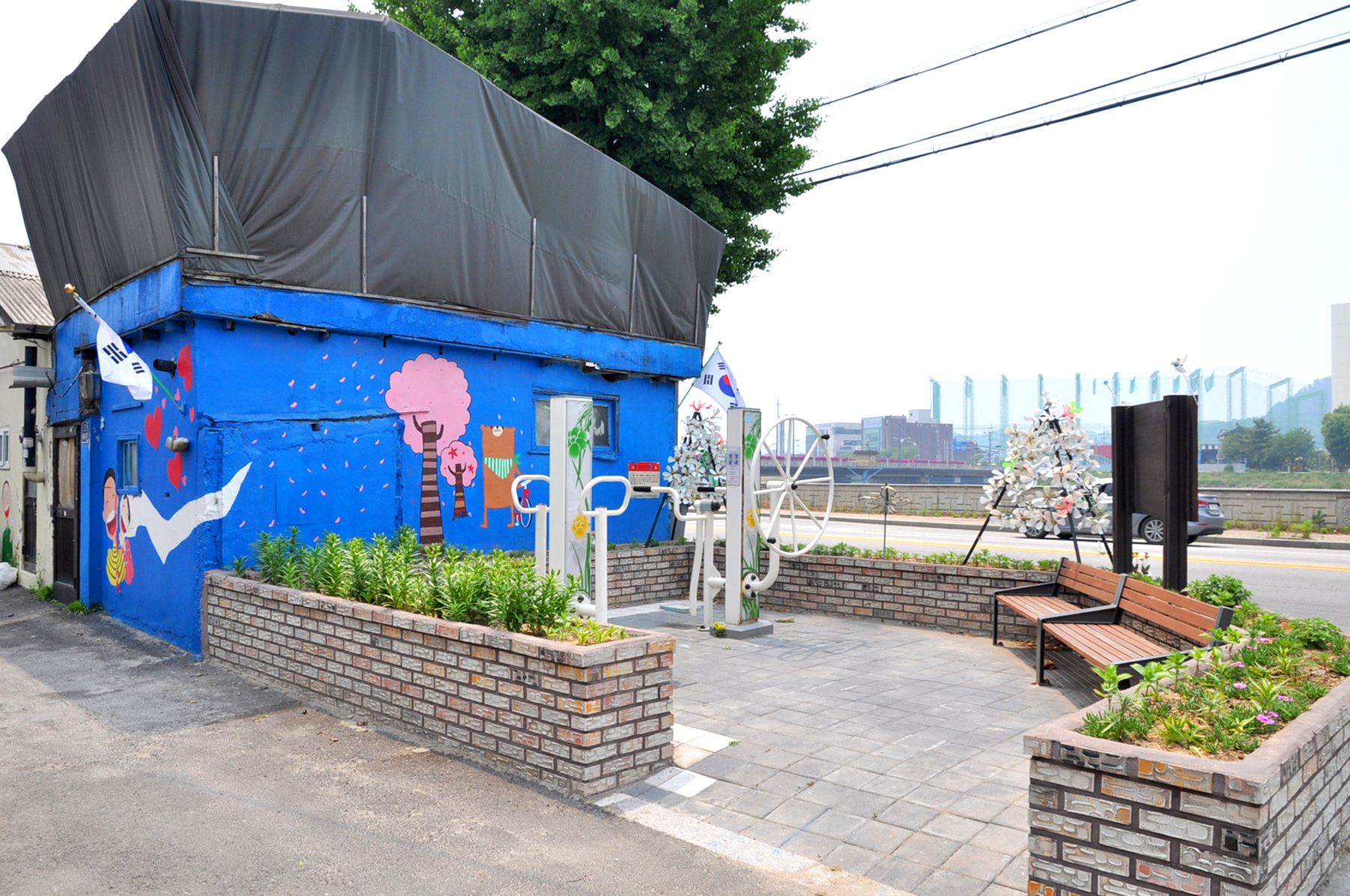 운동기구가 있는 소공원 또한 벽화와 조형물이 설치되어 있으며, 태극기도 걸려있답니다.
